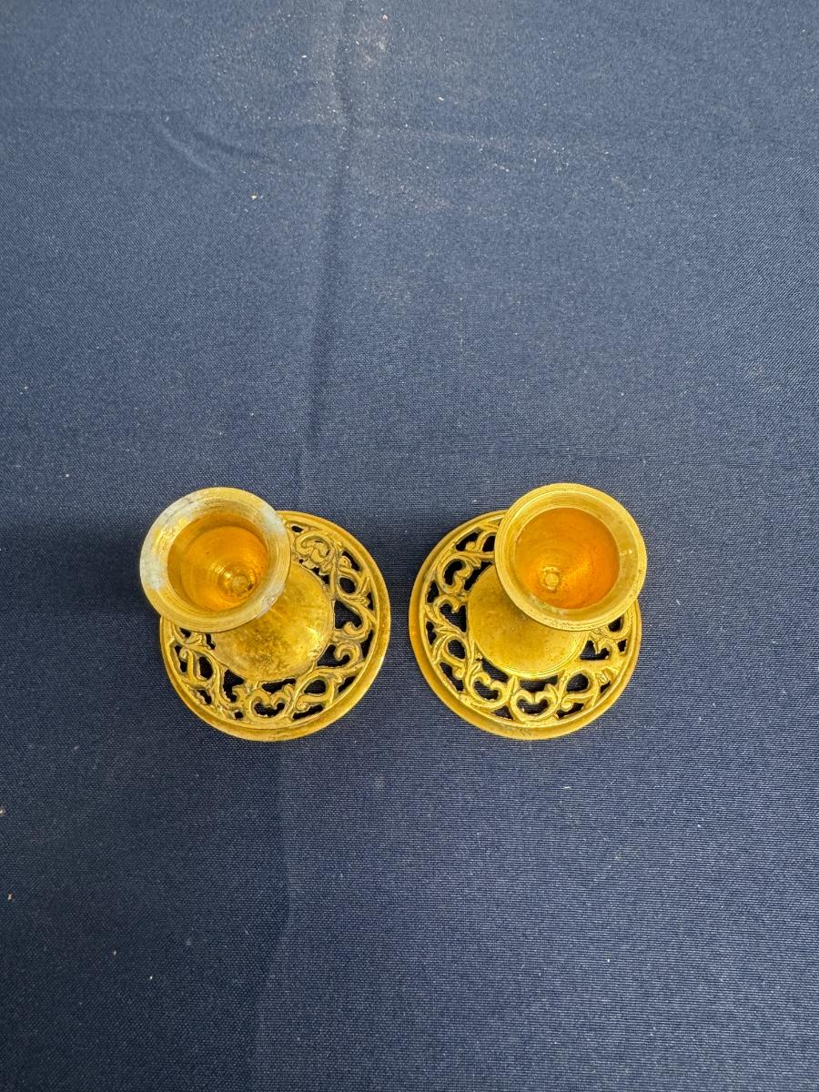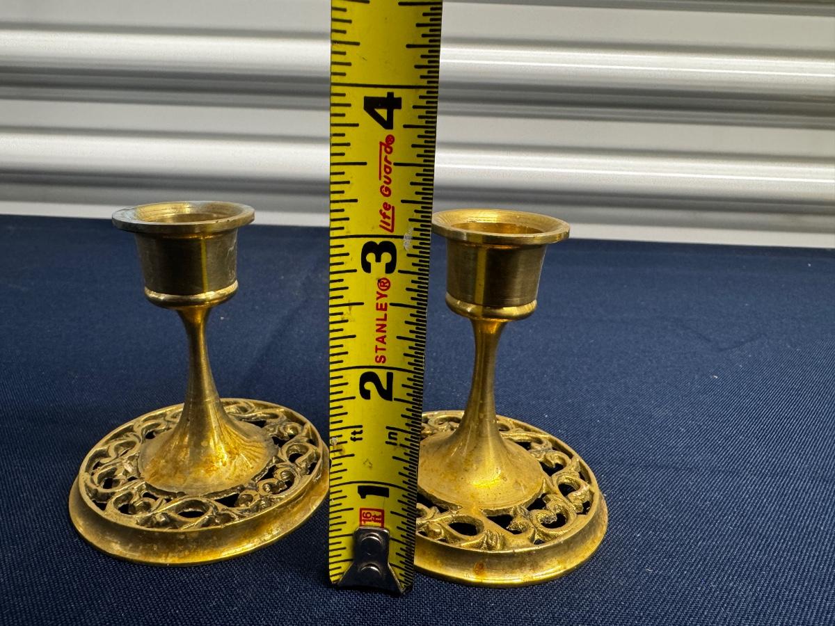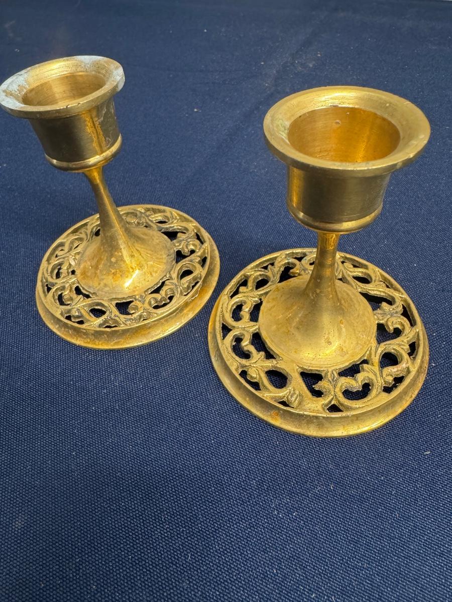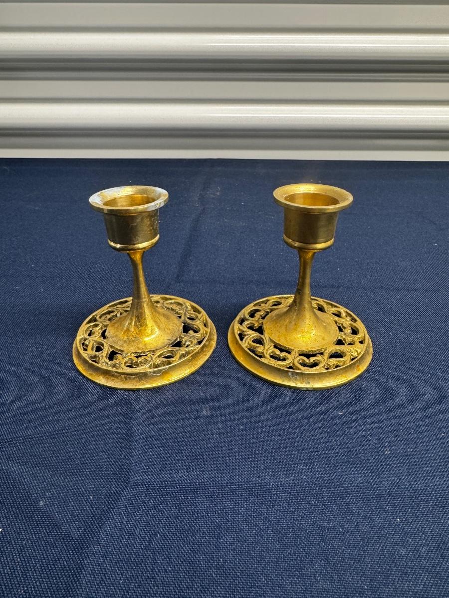Vintage Solid Brass Candlesticks – Pierced Openwork Base – Ornate Short Pair