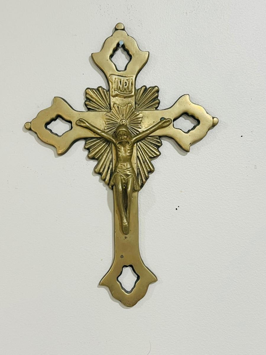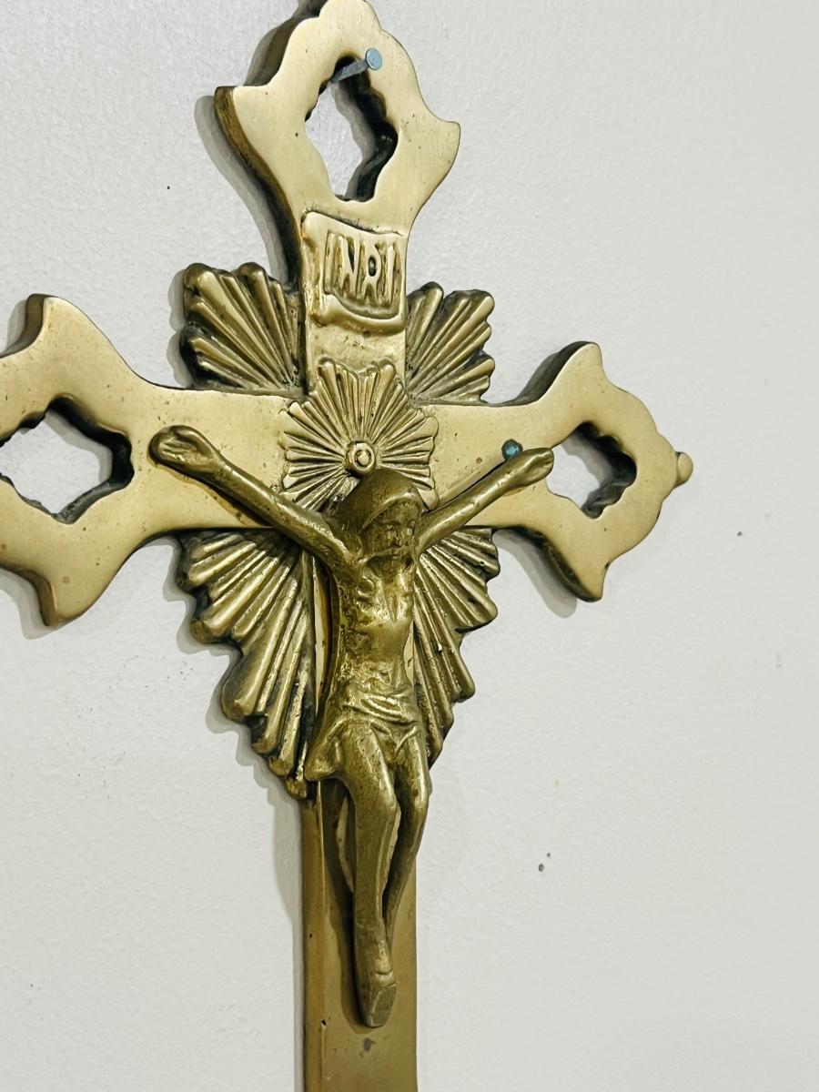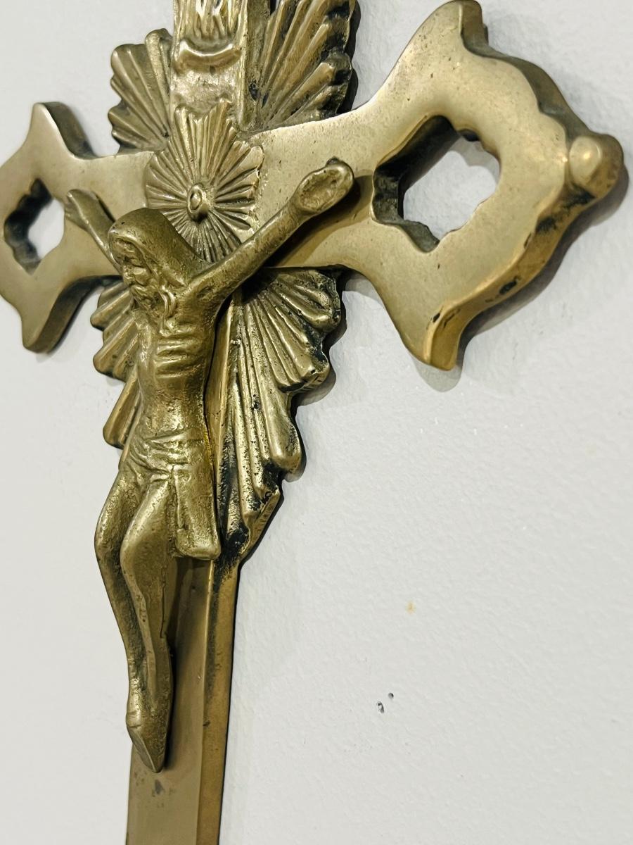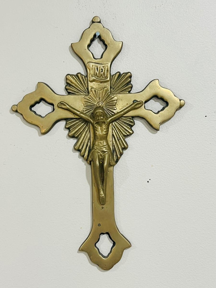 Vintage Solid Brass Crucifix Wall Cross Measures 11 inches tall and 7 1/2 inches wide.
