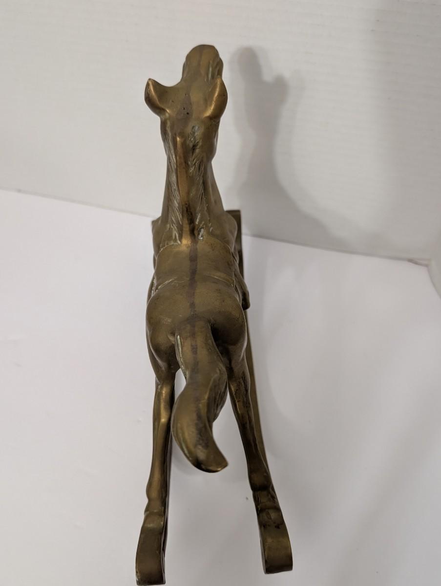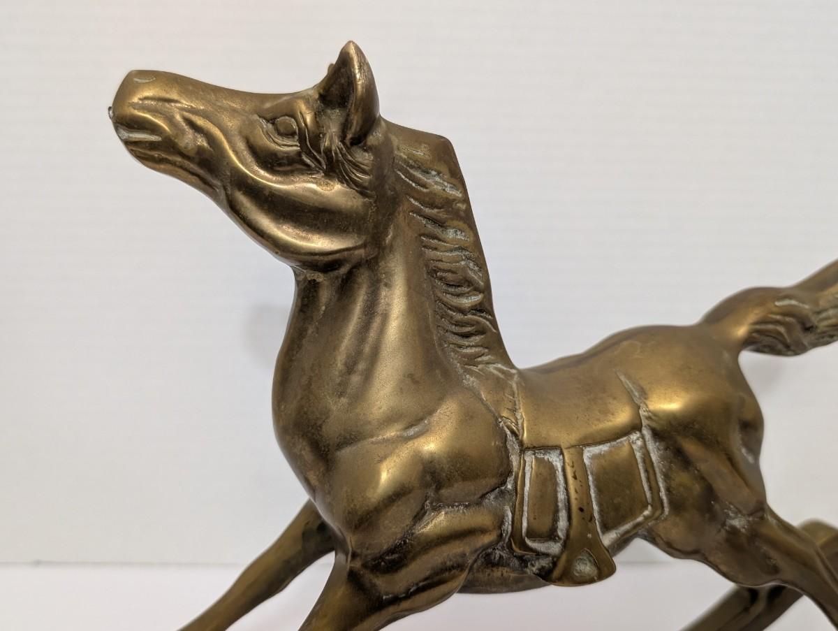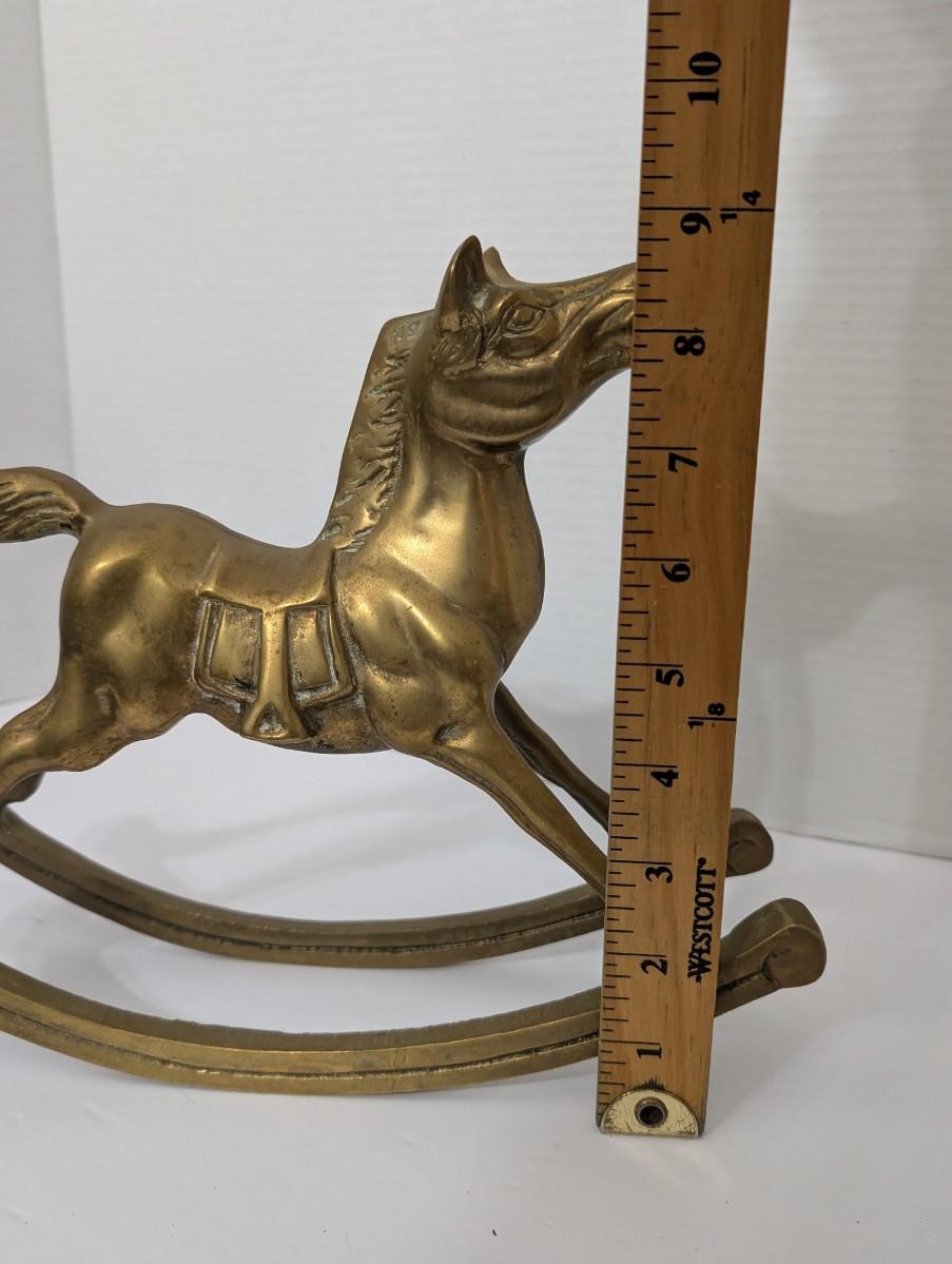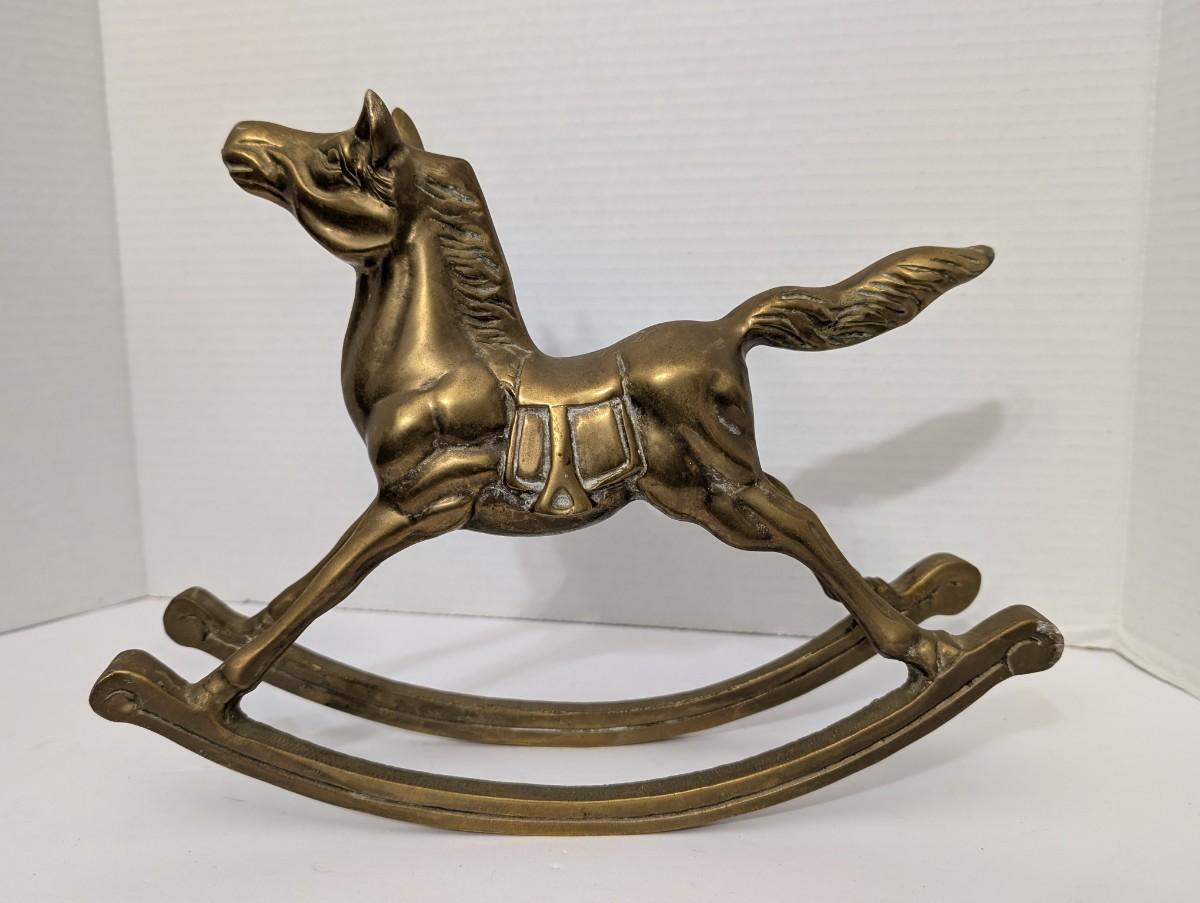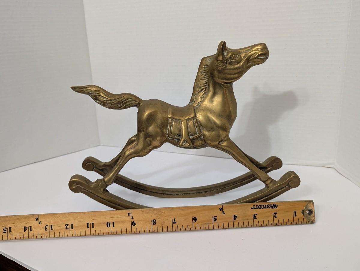 Vintage solid brass rocking horse figurine with beautiful sculpted detail and a classic mid-century look. This heavy piece makes a striking decorative accent for a nursery, office, or equestrian-themed display. Naturally aged patina adds warmth and character to the finish.