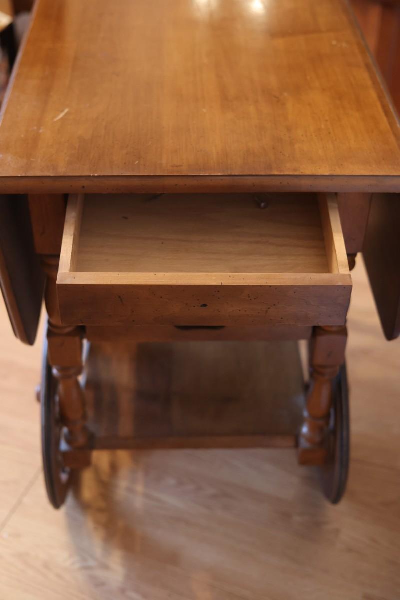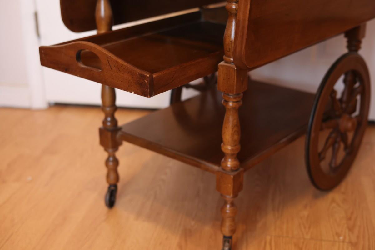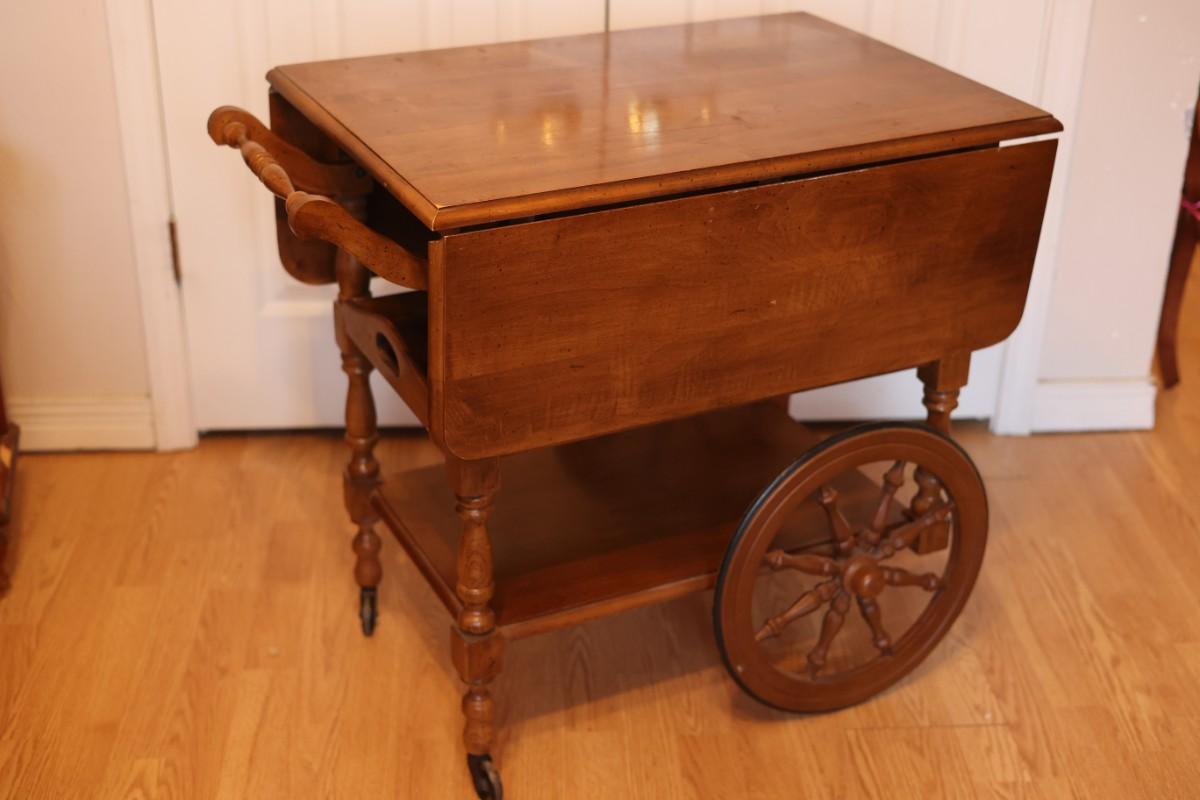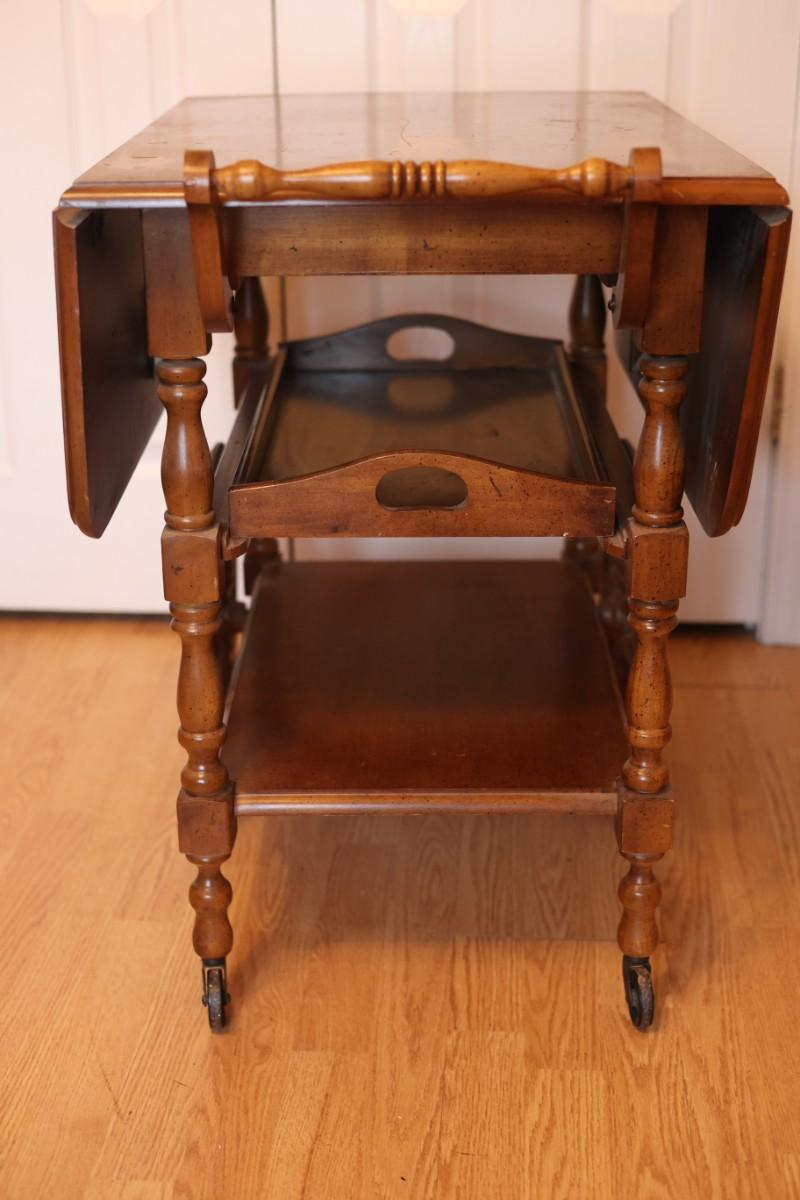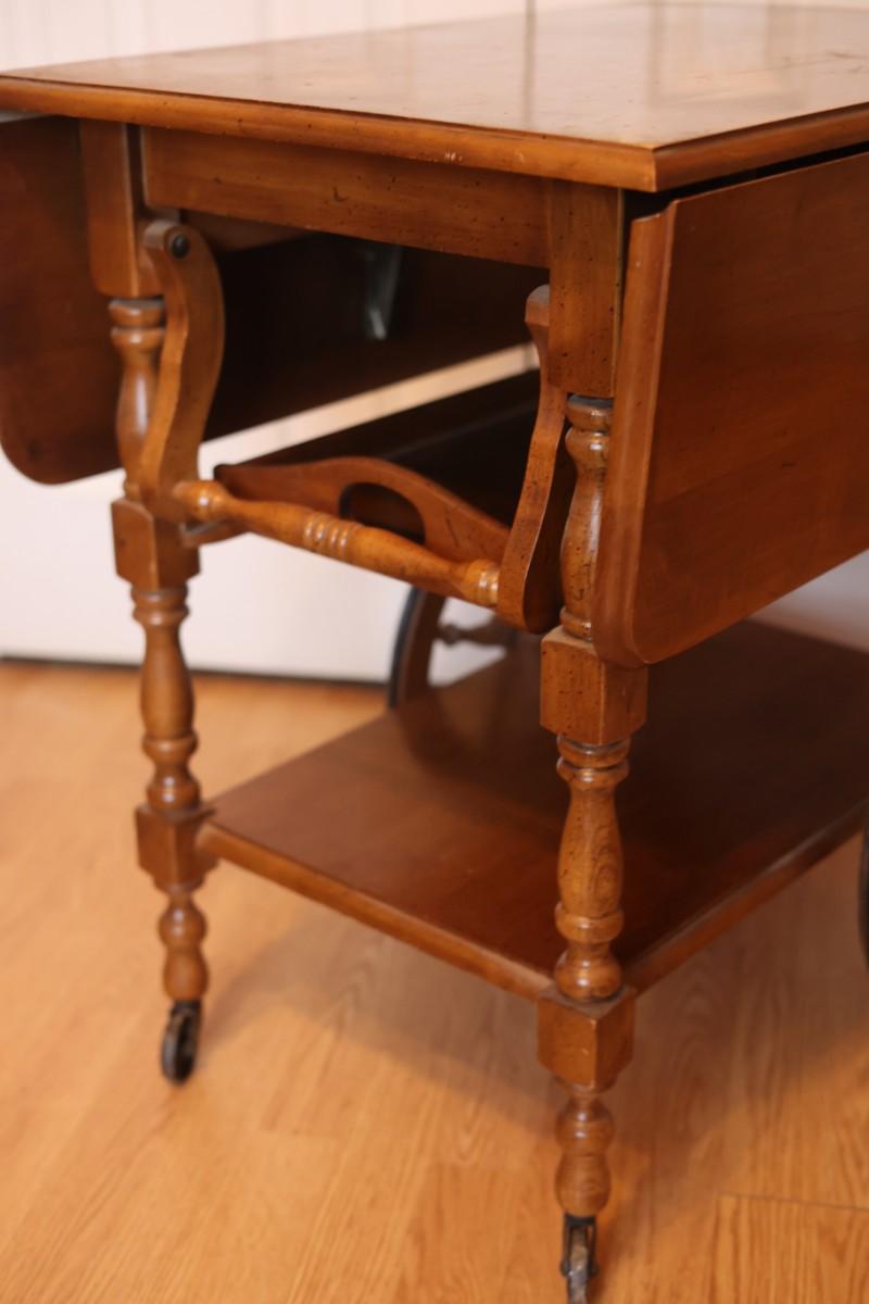 No brand markings, comparable in quality to Ethan Allen. It is in great condition. Drop leaf & removable tray in the mid cart. Wheels perfectly. It is missing the drawer handle.