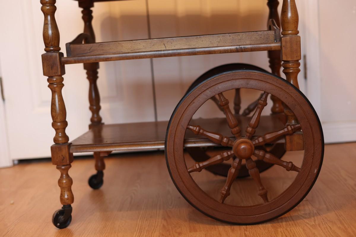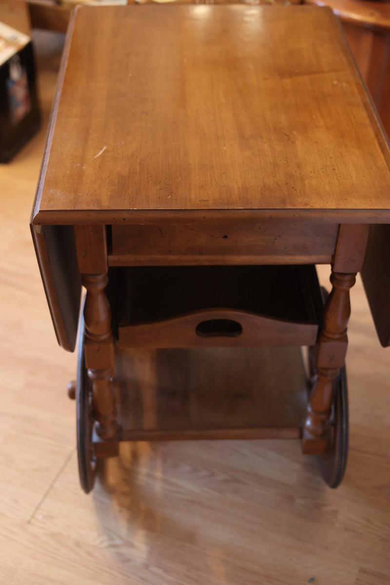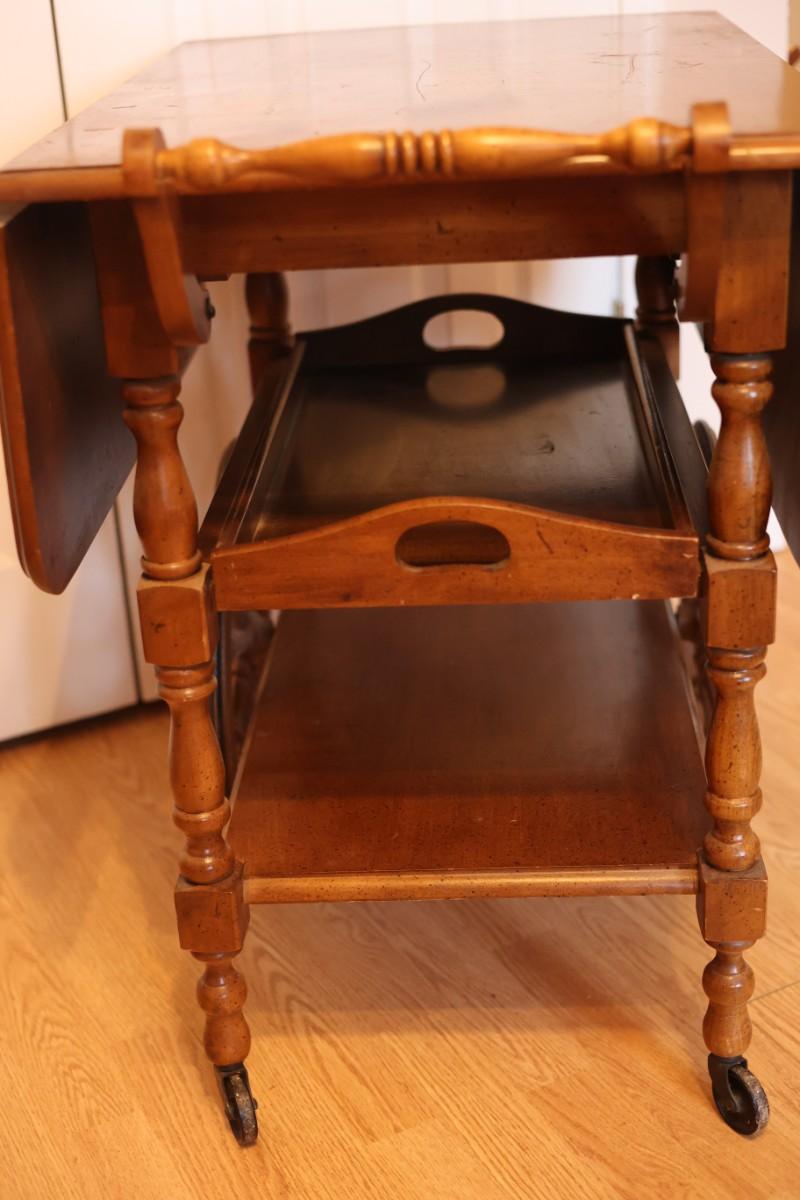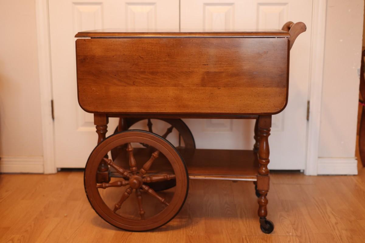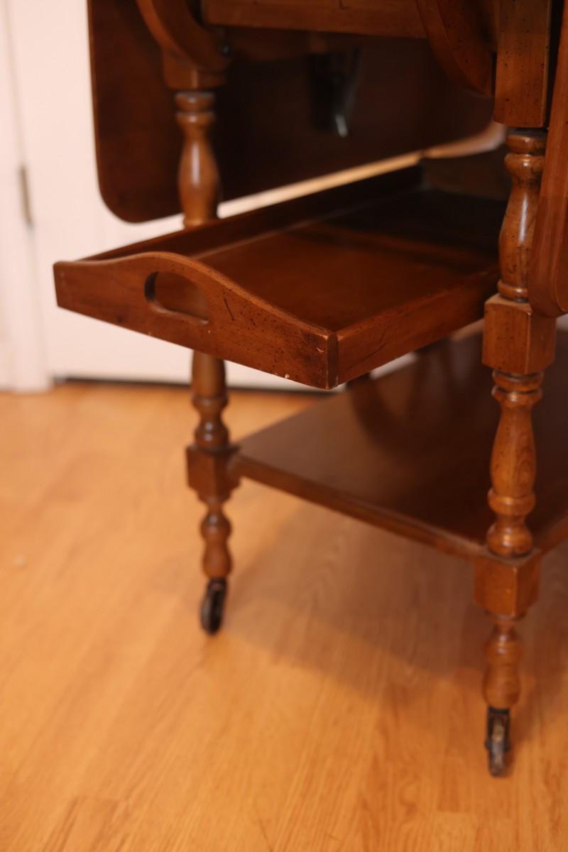 No brand markings, comparable in quality to Ethan Allen. It is in great condition. Drop leaf & removable tray in the mid cart. Wheels perfectly. It is missing the drawer handle.
