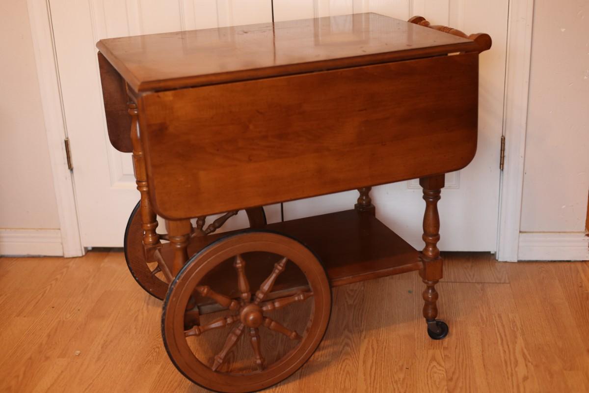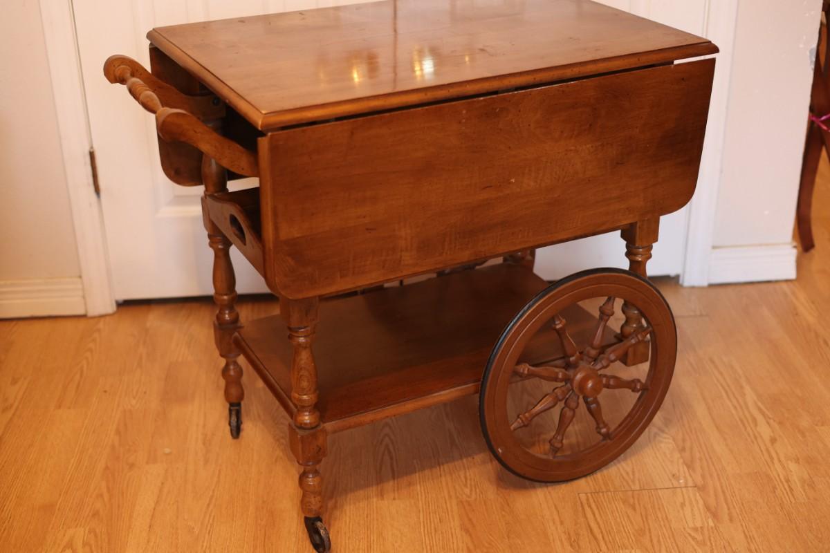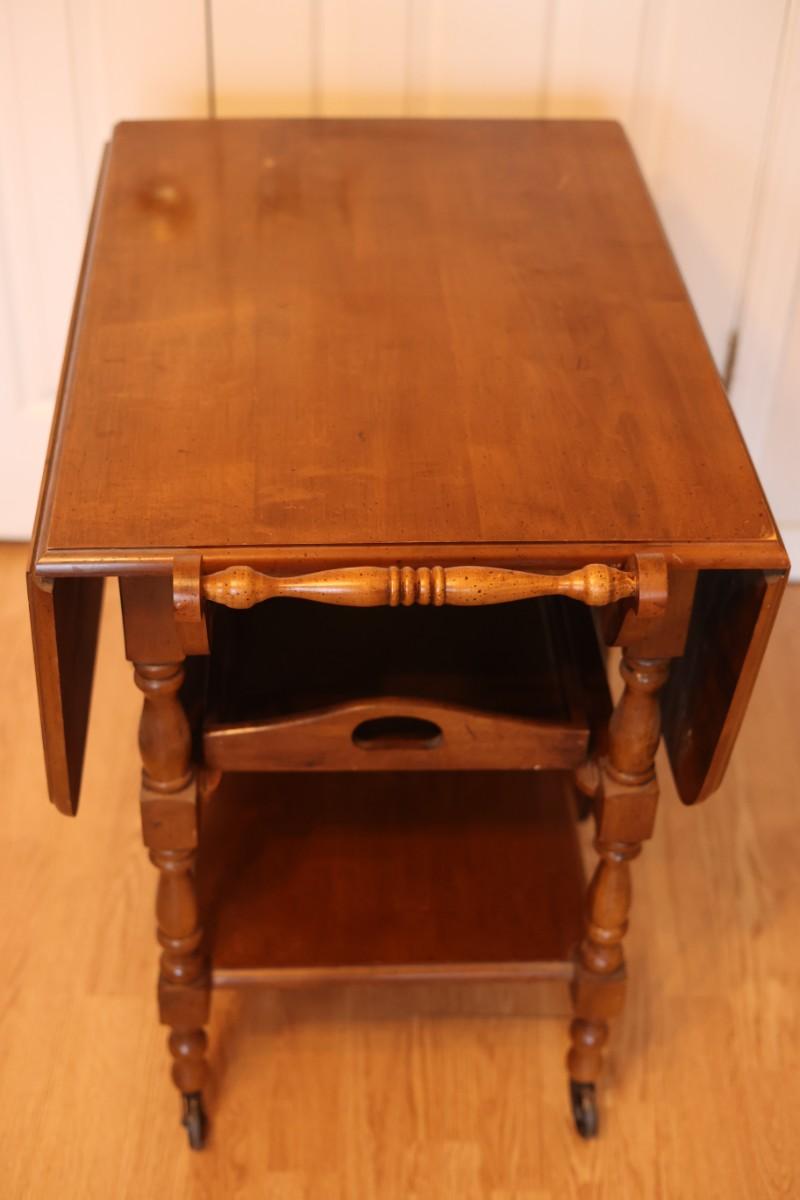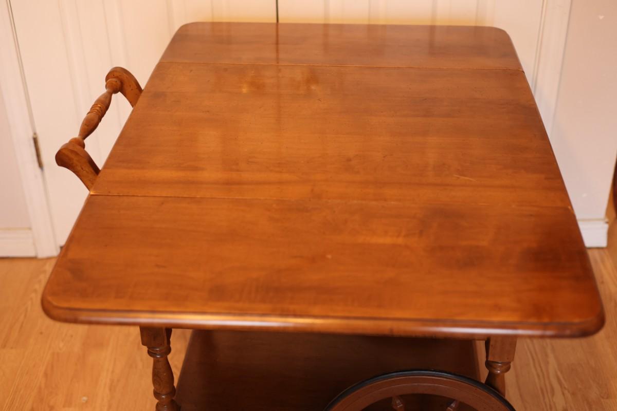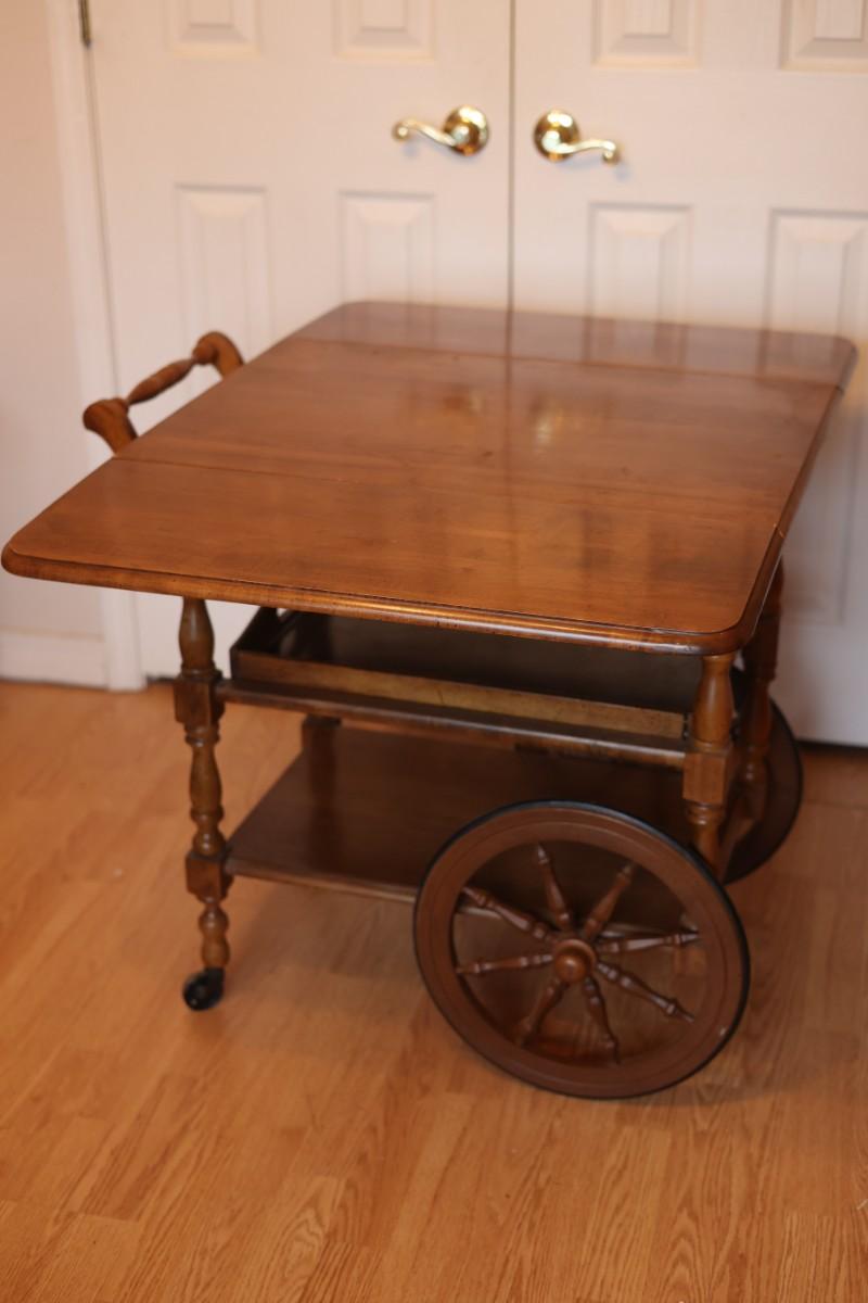 No brand markings, comparable in quality to Ethan Allen. It is in great condition. Drop leaf & removable tray in the mid cart. Wheels perfectly. It is missing the drawer handle.