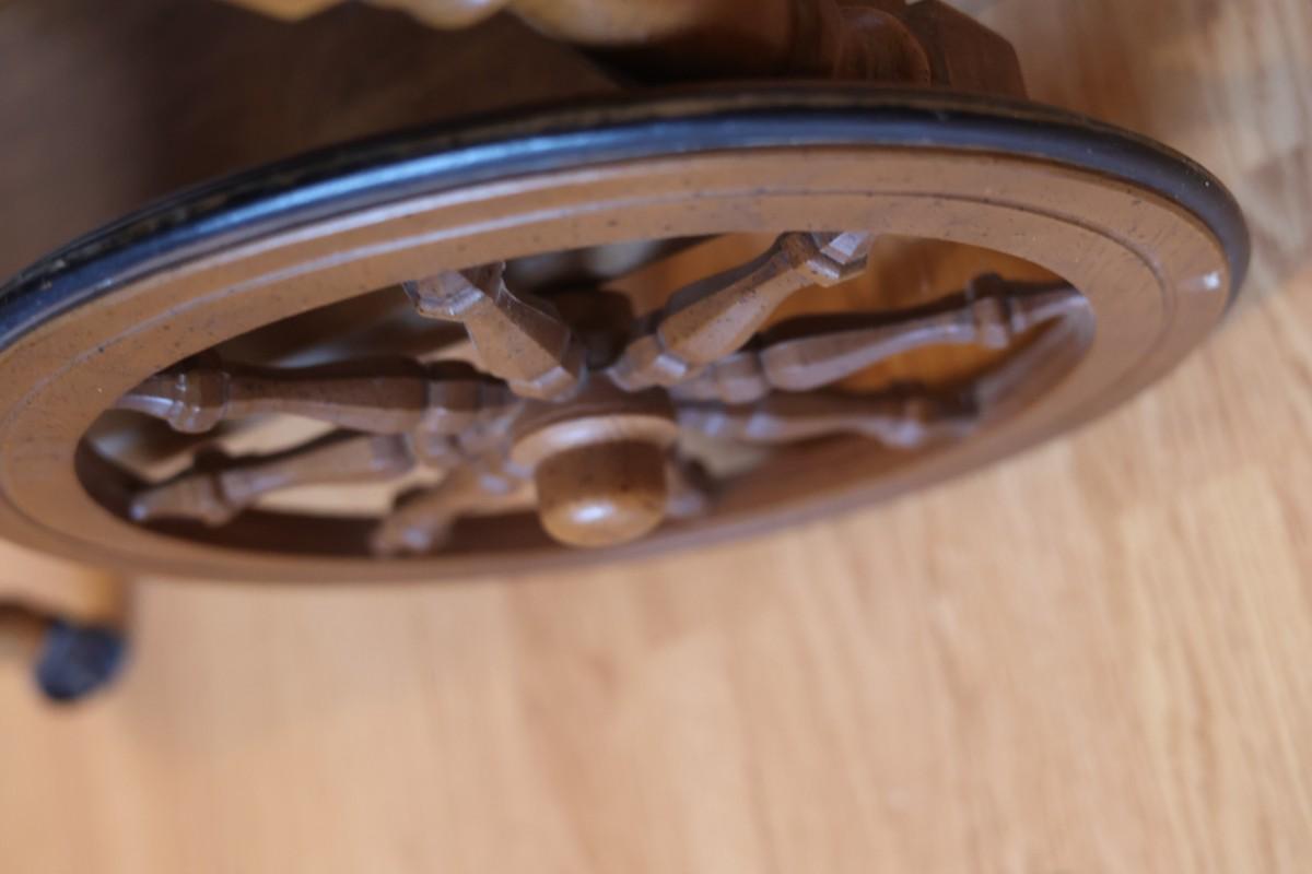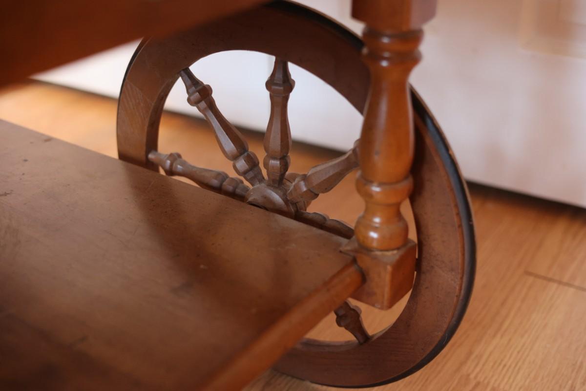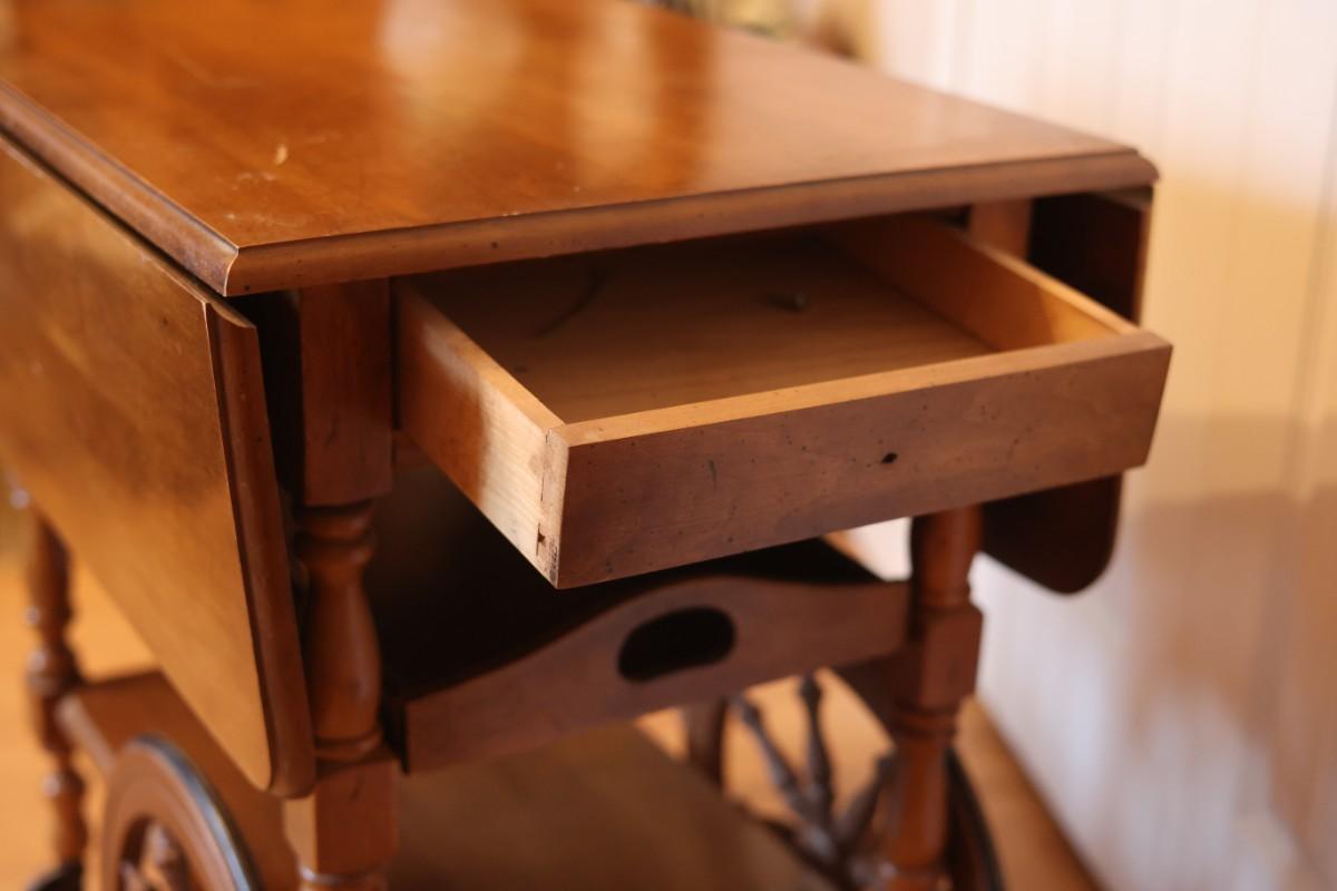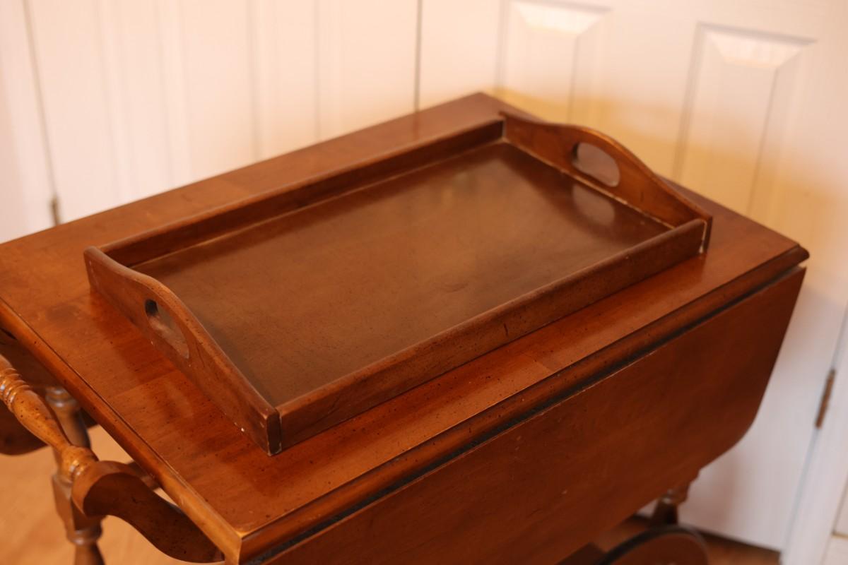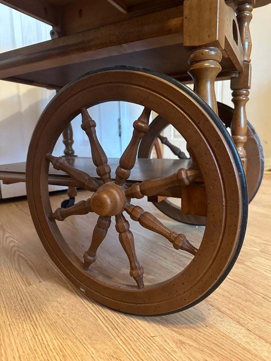 No brand markings, comparable in quality to Ethan Allen. It is in great condition. Drop leaf & removable tray in the mid cart. Wheels perfectly. It is missing the drawer handle.