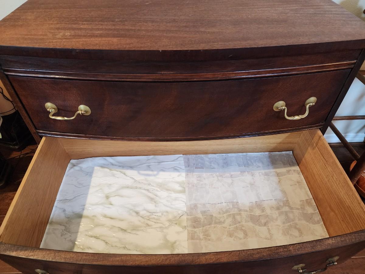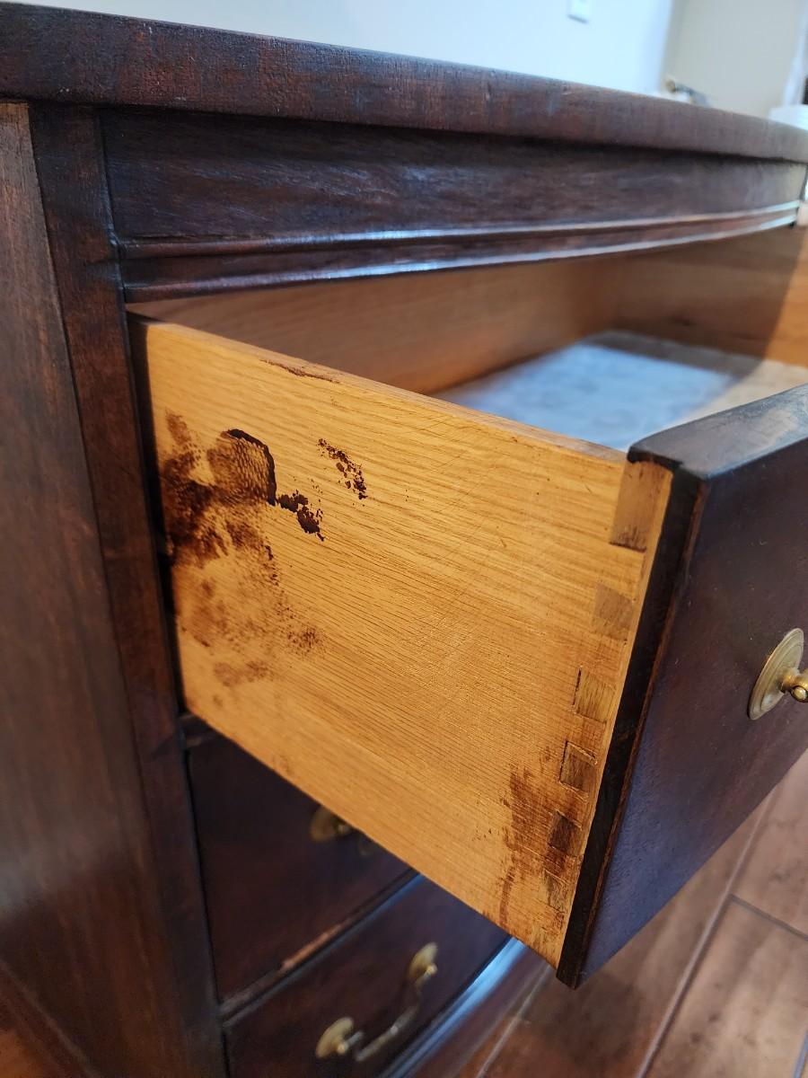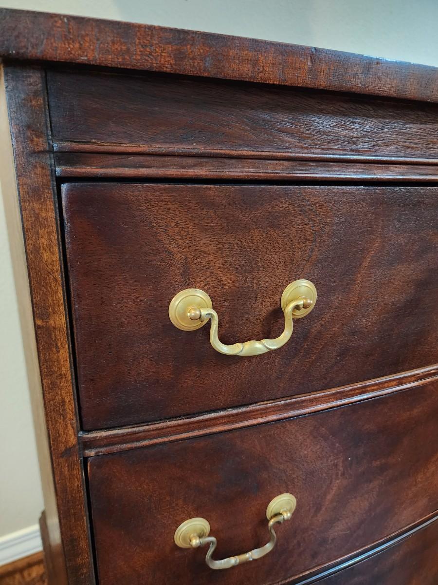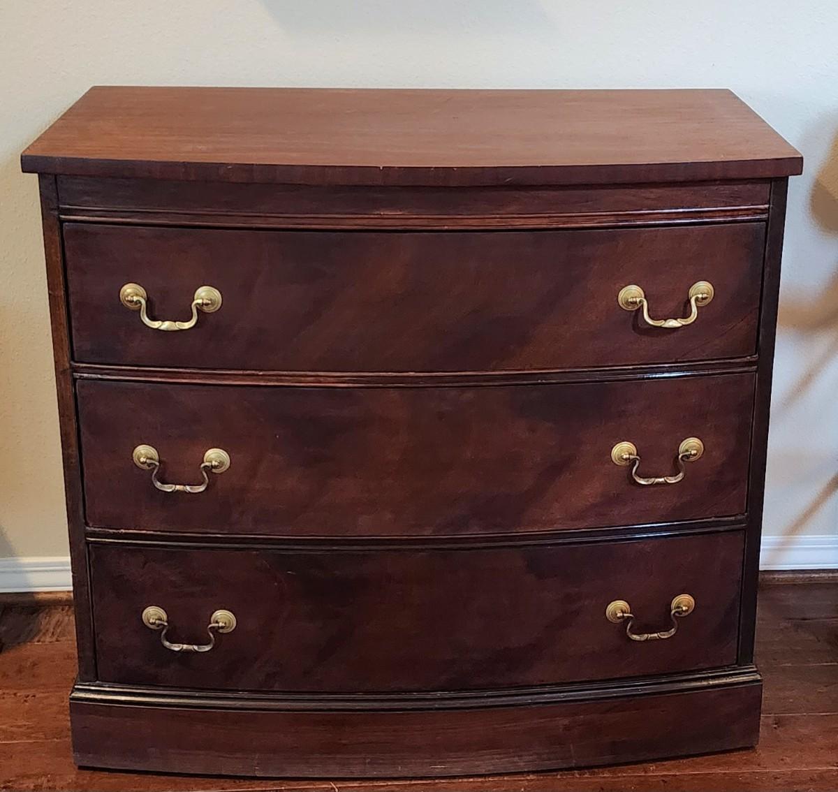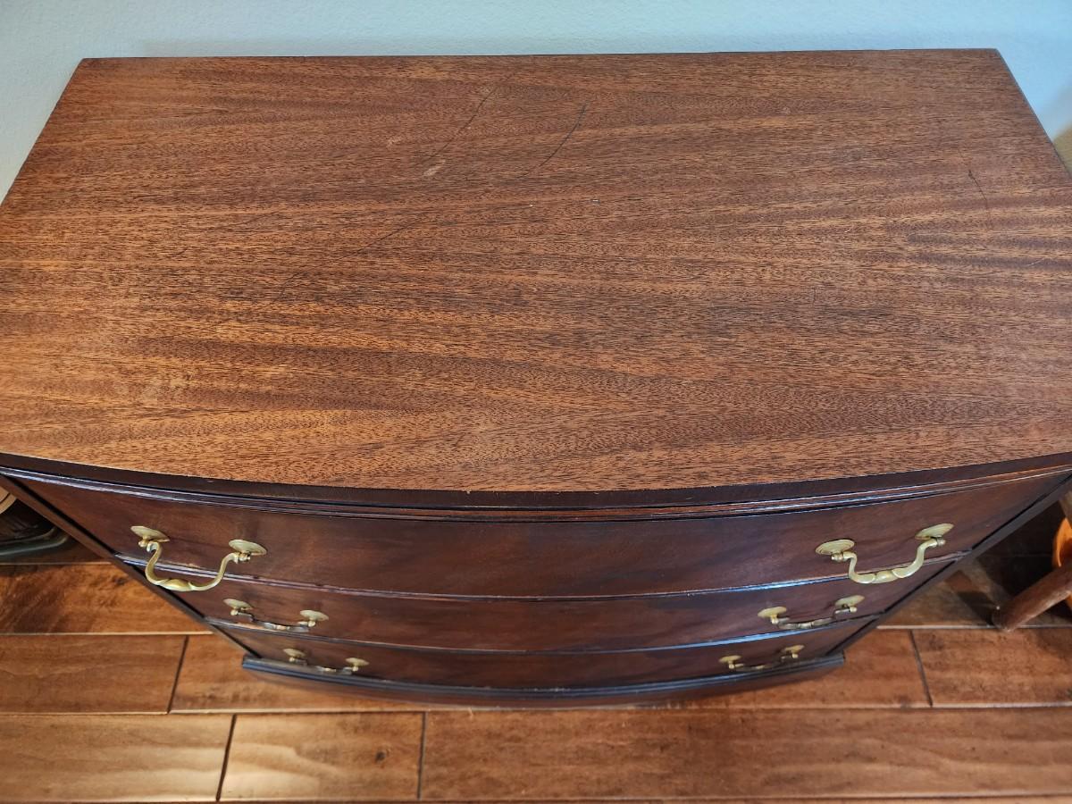 Solid brass hardware. Bow front. Very good condition, no visible structural damage or water stains. A couple of minor color imperfections on the top (see photos).