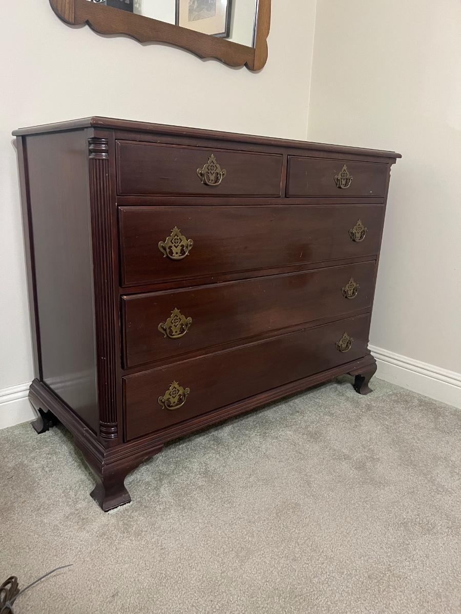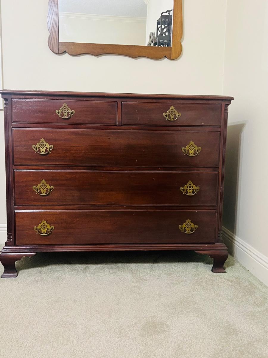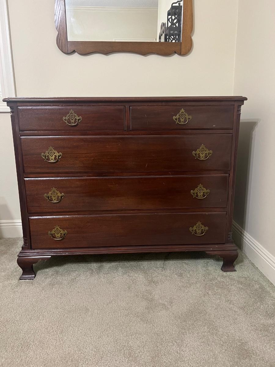Vintage Solid Wood 5 Drawer Dresser With original brass pulls. Measures 35 inches tall, 43 inches wide and 20 inches deep