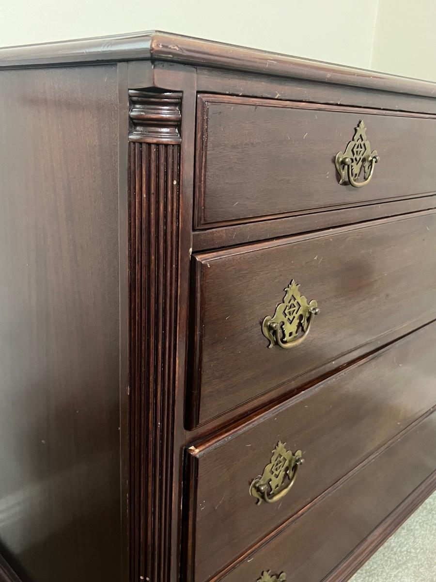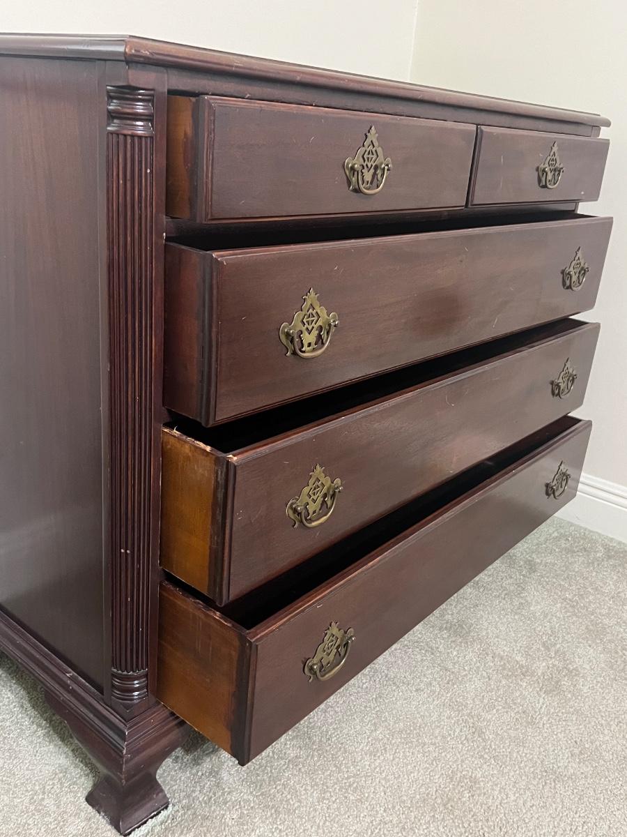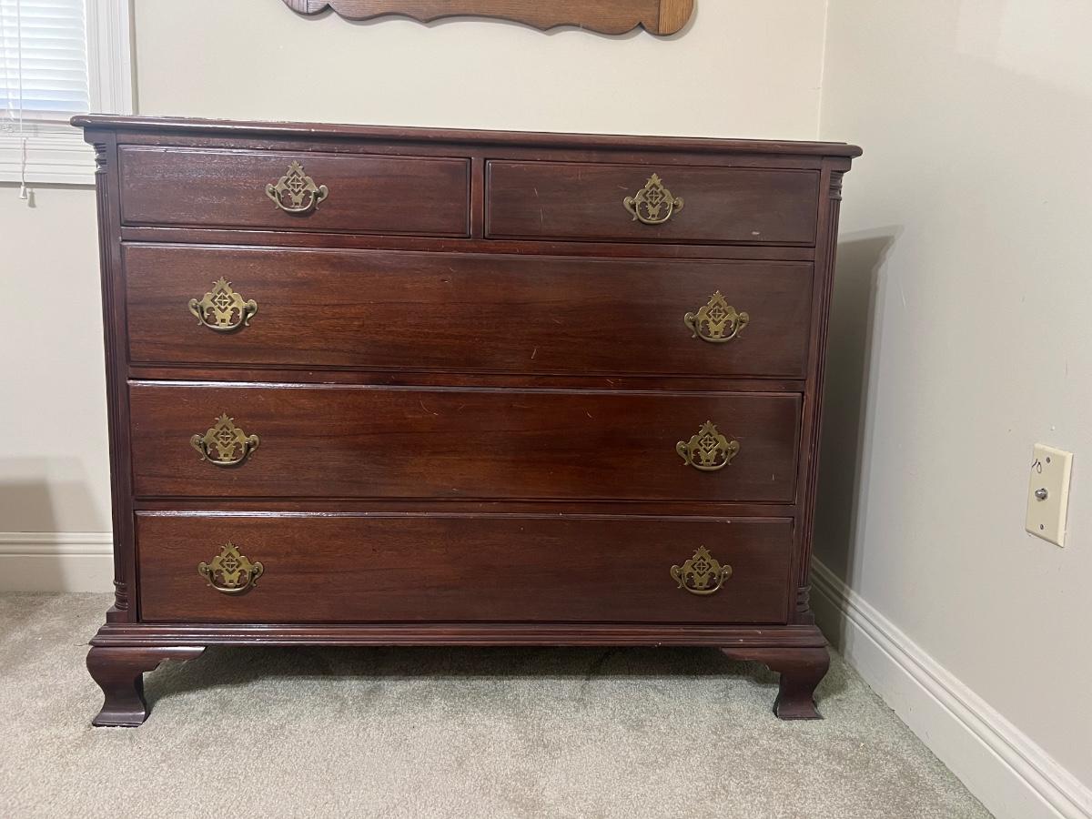 Vintage Solid Wood 5 Drawer Dresser With original brass pulls. Measures 35 inches tall, 43 inches wide and 20 inches deep