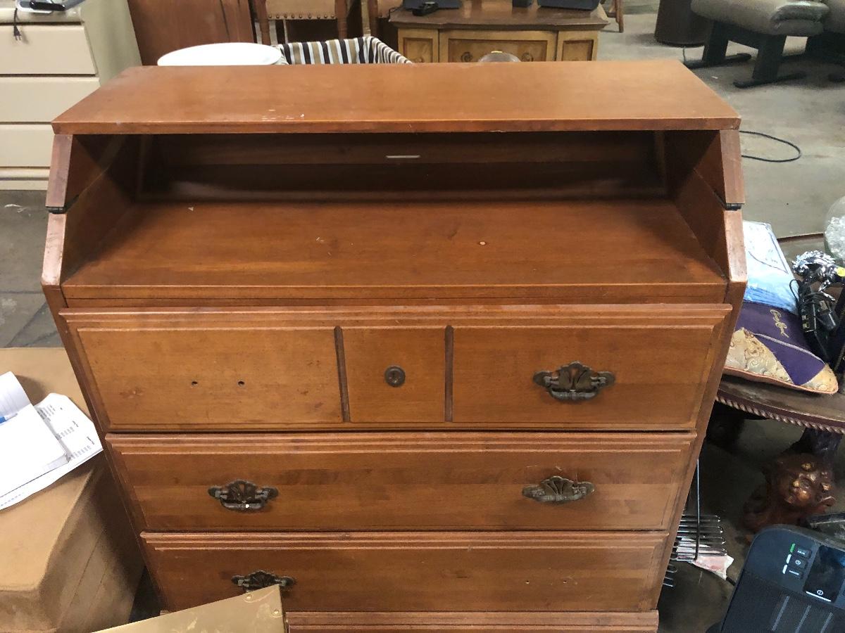 This changing table is ideal for a space saver. Also would look great refinished. Solid wood and measures 34 x 17 x 35 closed and 29” with the changing table open