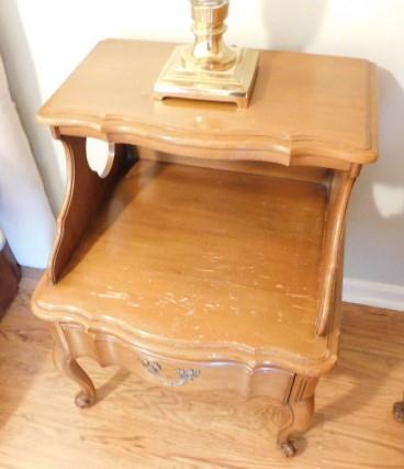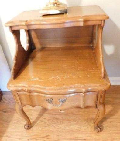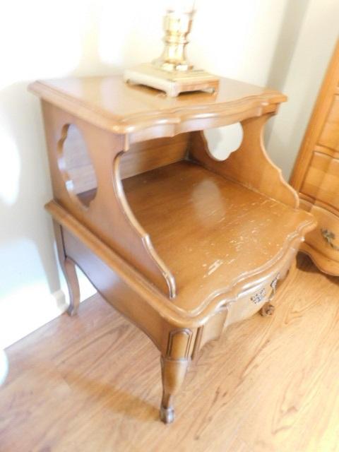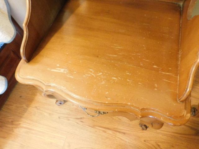 Vintage Solid Wood Cherry Side Table by Continental Furniture 22"x20"x30" Choice One has finish wear on surface as shown. Downstairs item