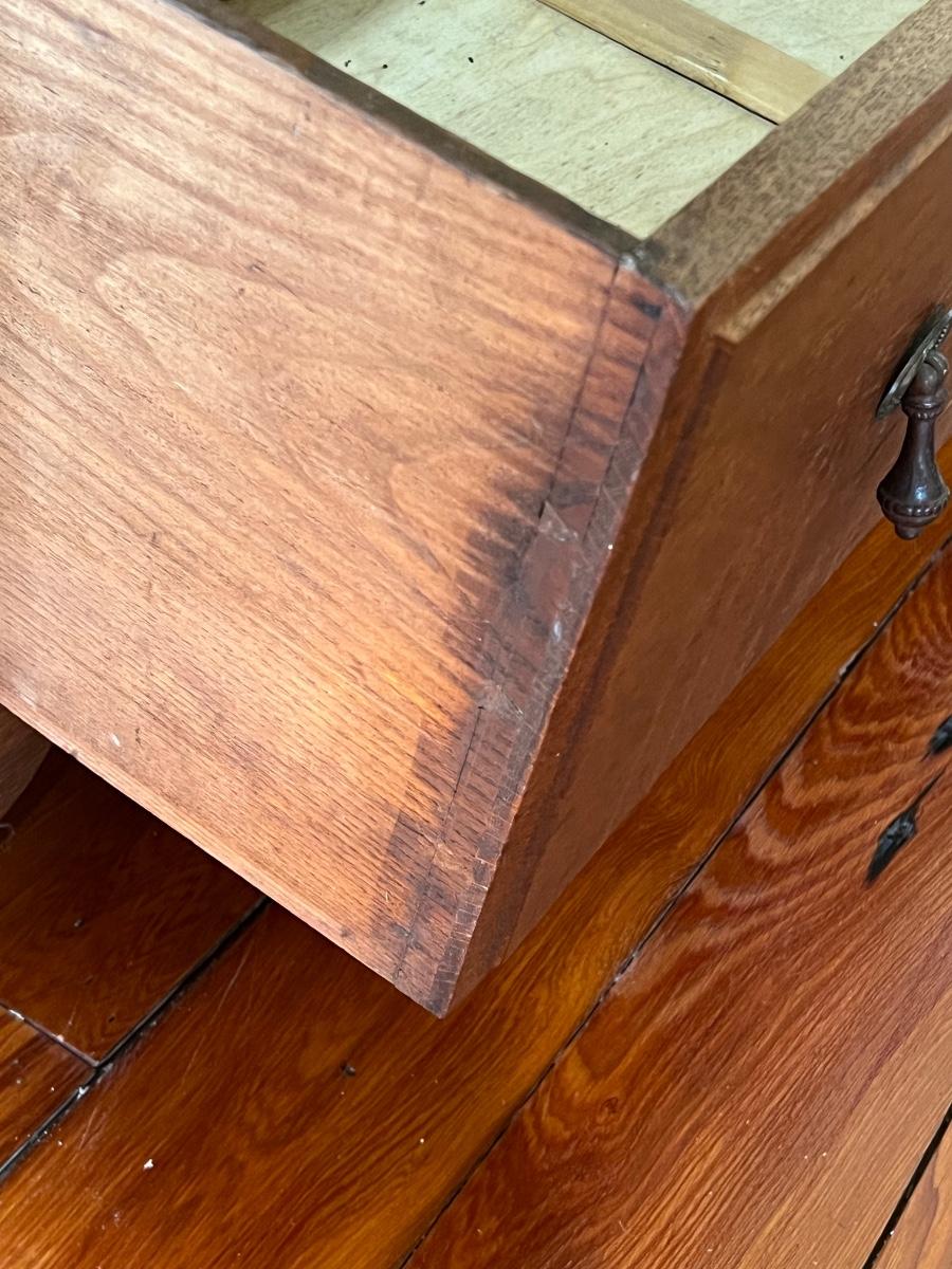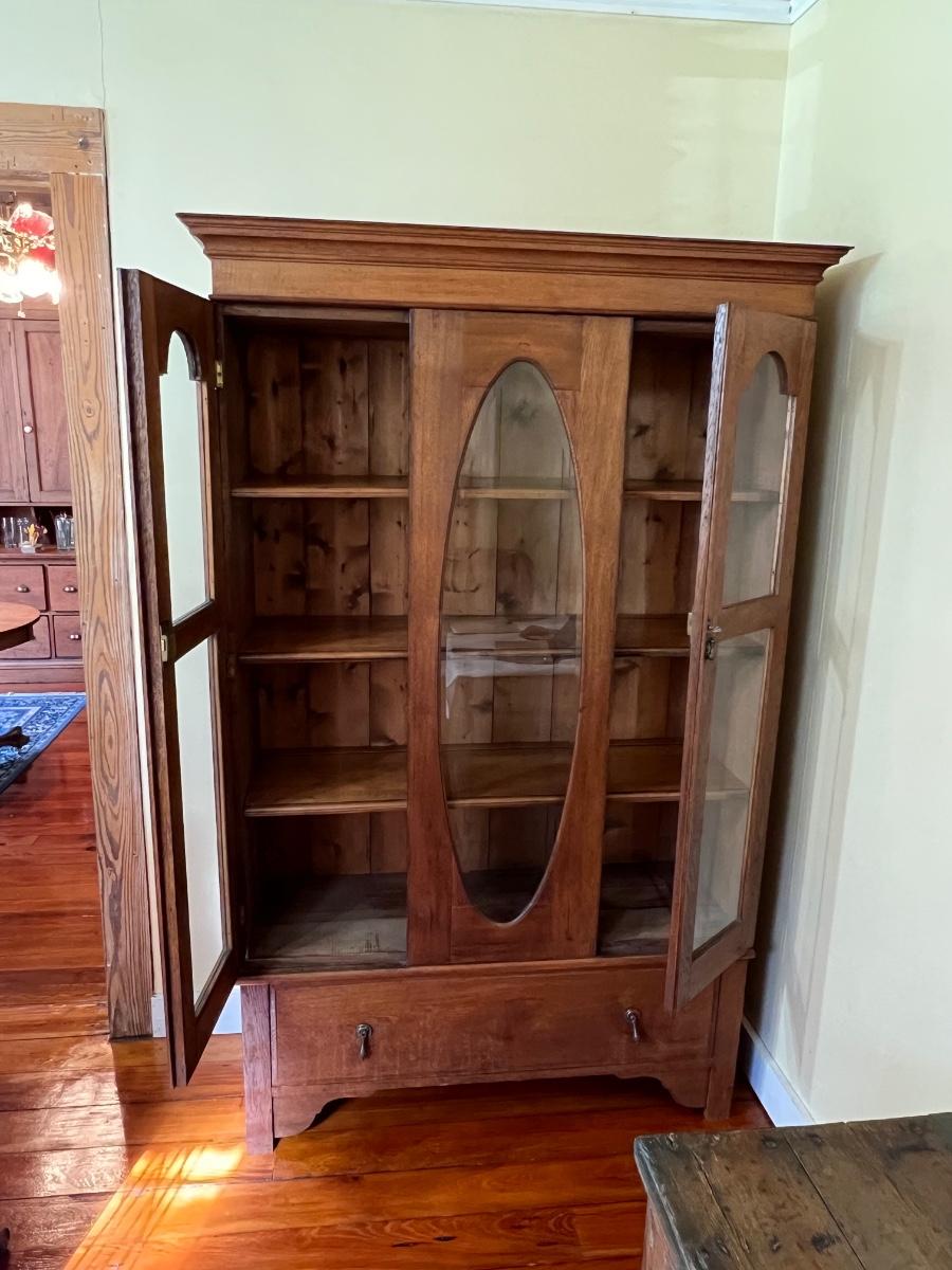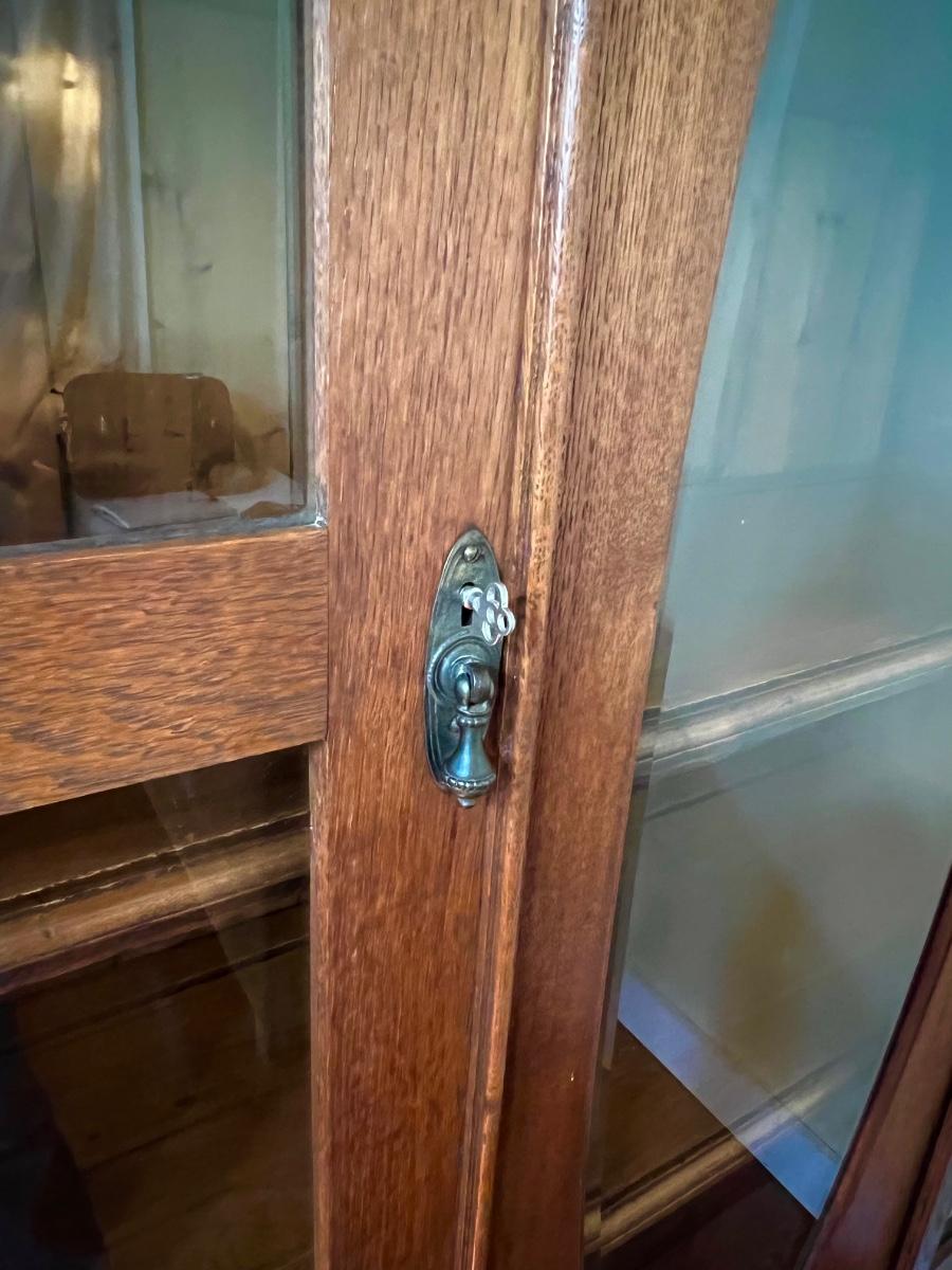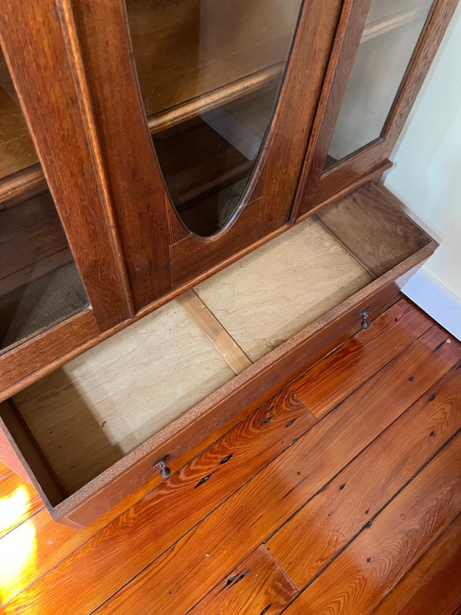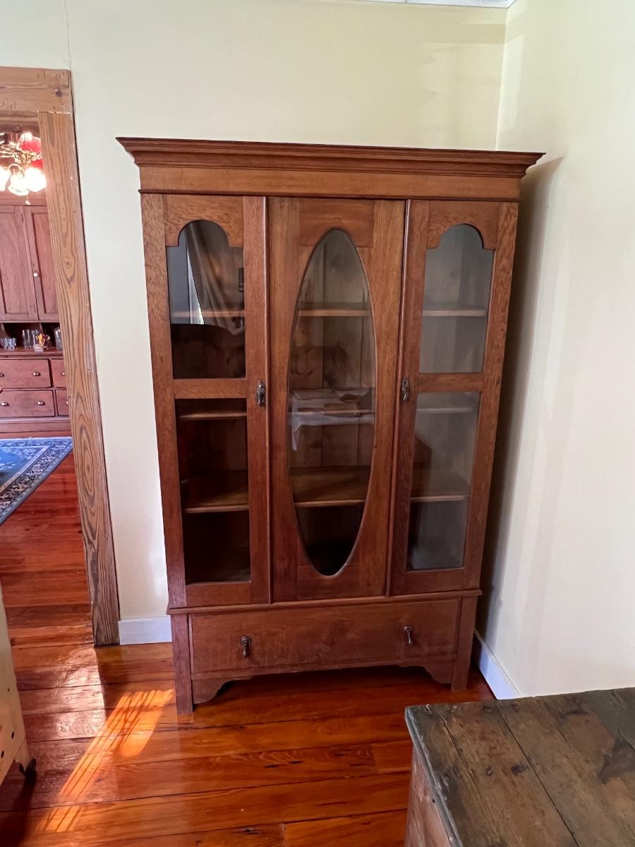Middle mirror is beveled. Has one key. Drawer slides in & out easily. 77.5” H x 49” W x 18” D