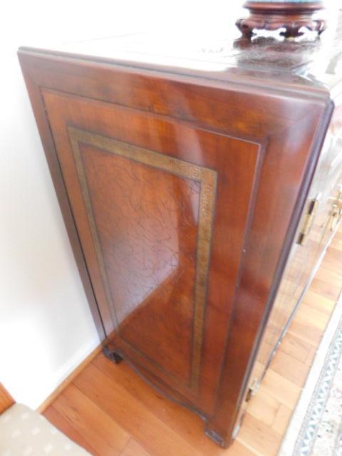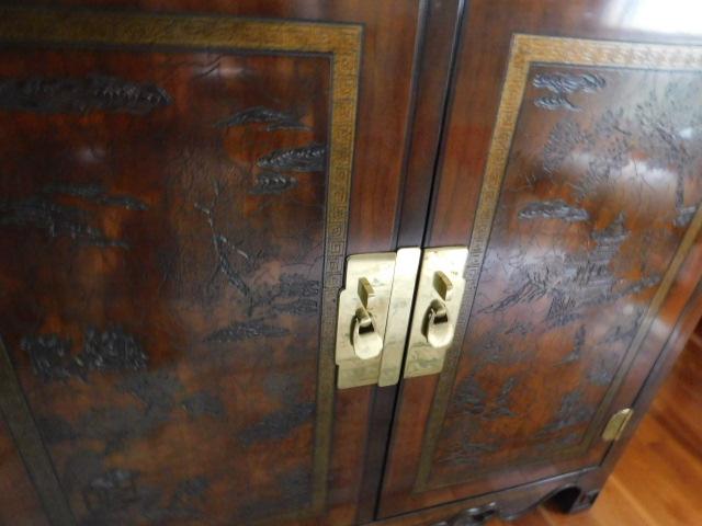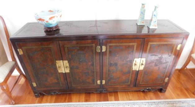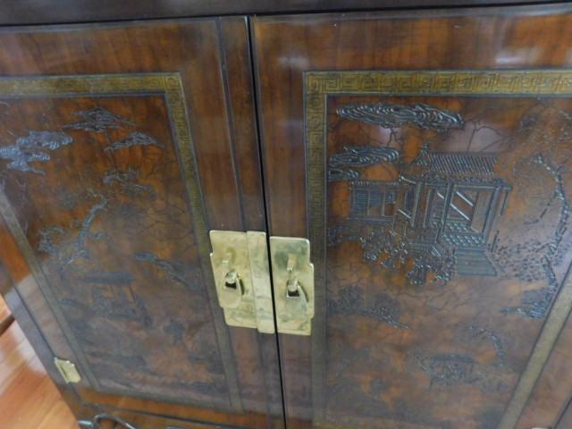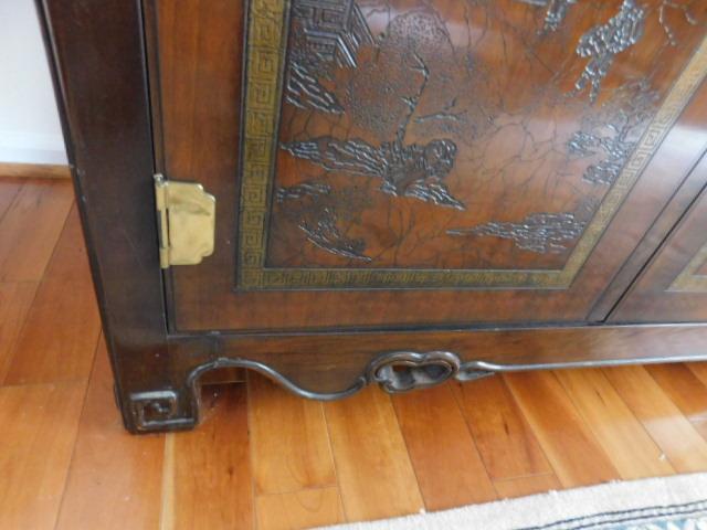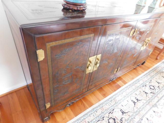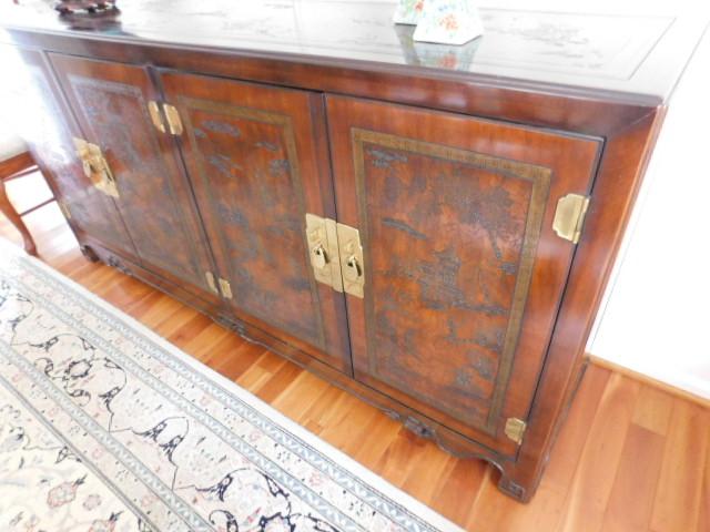 Vintage Solid Wood Chinoiserie Buffet with Brass Fixtures and Relief Carvings by Drexel Heritage 73"x18"x36" main floor has a few steps to maneuver to the drive
