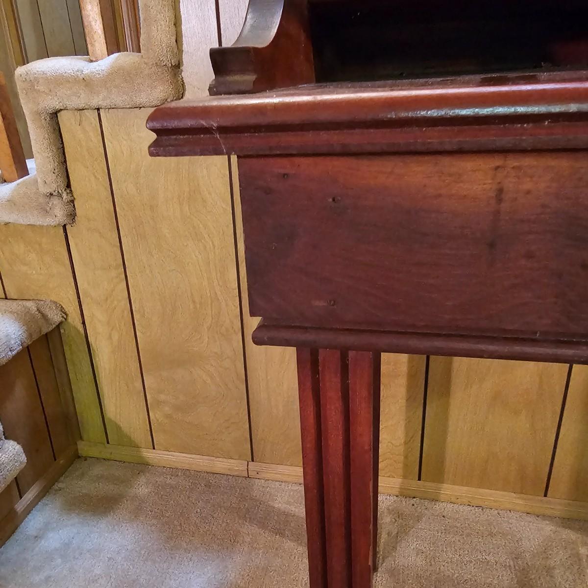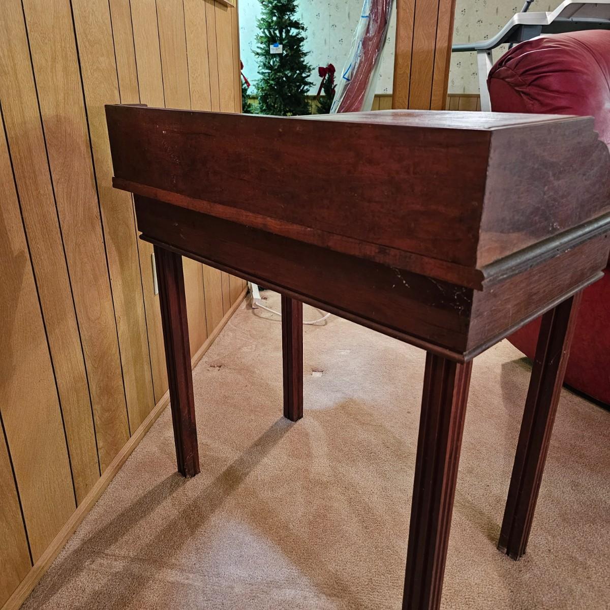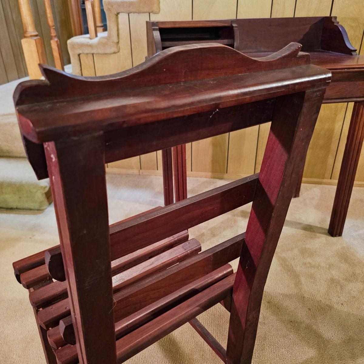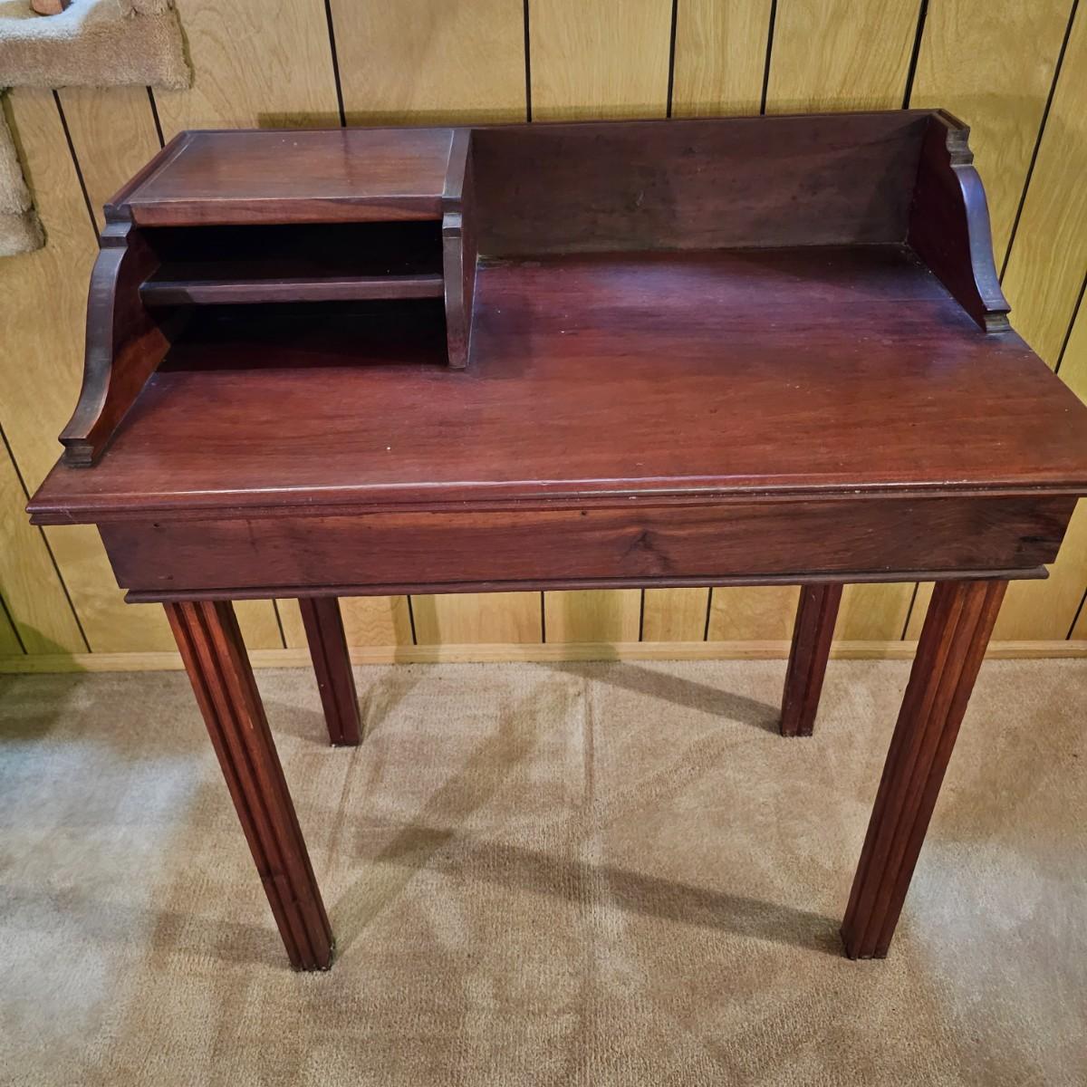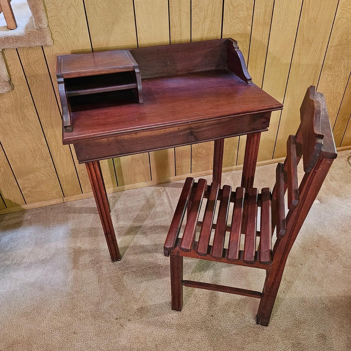 A nice older desk and matching chair set. Desk has built in shelves for paperwork and open tabletop as well. Chair is semi ladderback style, has slat seat. Desk measures 31" x 19" x 33"H, chair is 14.5" x 19" x 33"H, seat height 15". May have been a student desk at one time. See photos for details. Local pickup only.