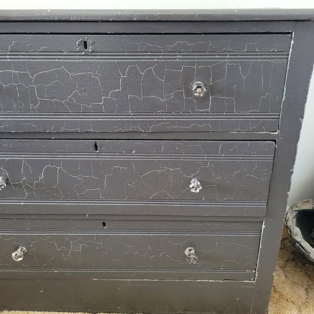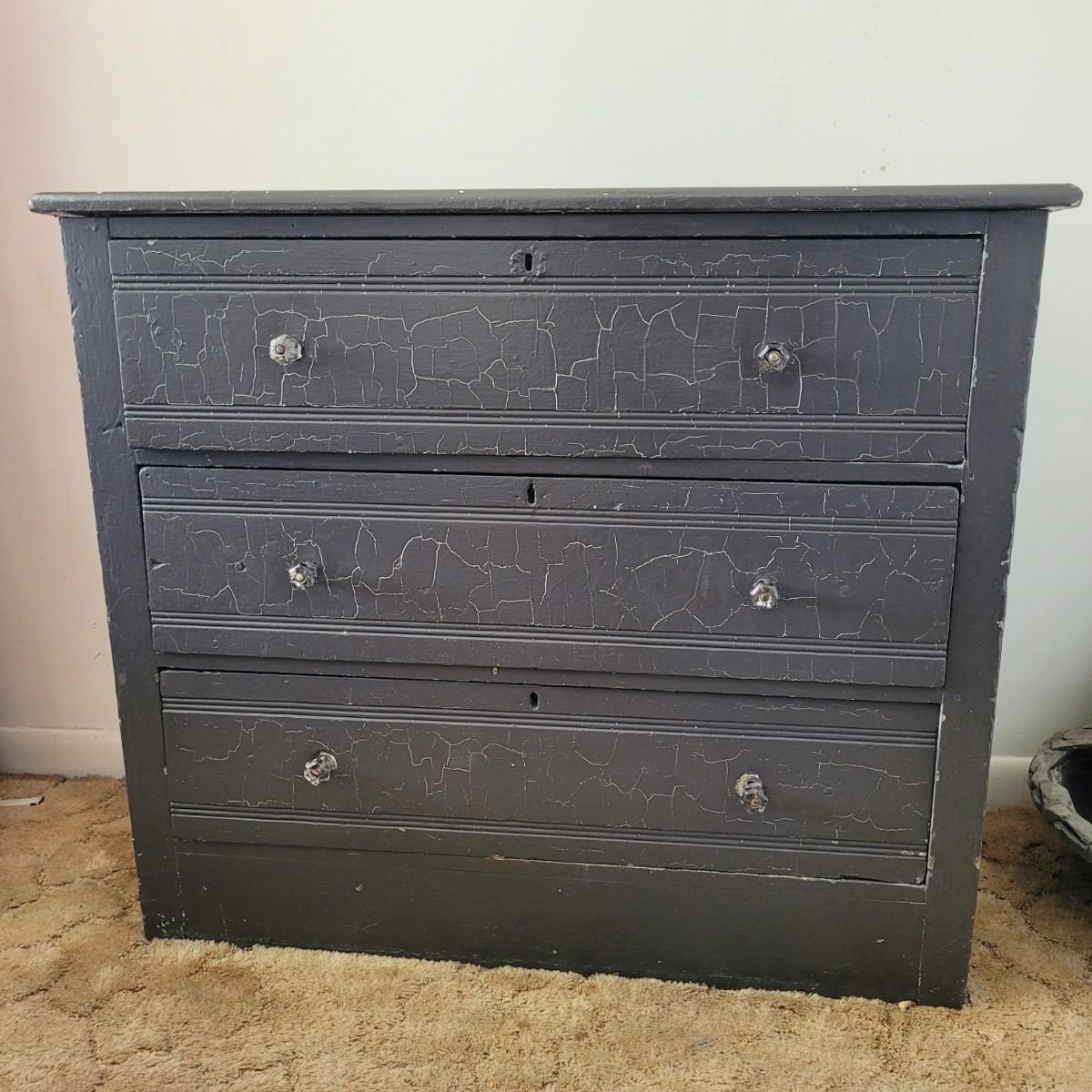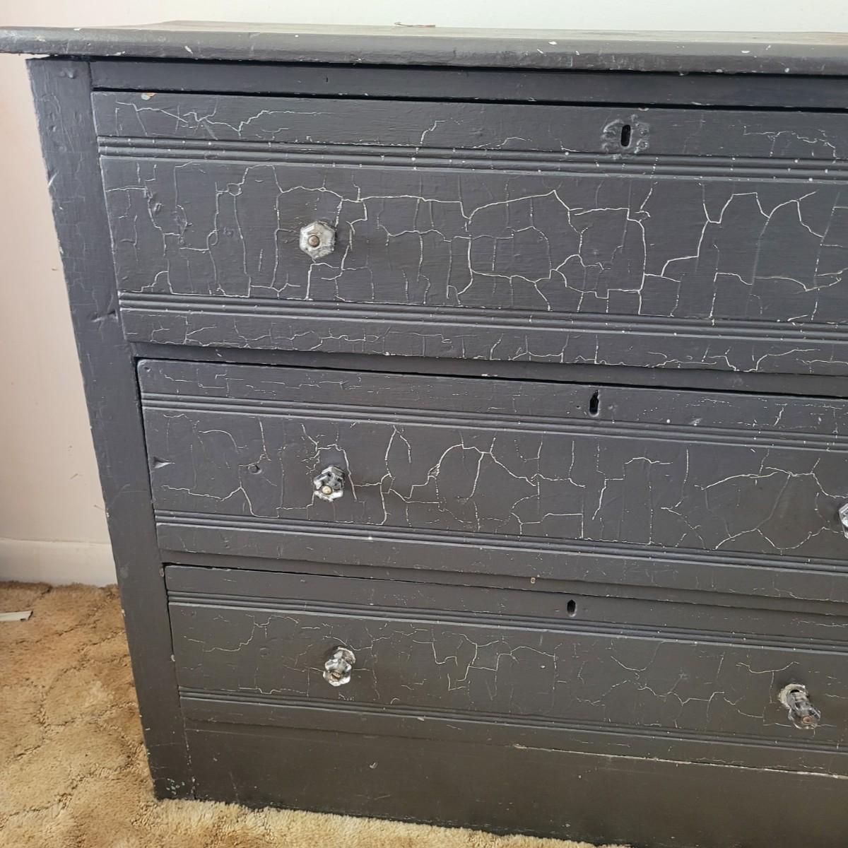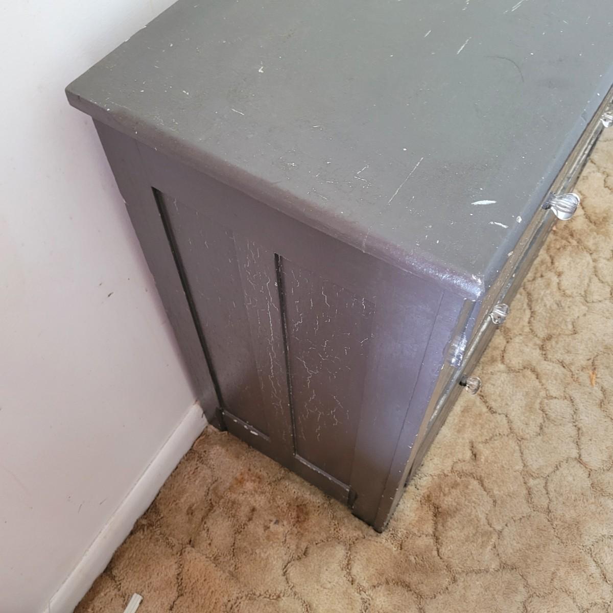 This lot includes one solid wood dresser. This dresser is painted gray and has three sliding drawers. The drawers feature two acrylic and metal handles each. The drawers are a bit stiff. The piece measures 38" x 17" x 33"H. Has chipping paint that appears to be a natural distressing.