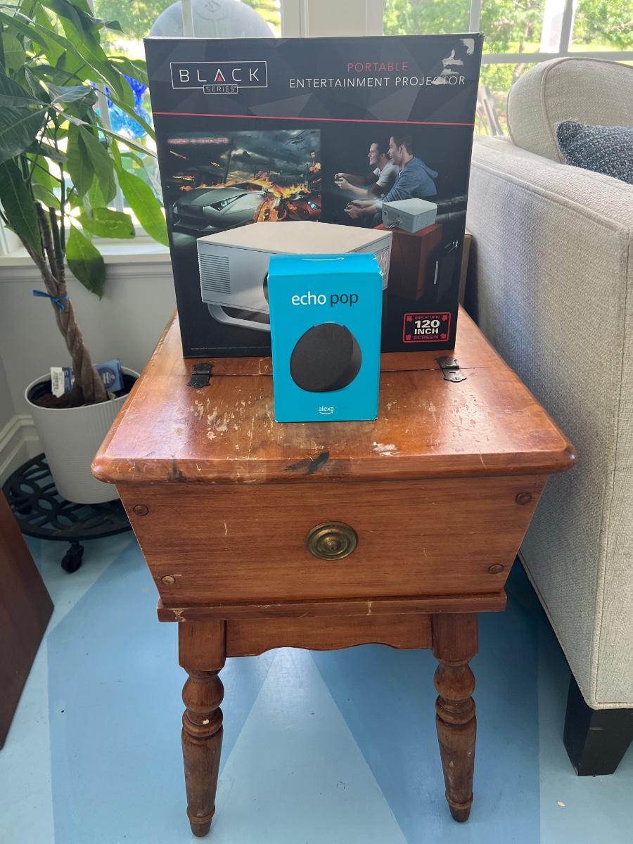 Lots includes 3 items only: end table, echo pop, and projector. Echo pop appears NIB and projector is EUC.