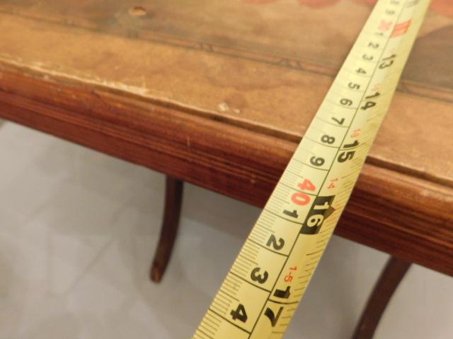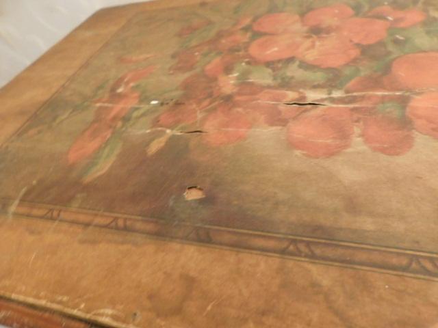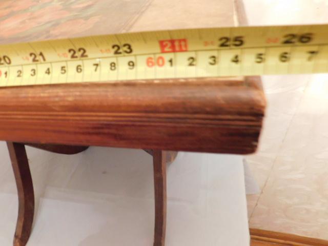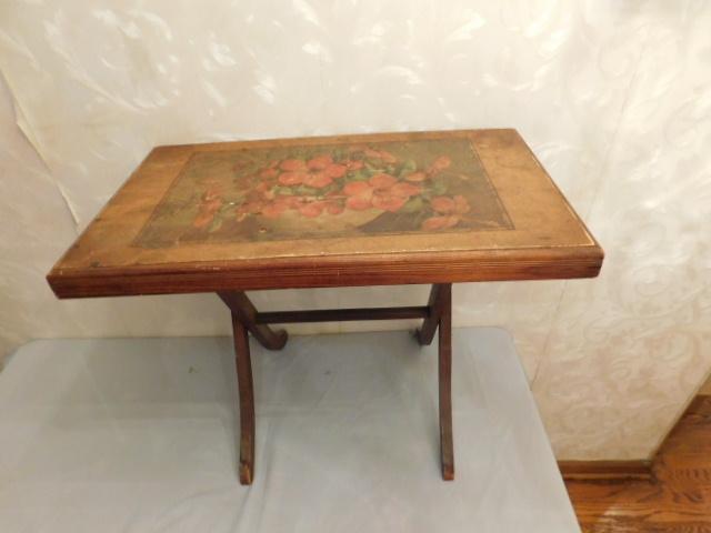 Vintage Solid Wood Fold Table with Picture In-lay 25"x15"x20" Wood in good condition. Picture in-lay has some areas of delamination.