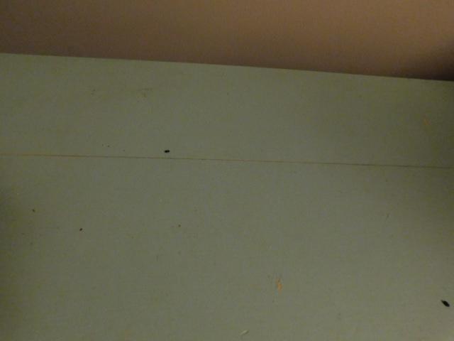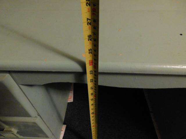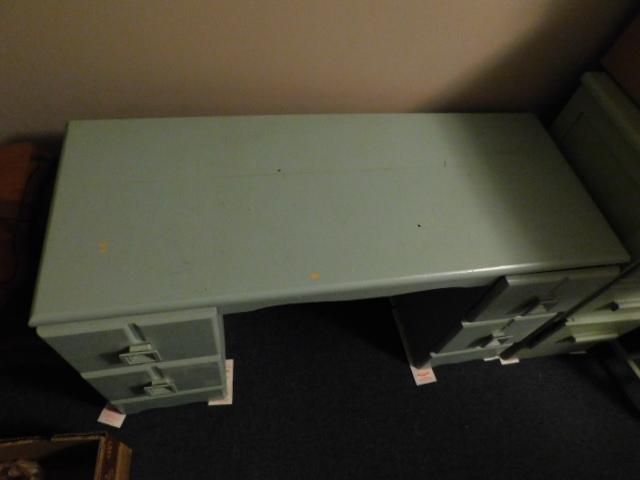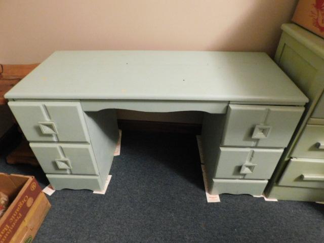 Vintage Solid Wood Four Drawer Vanity (No Mirror) has dry crack to surface but repairable. Some scratches and finish blemishes. Paintable