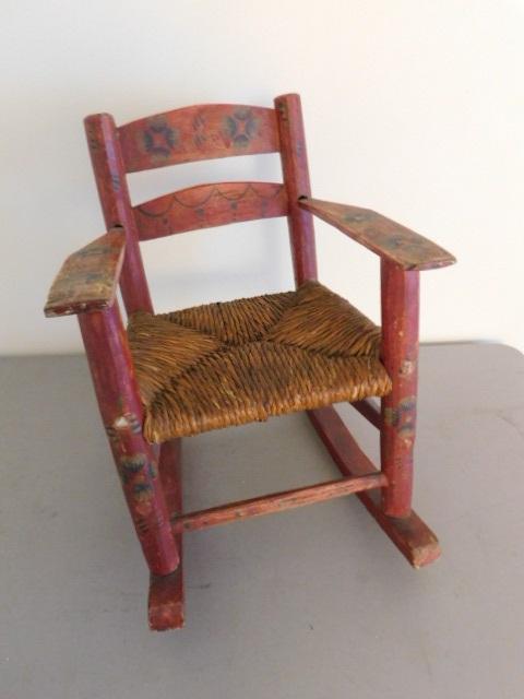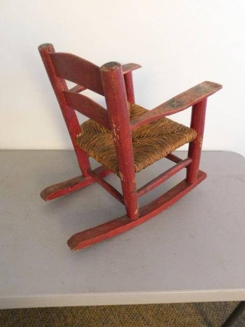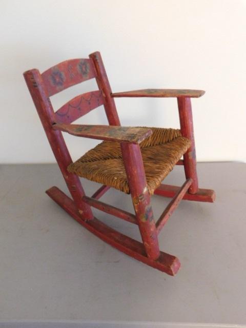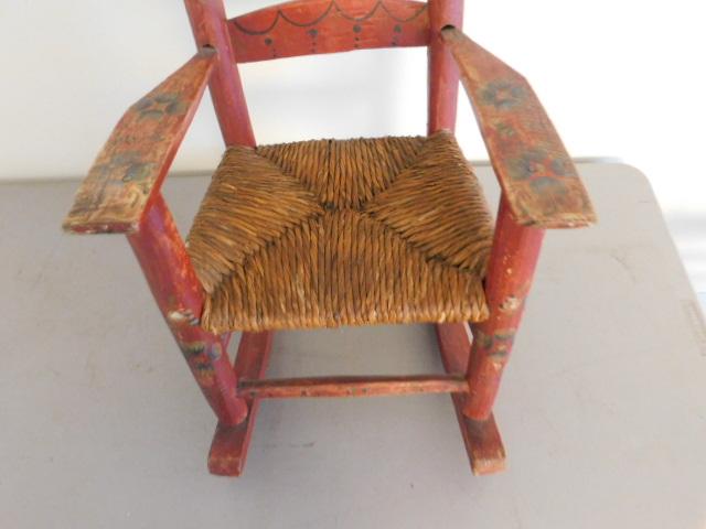 Vintage Solid Wood Frame Large Doll Rocker with Rush Seat and Hand Painted 18"