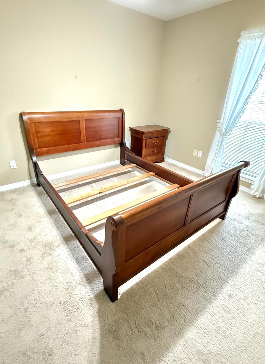 This listing includes the full sized bed frame and side table by Hooker Furniture. This matches the Hooker Dresser and Mirror that is also listed.