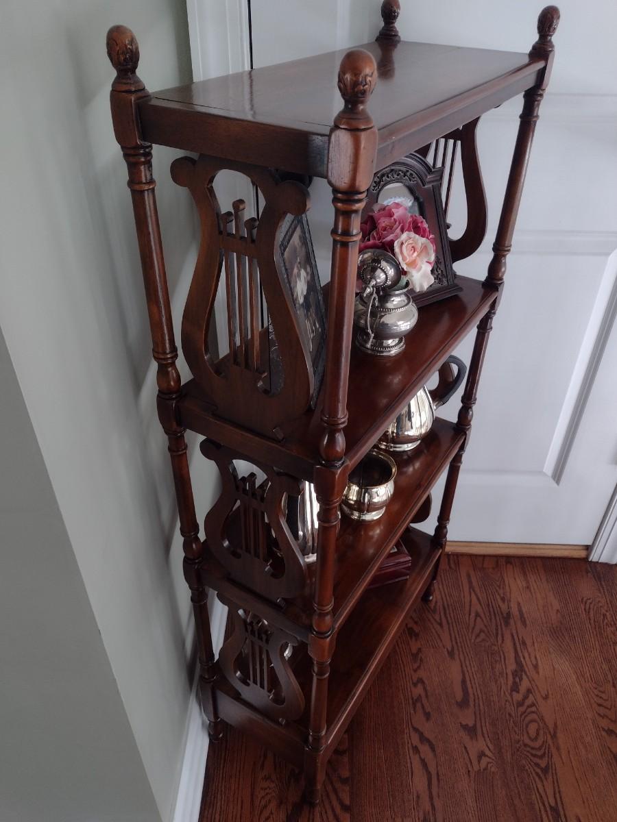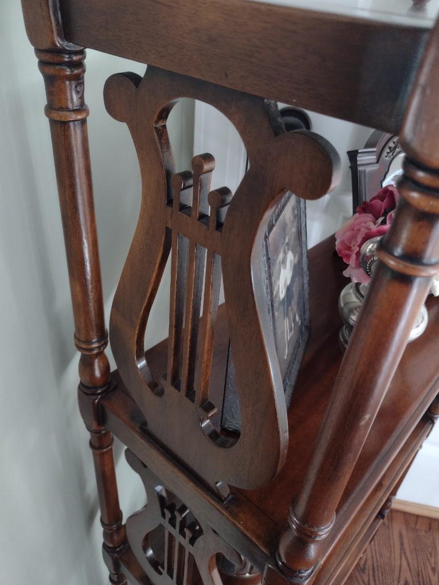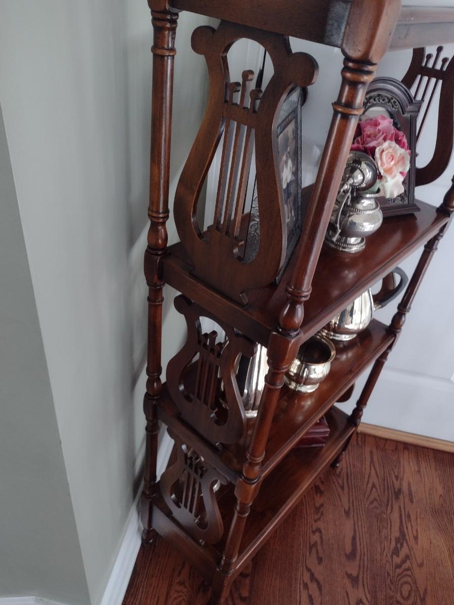 Vintage Solid Wood Mahogany Four-Tier Etagere with Decorative Harp Side Panels (No Contents). Upstairs item.
