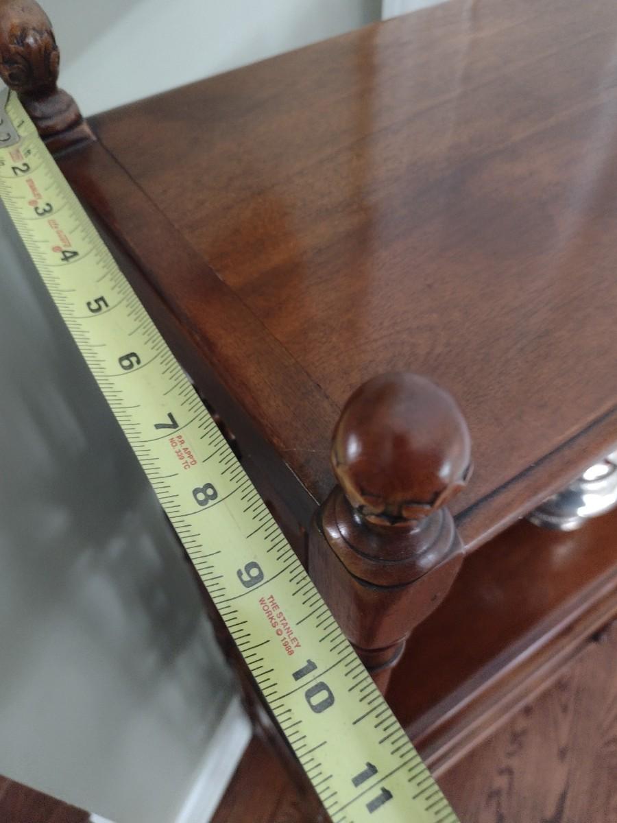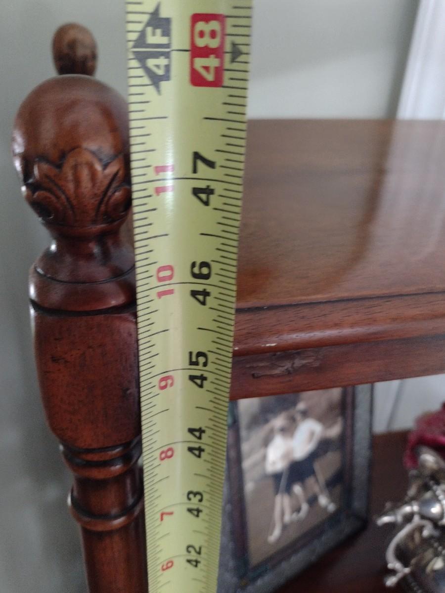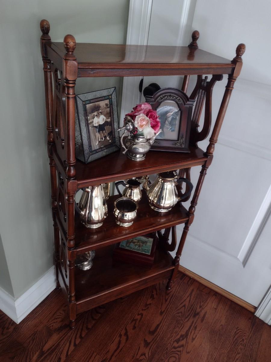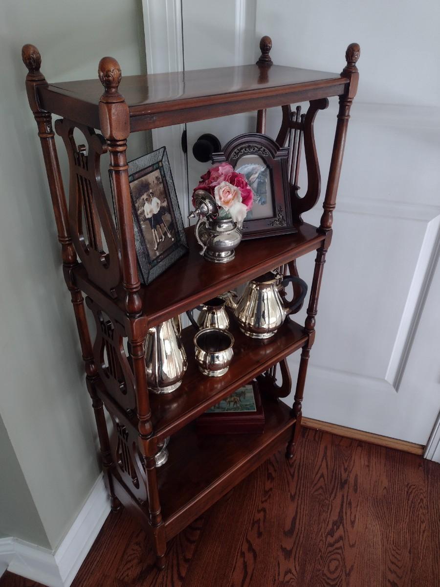 Vintage Solid Wood Mahogany Four-Tier Etagere with Decorative Harp Side Panels (No Contents). Upstairs item.