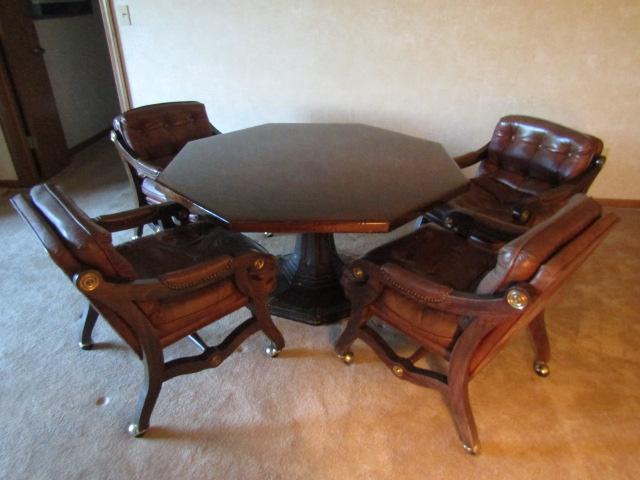 Vintage Solid Wood Octagonal Pedestal Table with 4 Leather Button Back Chairs 48"