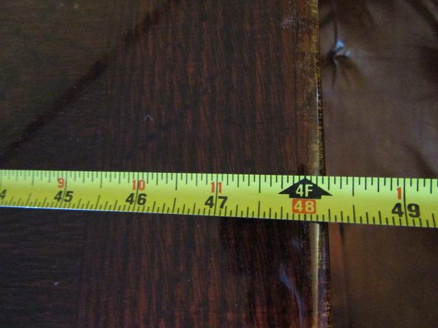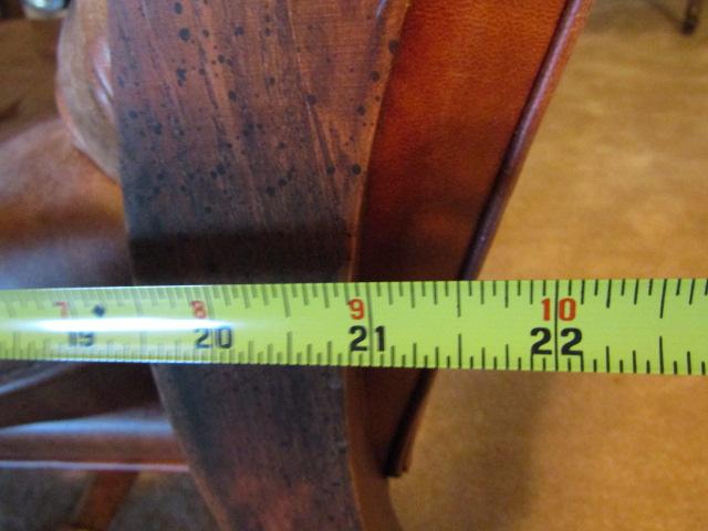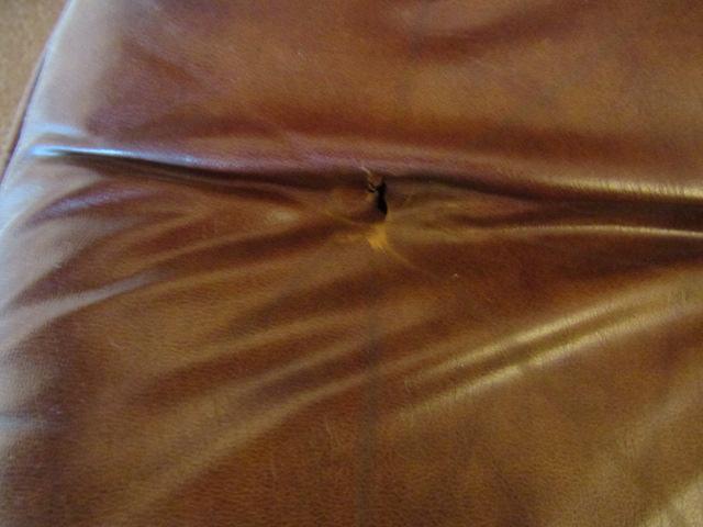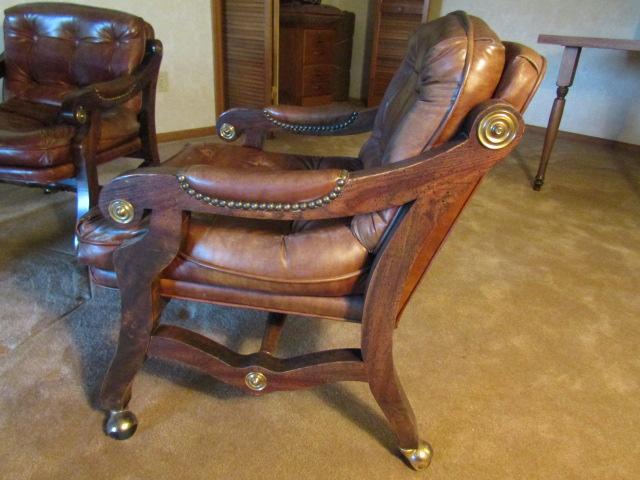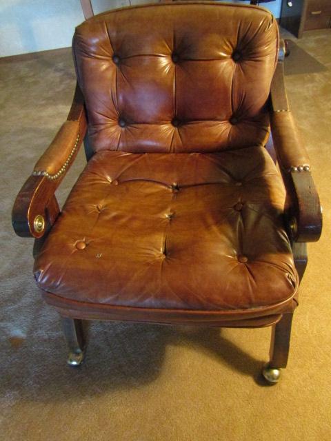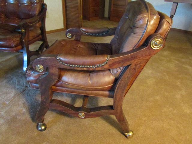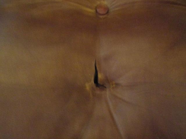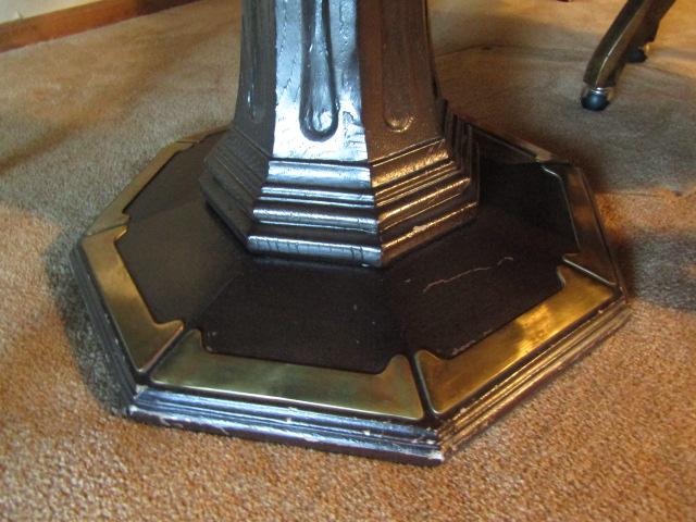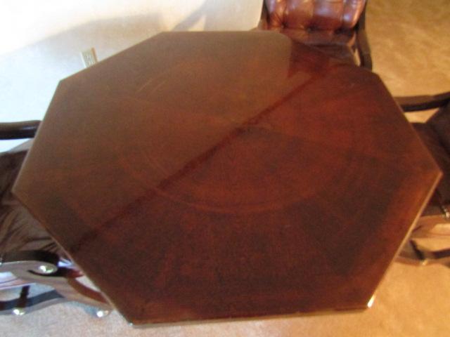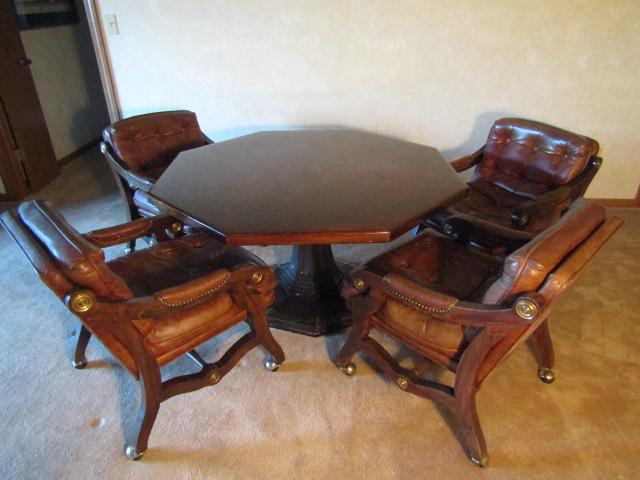 Vintage Solid Wood Octagonal Pedestal Table with 4 Leather Button Back Chairs 48" some of the chairs have missing buttons with open seams at those areas.