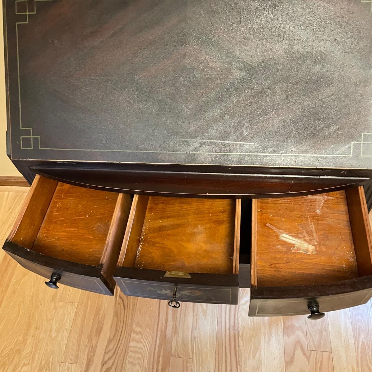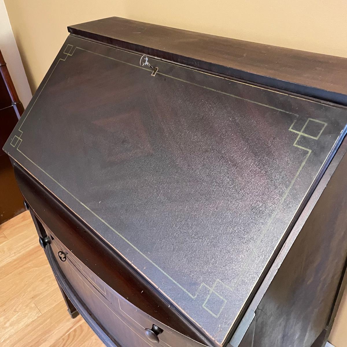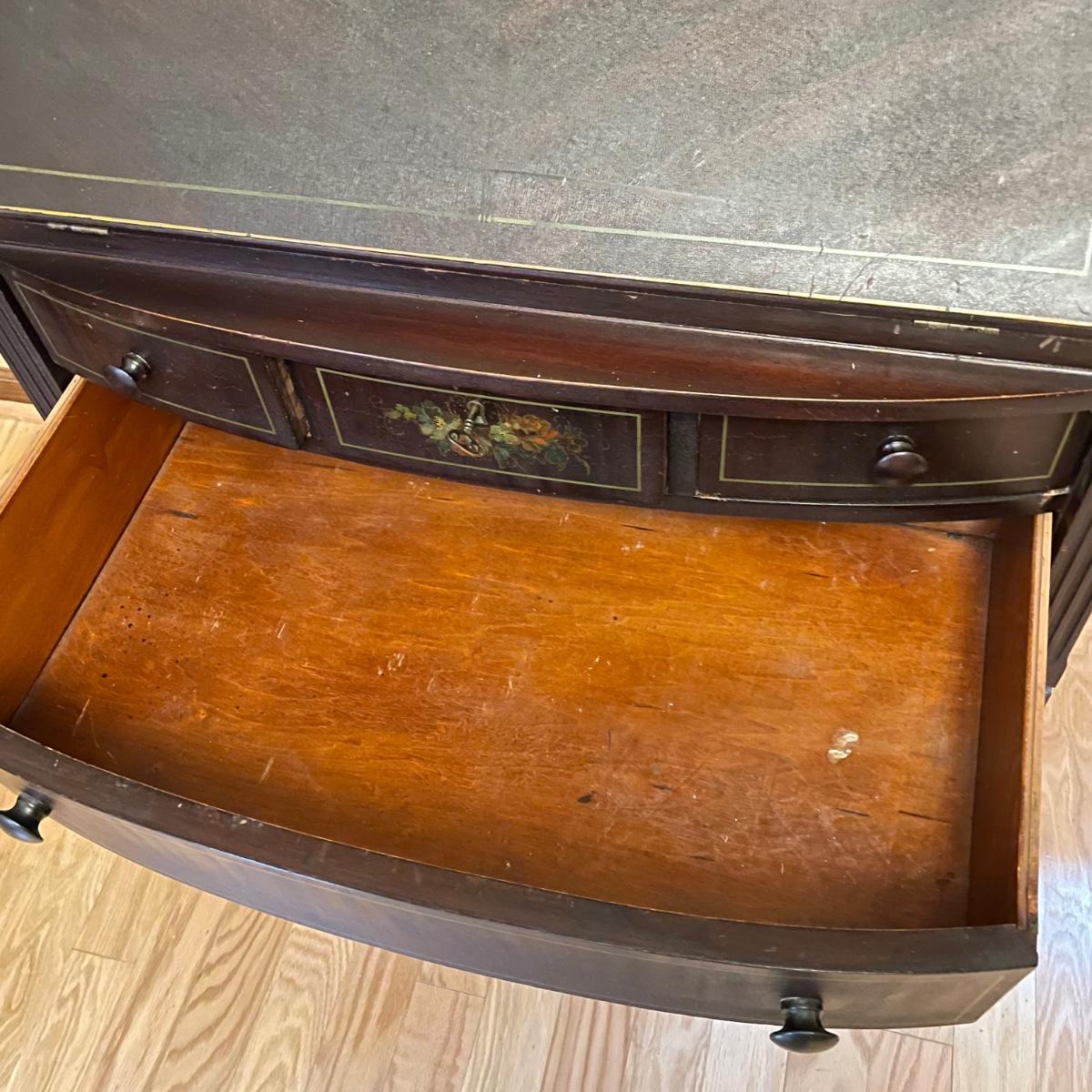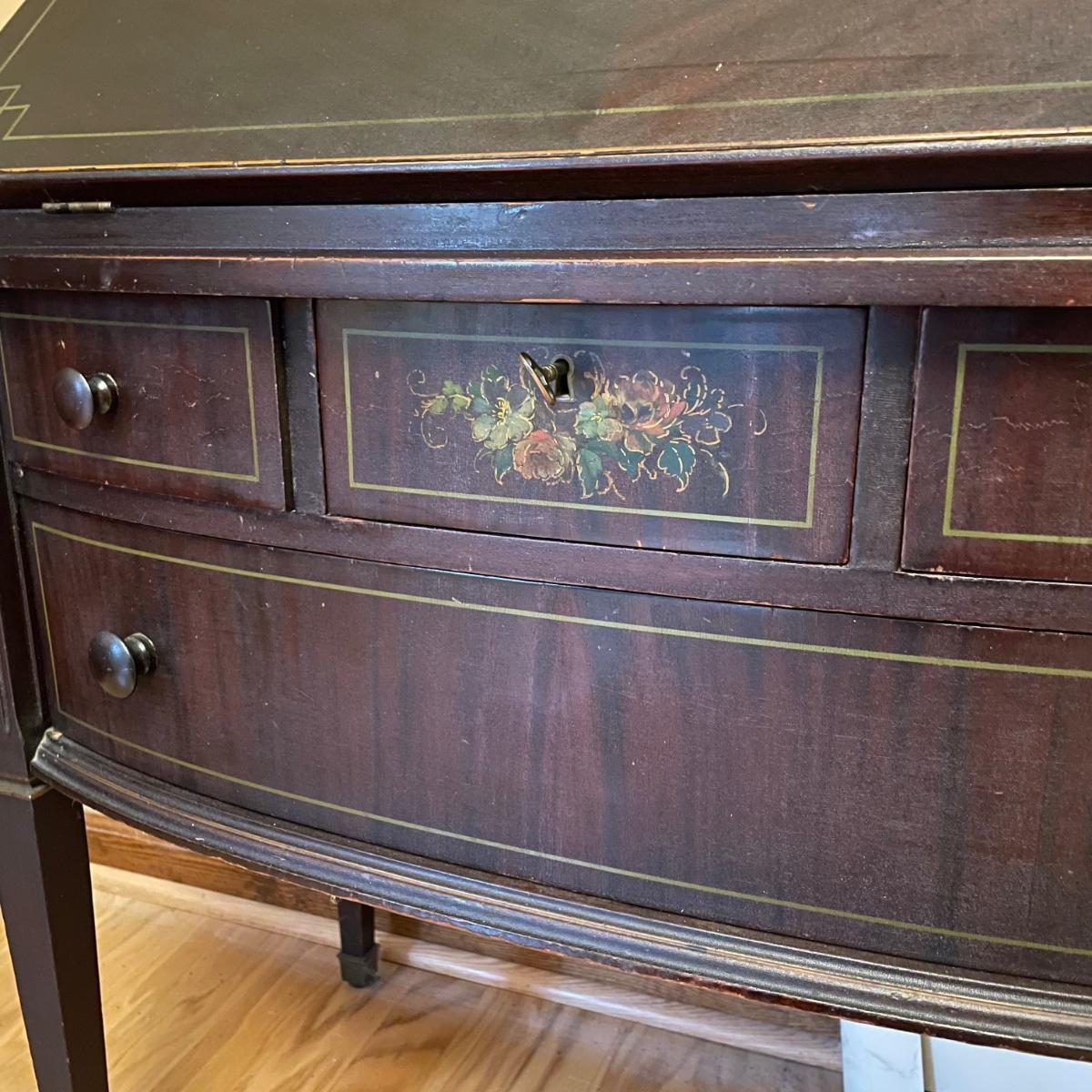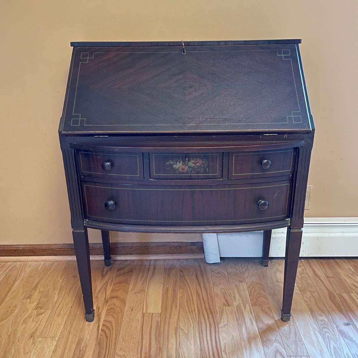 Stunning dark stained wooden secretary. Piece has crazing on the top and breakfront, giving a leather-like appearance. Piece hosts four dovetail drawers, plus two more small drawers inside. Piece shows some normal wear from age and use, see examples of scratches and wear shown in photos. There are two keys included for the painted floral drawer and the breakfront. Piece measures 33” x 18” x 41”H. Local pick up only. Winning bidder must bring assistance to help move and load this item due to its weight and/or size.