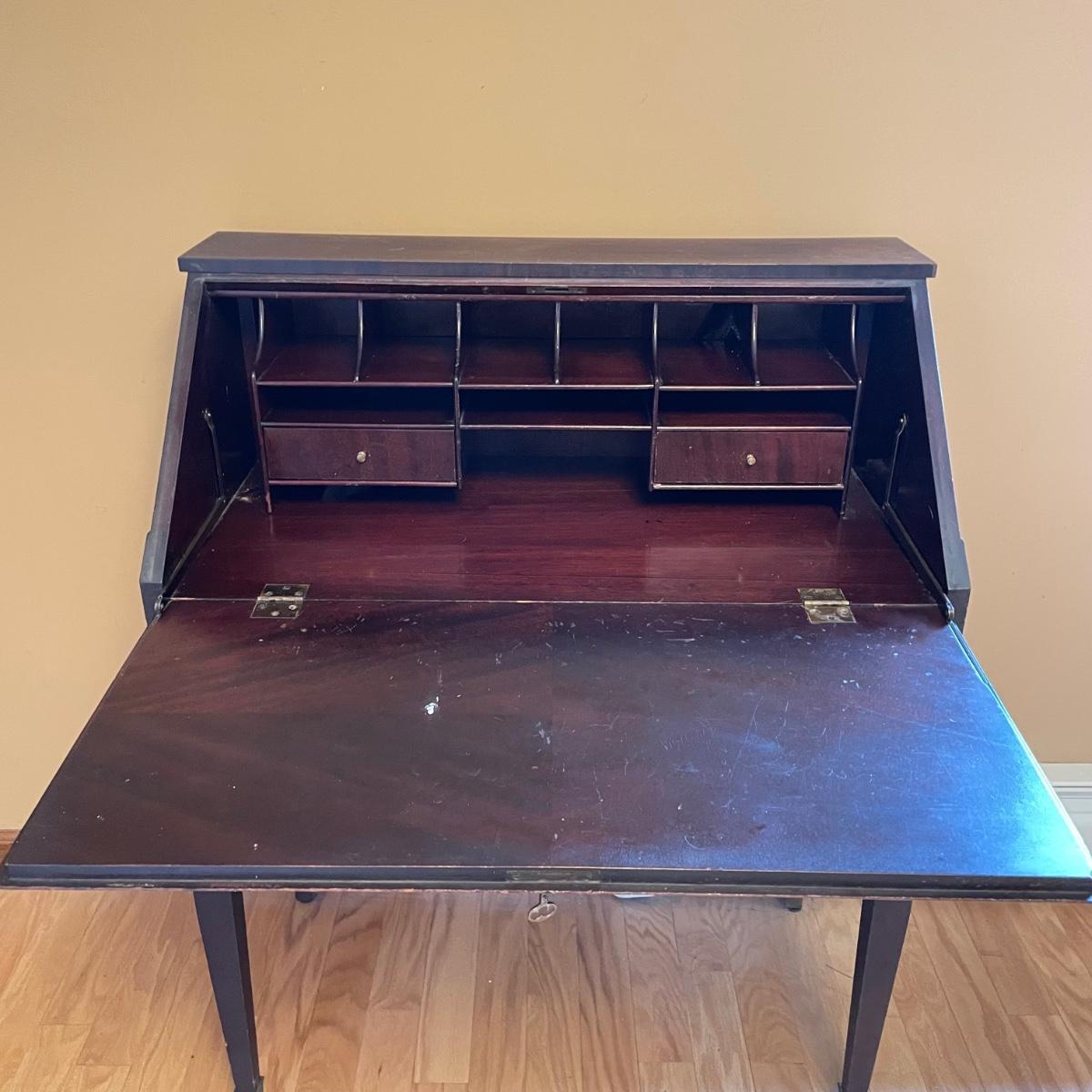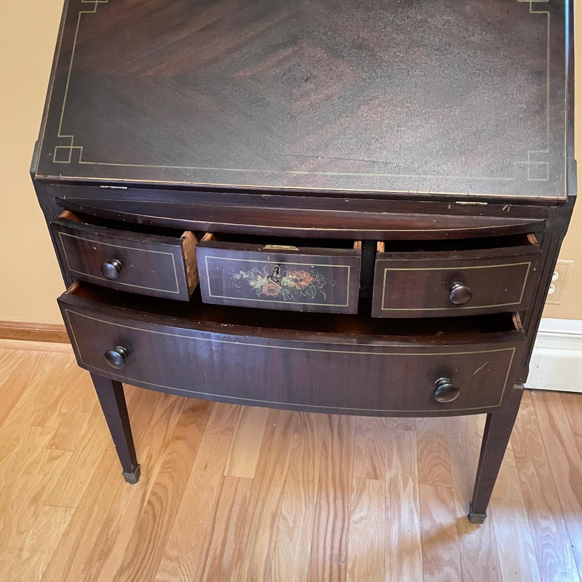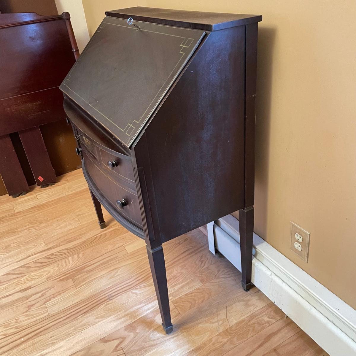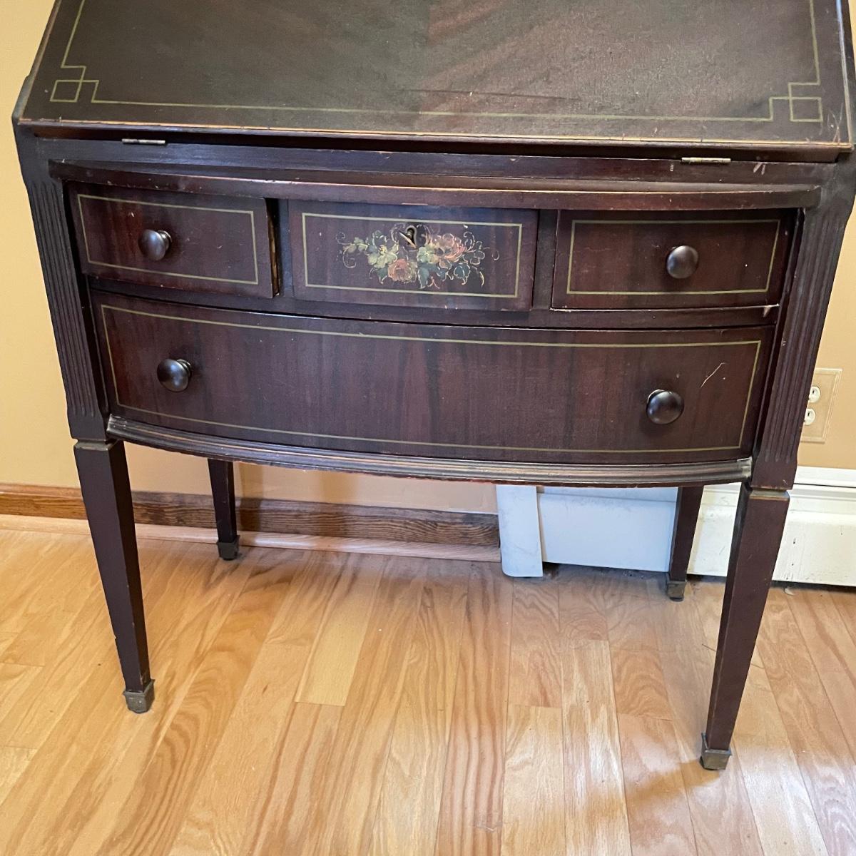 Stunning dark stained wooden secretary. Piece has crazing on the top and breakfront, giving a leather-like appearance. Piece hosts four dovetail drawers, plus two more small drawers inside. Piece shows some normal wear from age and use, see examples of scratches and wear shown in photos. There are two keys included for the painted floral drawer and the breakfront. Piece measures 33” x 18” x 41”H. Local pick up only. Winning bidder must bring assistance to help move and load this item due to its weight and/or size.