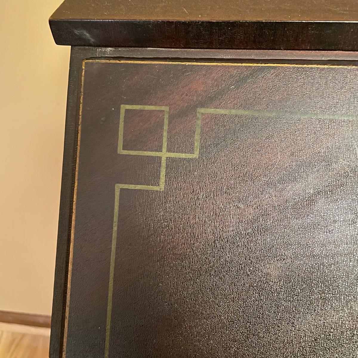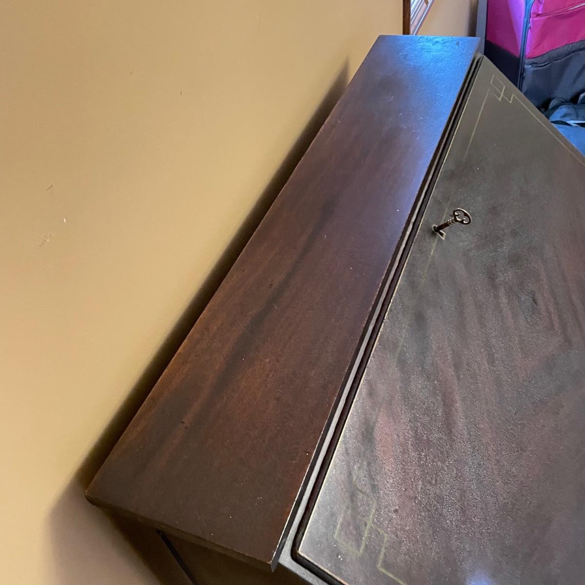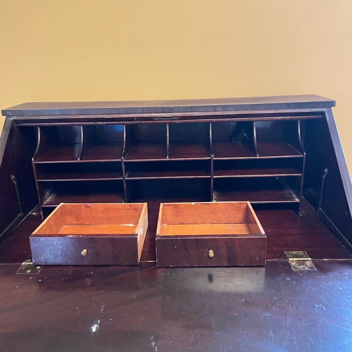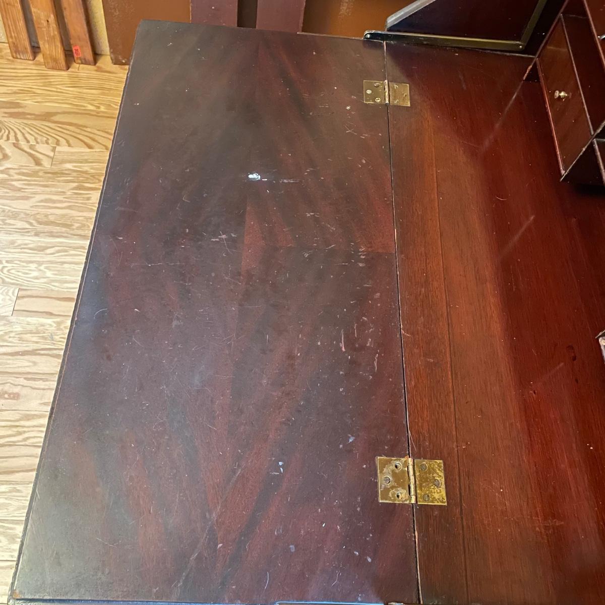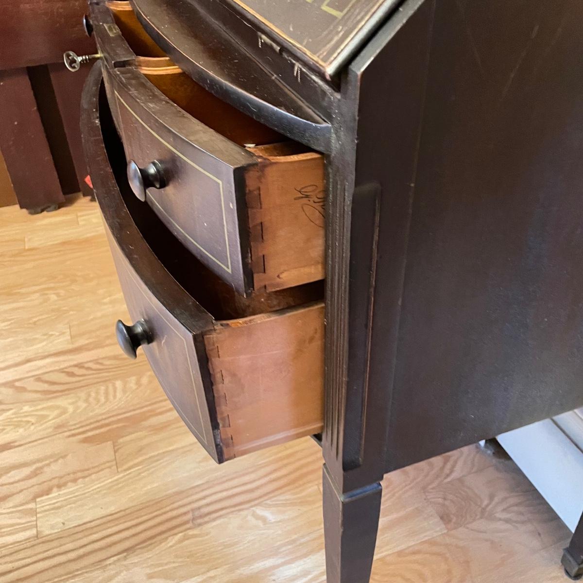 Stunning dark stained wooden secretary. Piece has crazing on the top and breakfront, giving a leather-like appearance. Piece hosts four dovetail drawers, plus two more small drawers inside. Piece shows some normal wear from age and use, see examples of scratches and wear shown in photos. There are two keys included for the painted floral drawer and the breakfront. Piece measures 33” x 18” x 41”H. Local pick up only. Winning bidder must bring assistance to help move and load this item due to its weight and/or size.