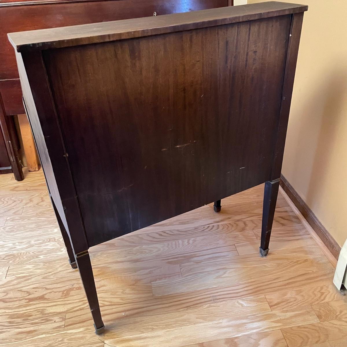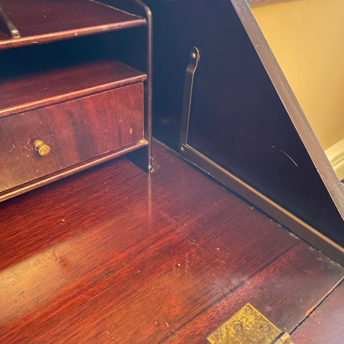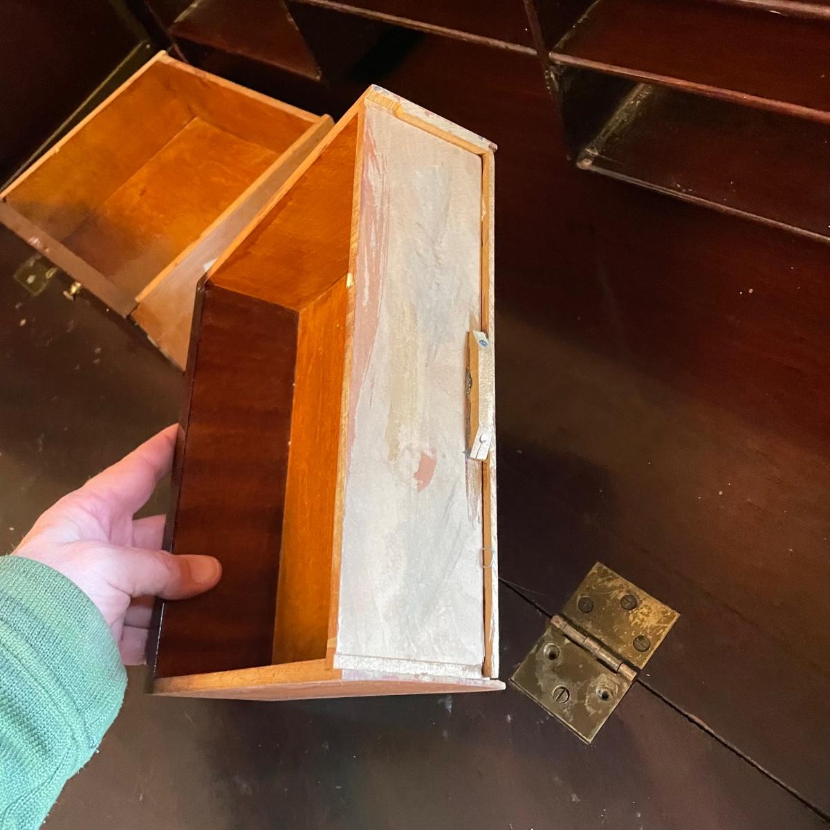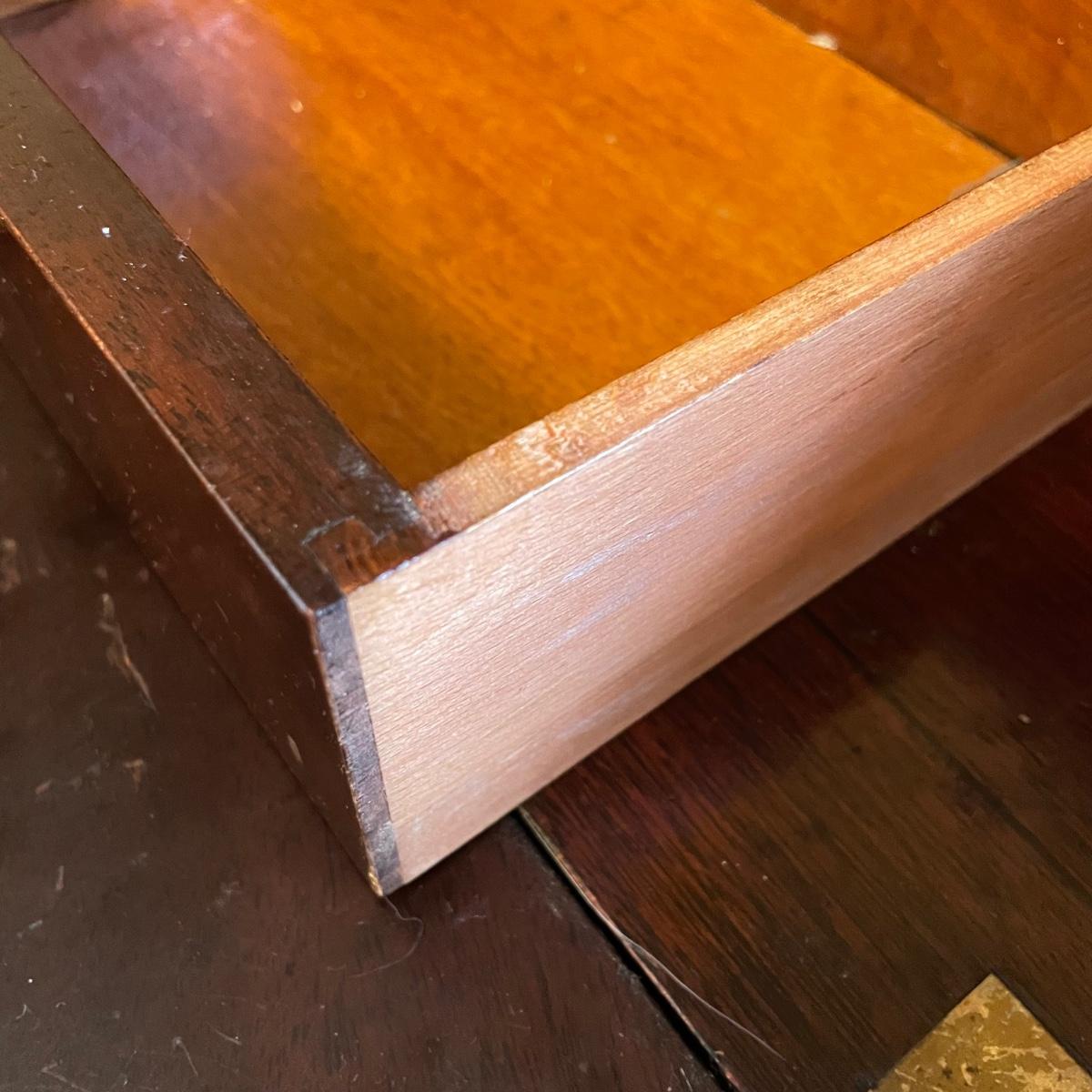 Stunning dark stained wooden secretary. Piece has crazing on the top and breakfront, giving a leather-like appearance. Piece hosts four dovetail drawers, plus two more small drawers inside. Piece shows some normal wear from age and use, see examples of scratches and wear shown in photos. There are two keys included for the painted floral drawer and the breakfront. Piece measures 33” x 18” x 41”H. Local pick up only. Winning bidder must bring assistance to help move and load this item due to its weight and/or size.