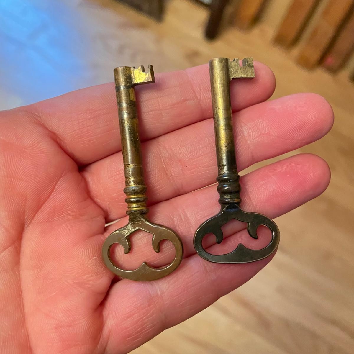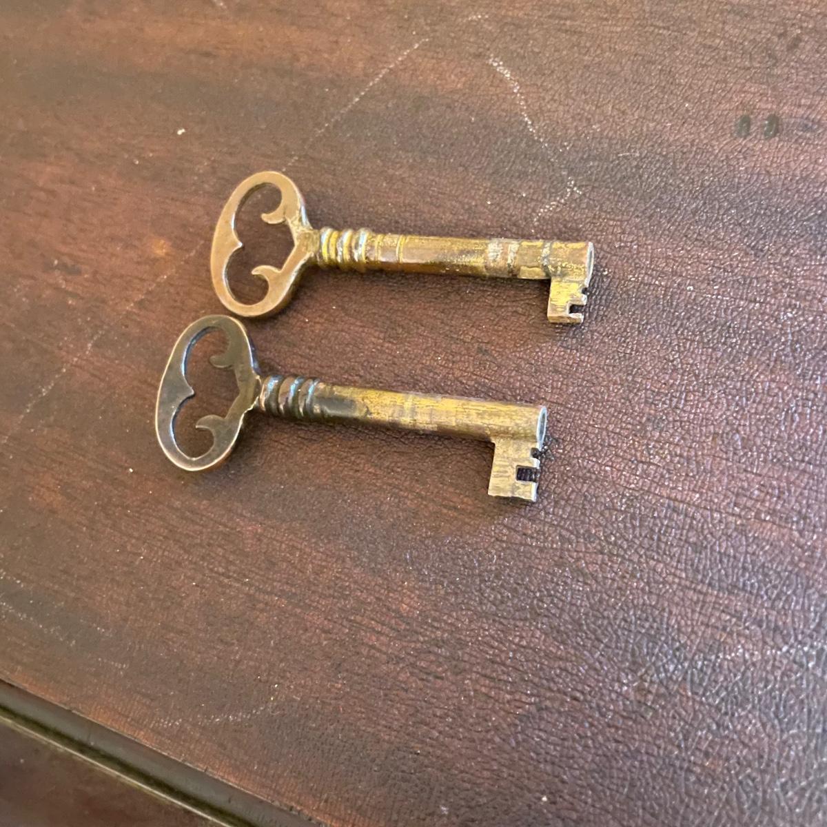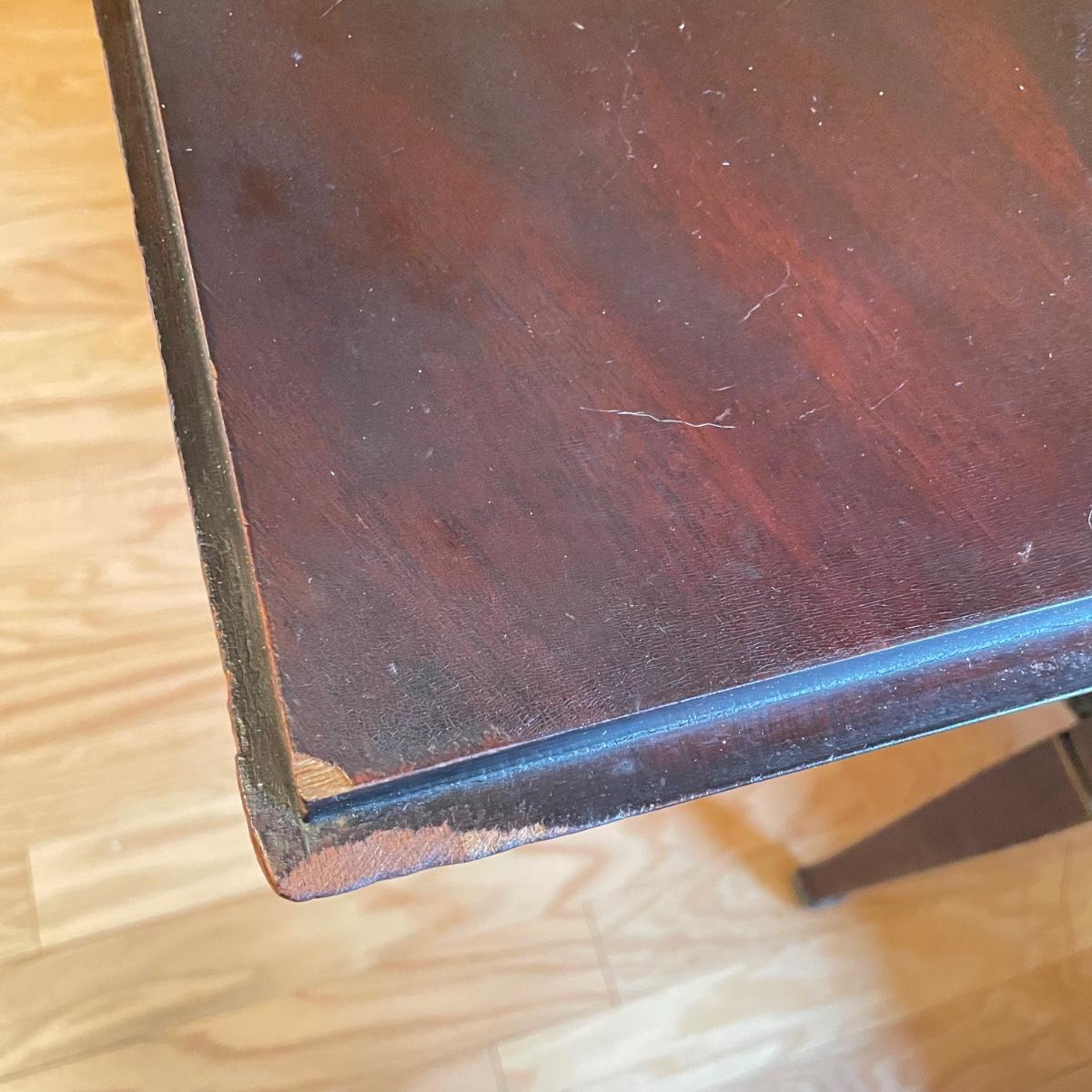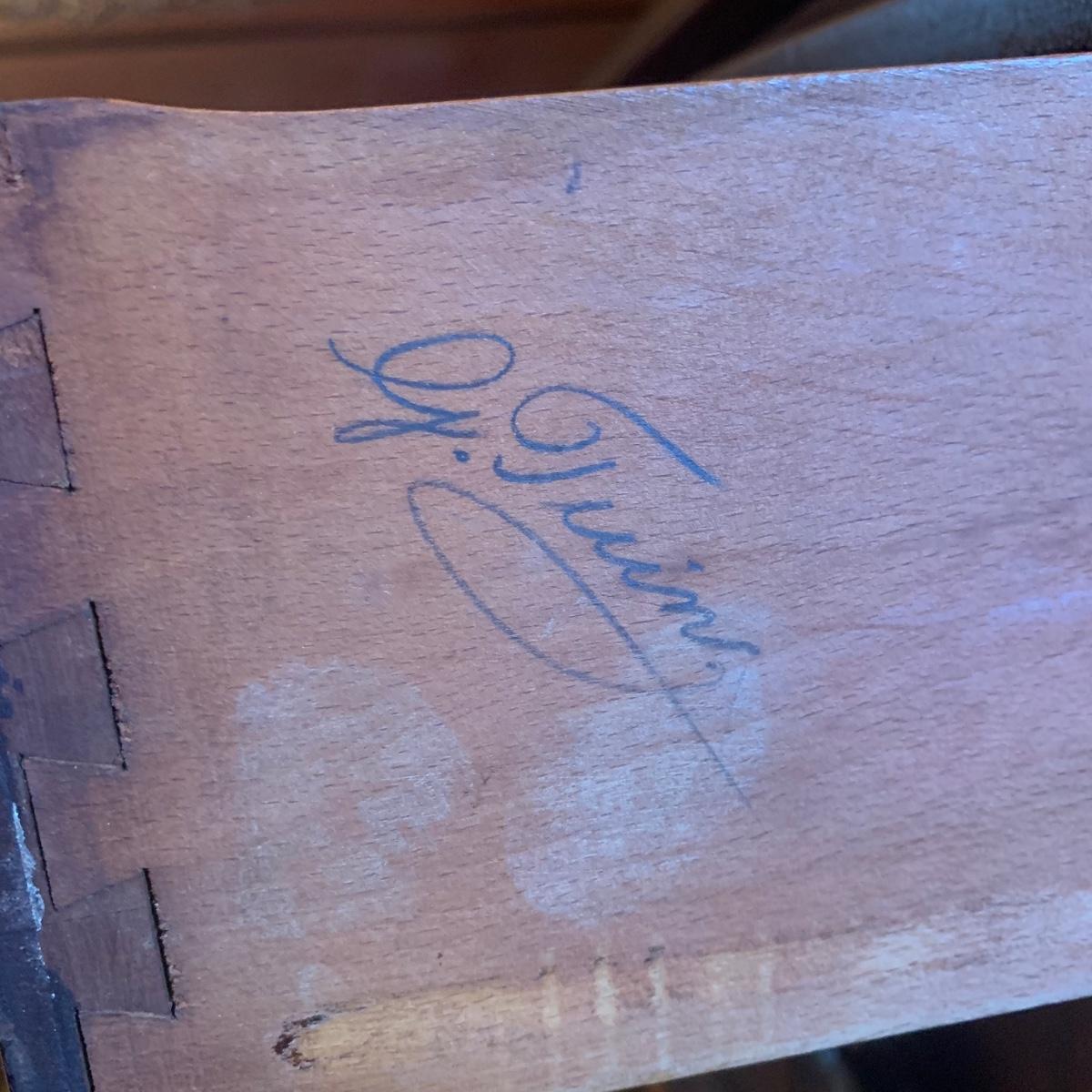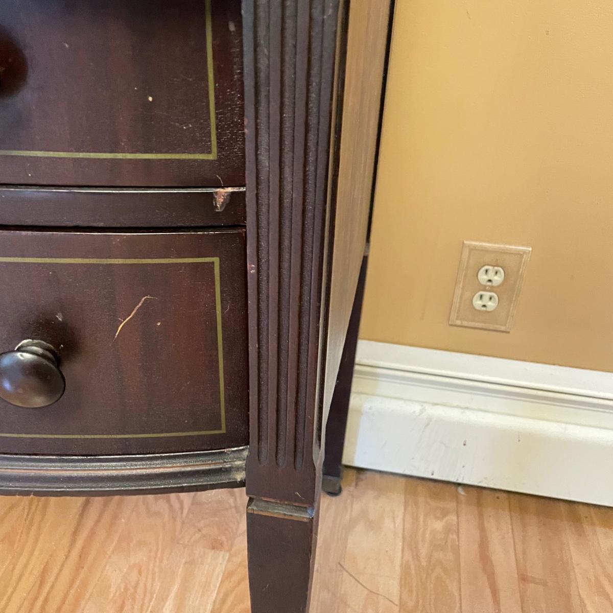 Stunning dark stained wooden secretary. Piece has crazing on the top and breakfront, giving a leather-like appearance. Piece hosts four dovetail drawers, plus two more small drawers inside. Piece shows some normal wear from age and use, see examples of scratches and wear shown in photos. There are two keys included for the painted floral drawer and the breakfront. Piece measures 33” x 18” x 41”H. Local pick up only. Winning bidder must bring assistance to help move and load this item due to its weight and/or size.