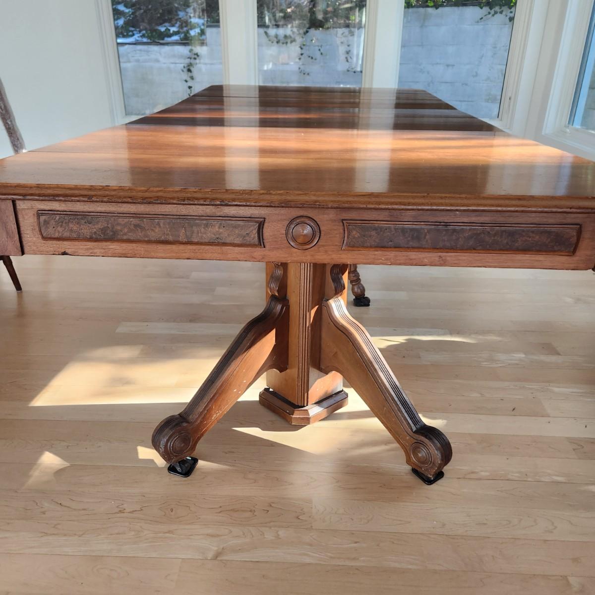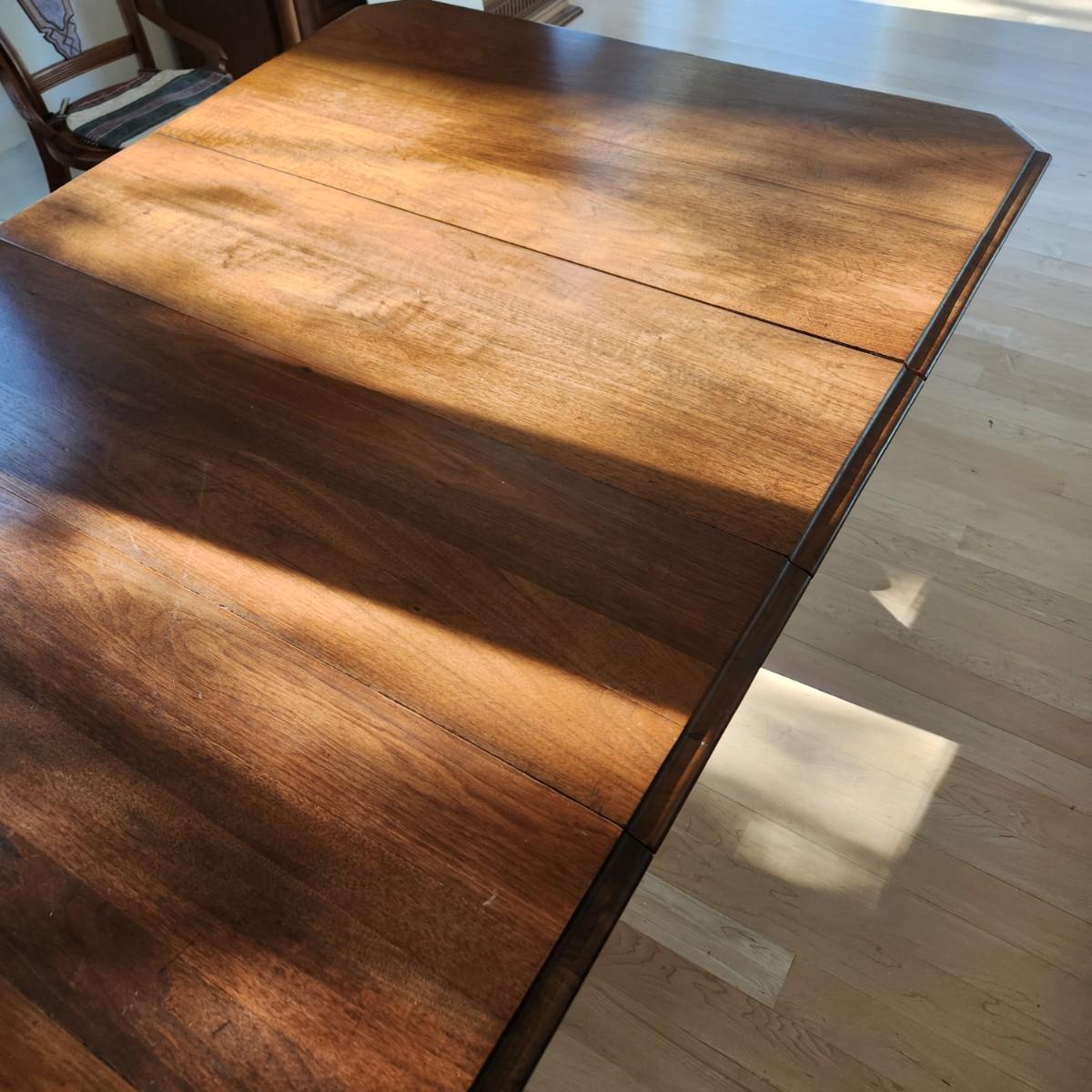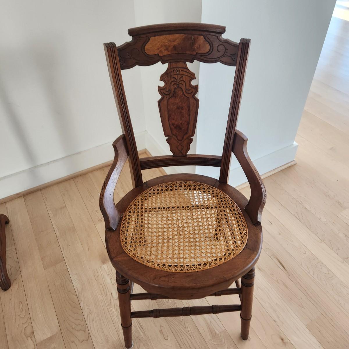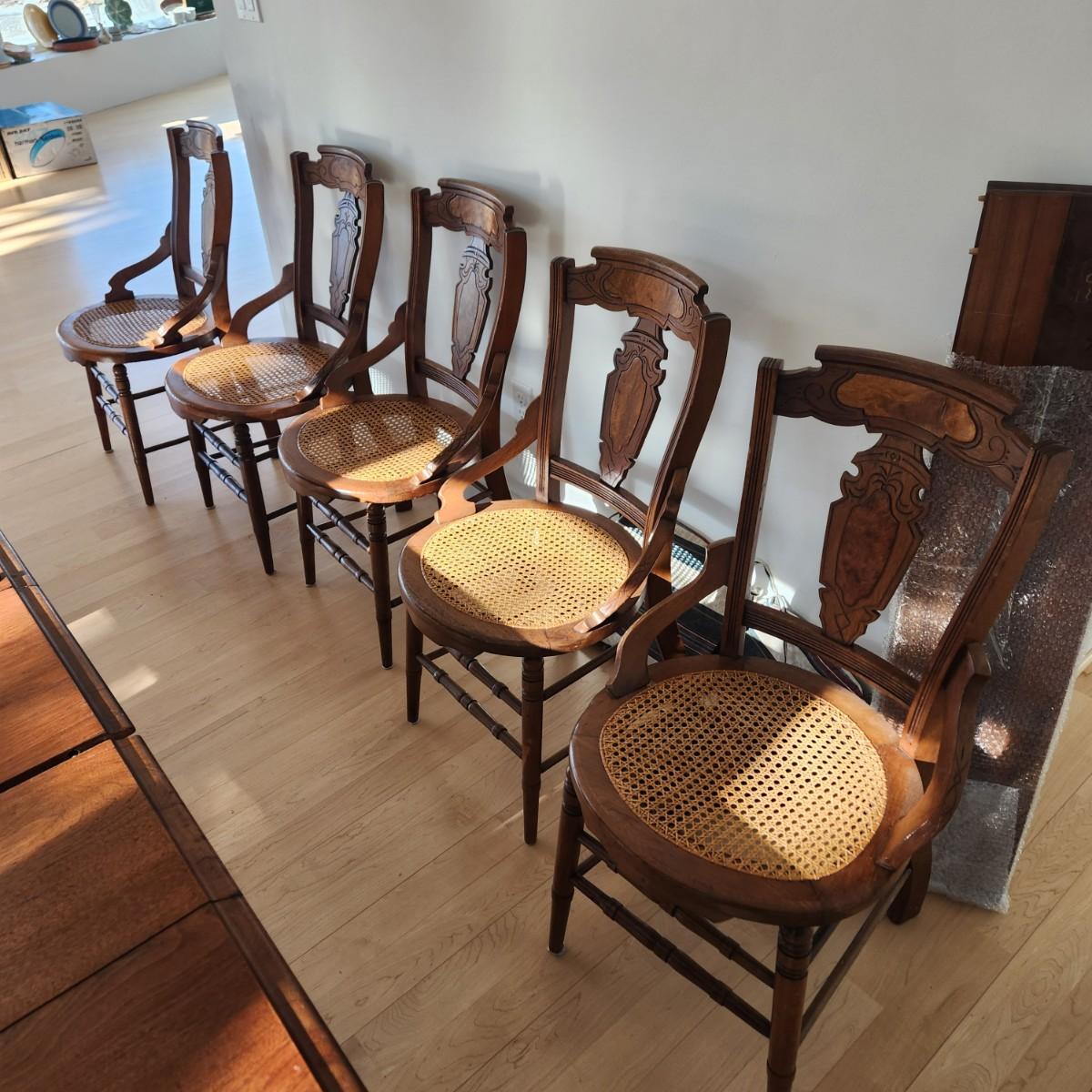 Antique Walnut Dining Table & 5 Cane Seat Chairs 46"X46" w 4 / 12" leaves & 2 / 9 " Leaves