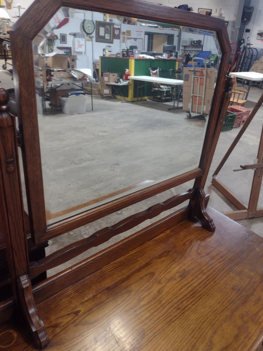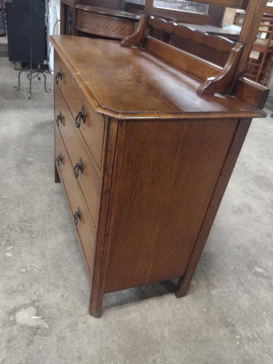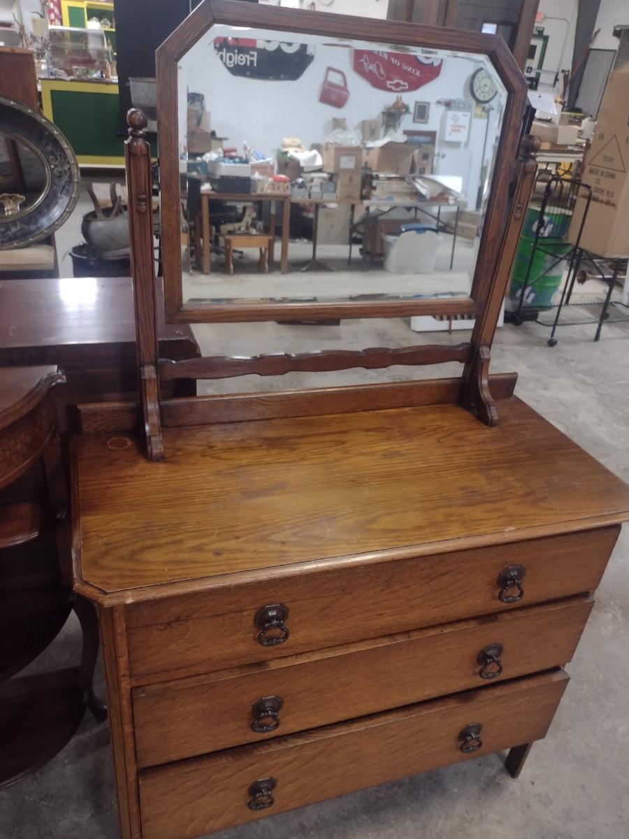 Vintage Solid Wood Three Drawer Dresser with Mirror. Please see all pictures for condition of finish. Item measures approx 39" wide, 18" deep, 32" tall. Height to top of mirror is approx 59 1/2". Mirror measures approx 25" x 19".