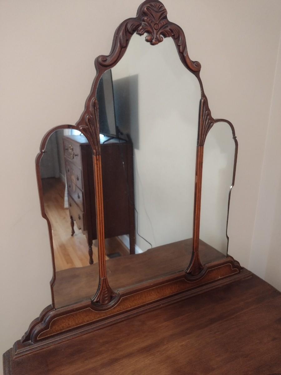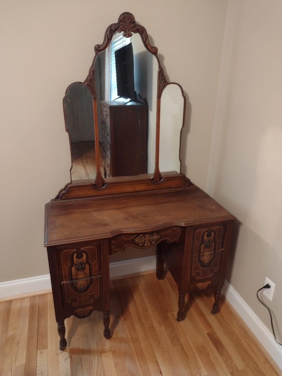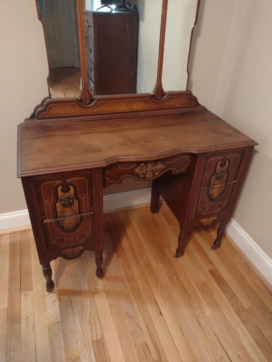 Vintage Solid Wood Vanity Dresser with Stylish Three Panel Mirror