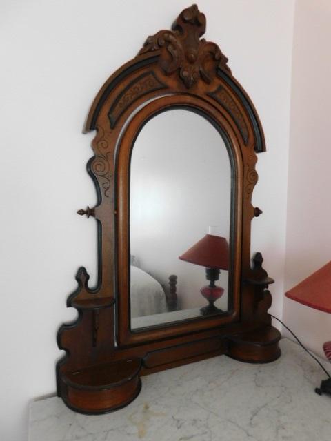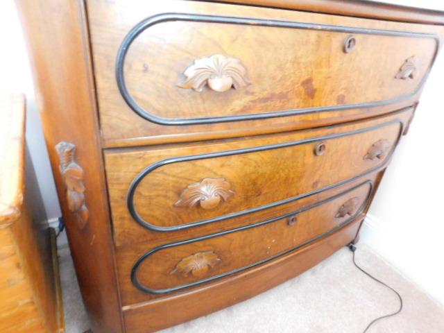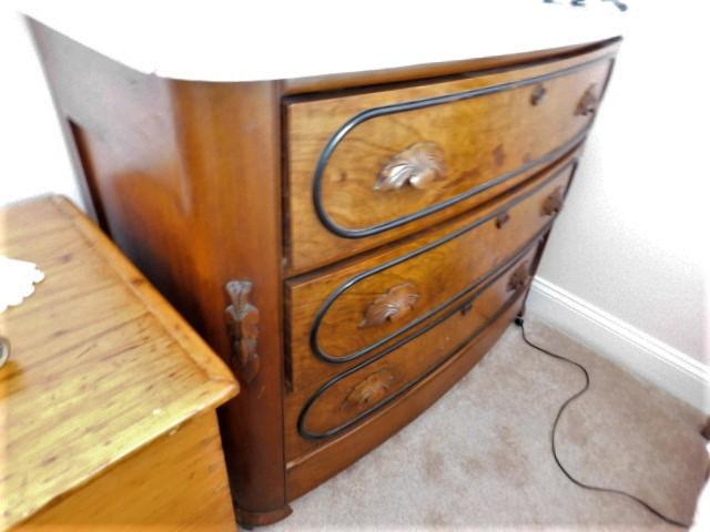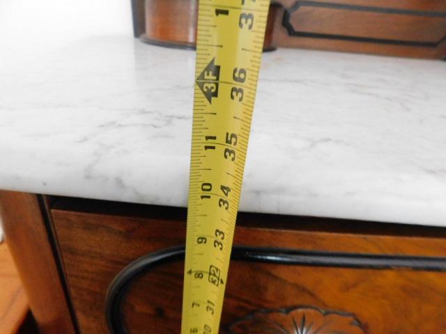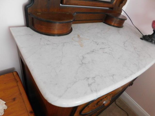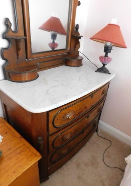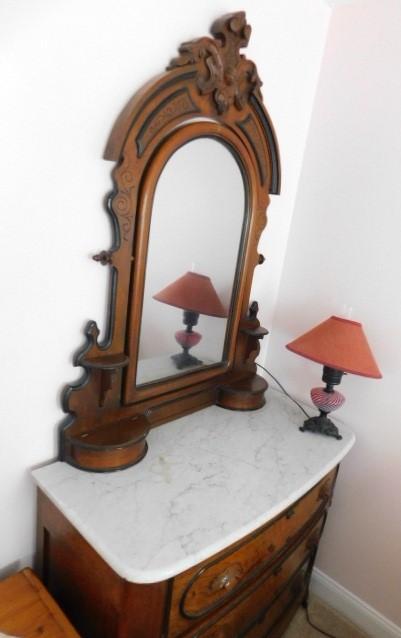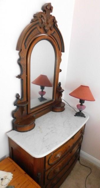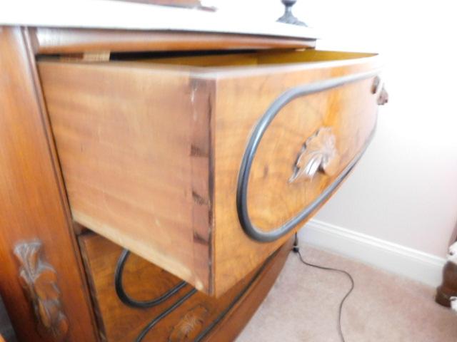 Vintage Solid Wood Walnut Chest of Drawers with Mirror and Marble Top this is a downstairs item.