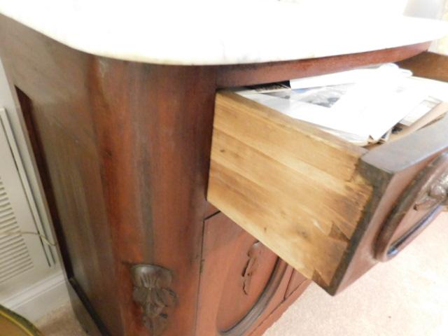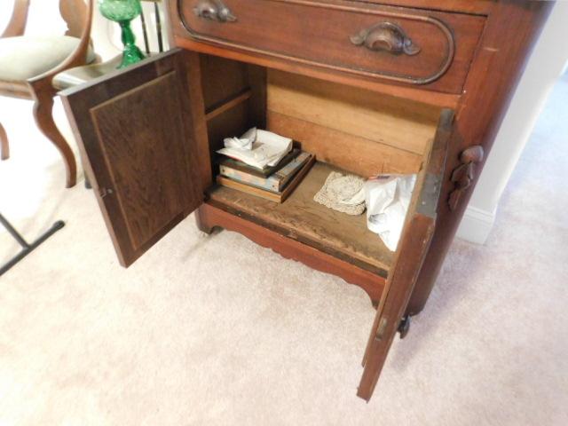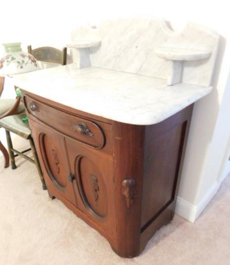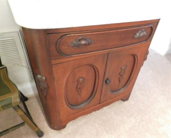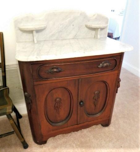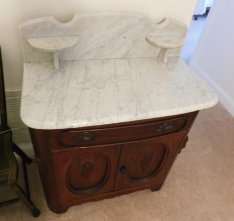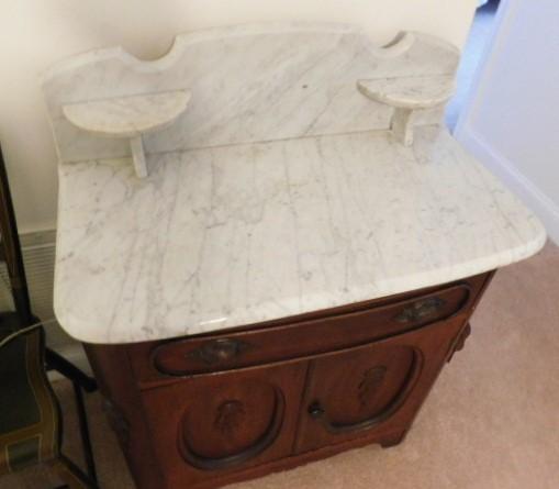 Vintage Solid Wood Walnut Commode or Wash Stand with Mable Top this is a down stairs item