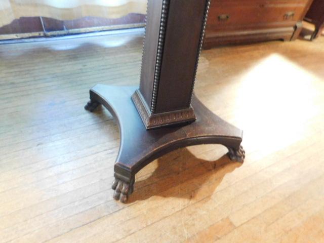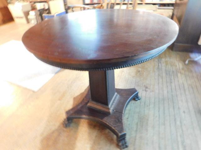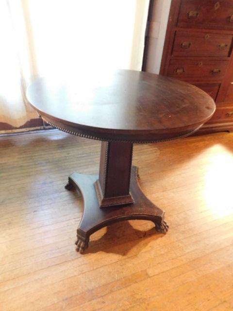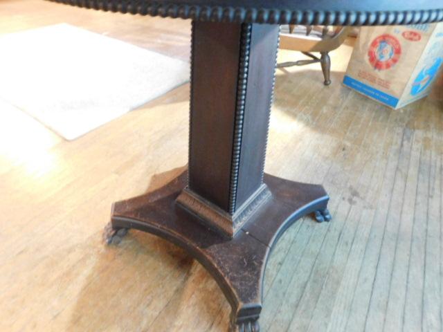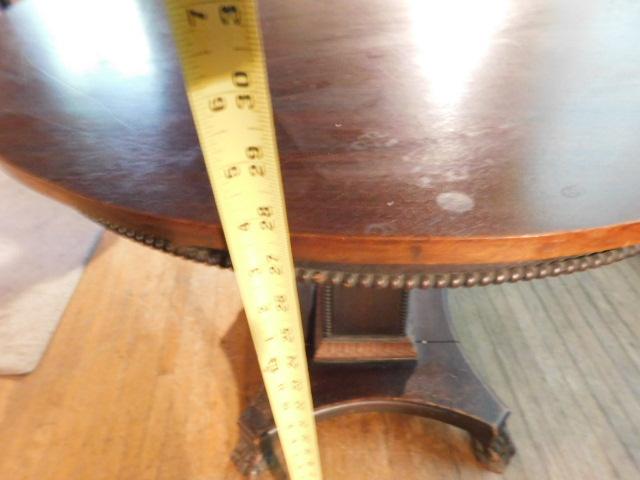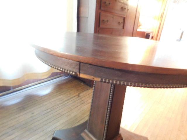 Vintage Solid Wood Walnut Round Pedestal Table has some trim missing as shown. Expect some scratches or wear to the finish.