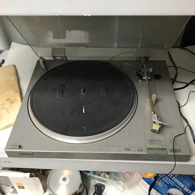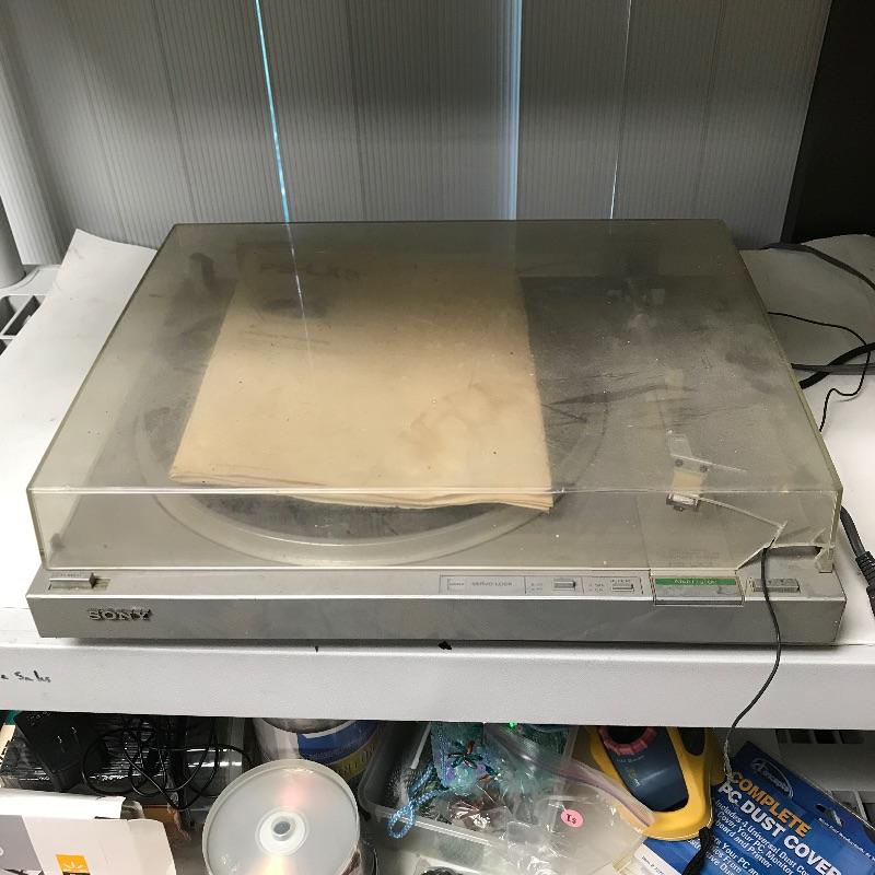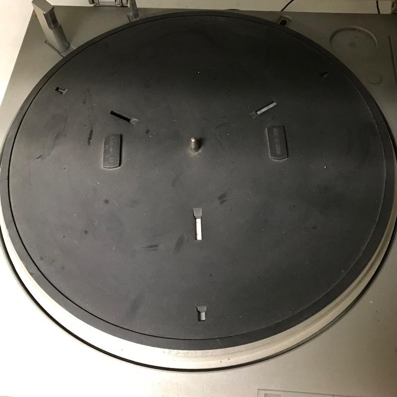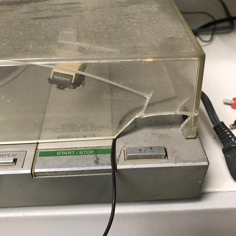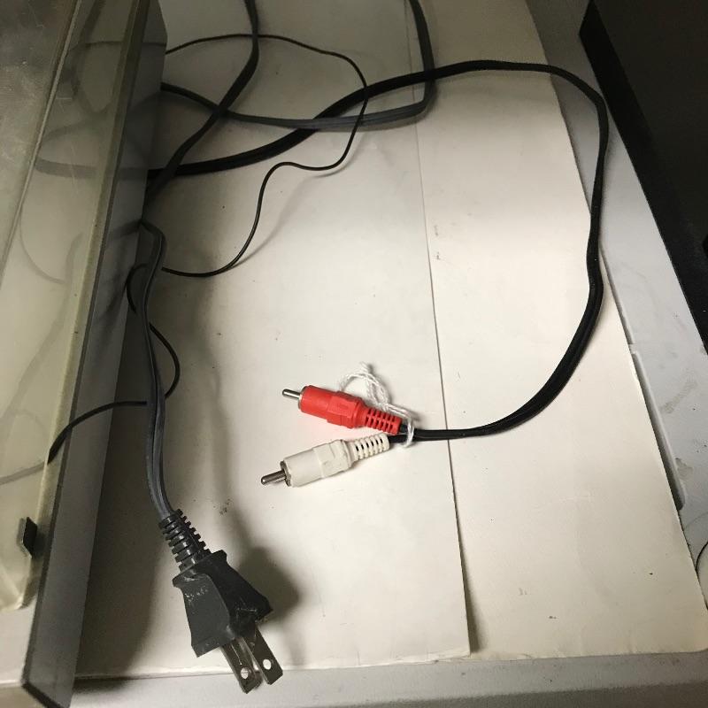 Record player has not been fully tested. Powers up and platter turns, but the 45 adaptor, needle and tone arm counterweights are missing. There is a crack, and broken portion of the dust cover in the bottom right corner; see pictures. Includes original instruction manual, & audio cables. Recommend it only be bought for parts.