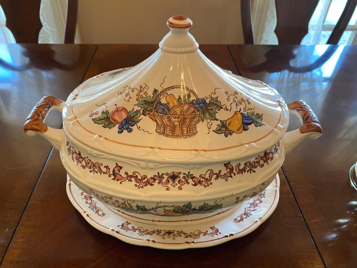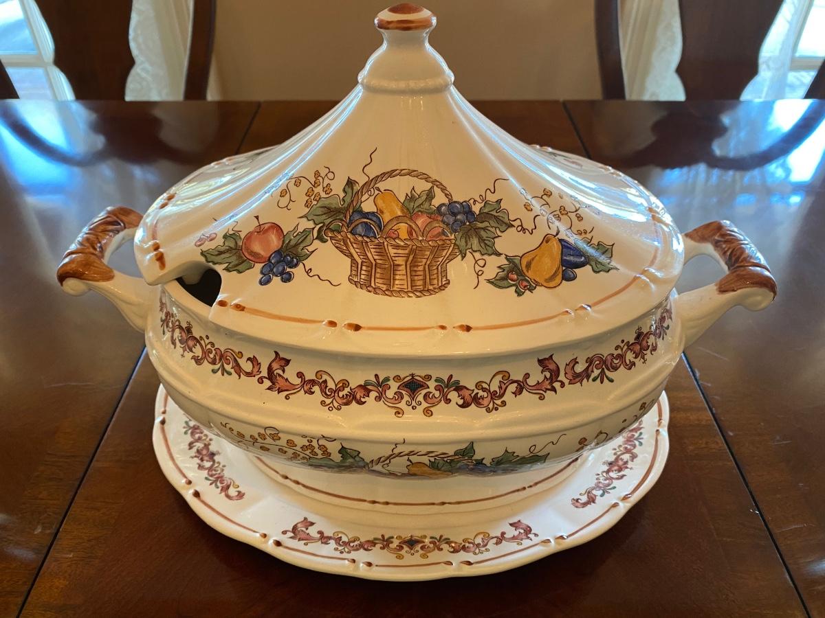 Vintage soup terrine, harvest fruit basket pattern. Excellent condition. Approx 11h x 14-1/2w