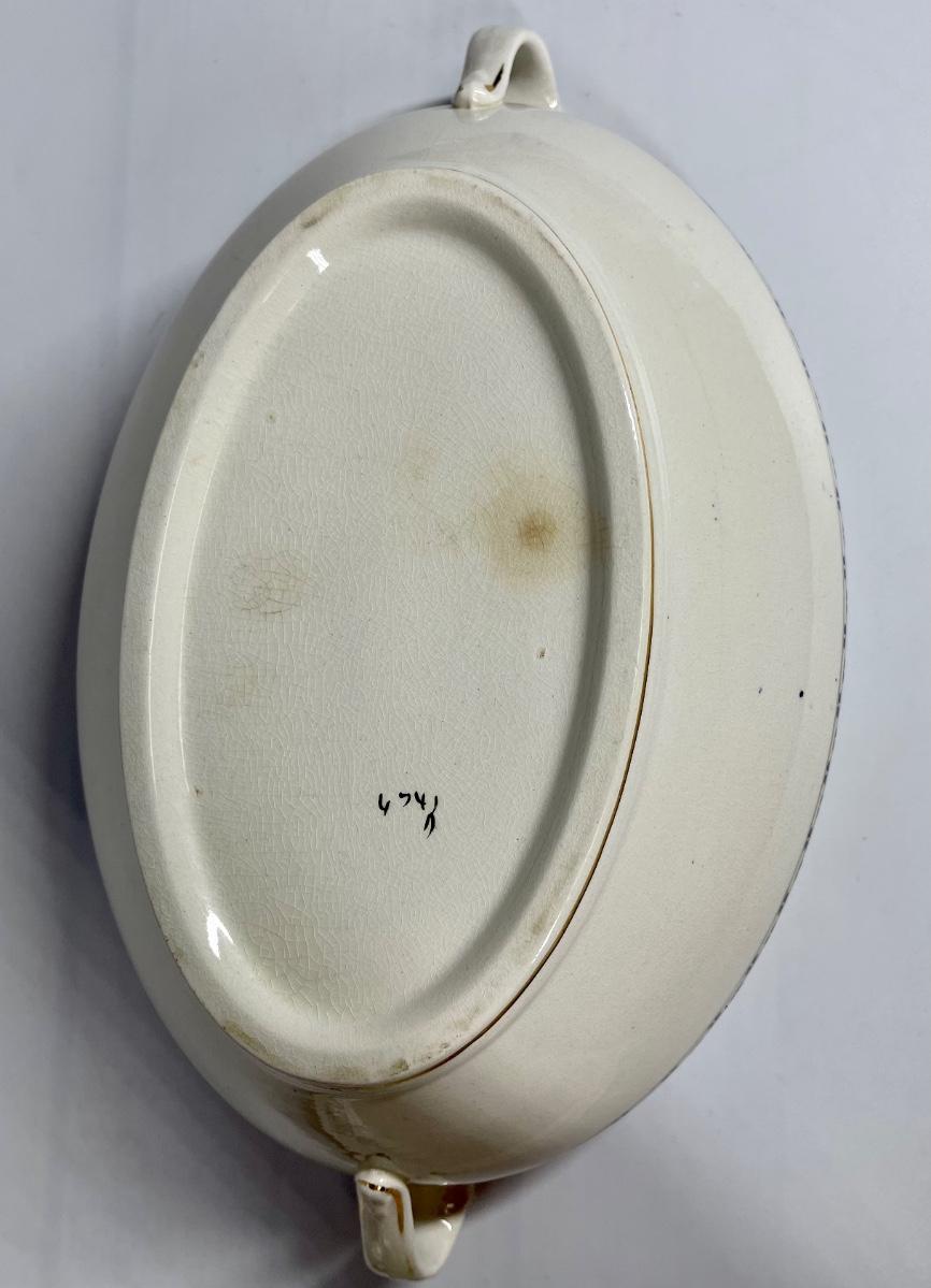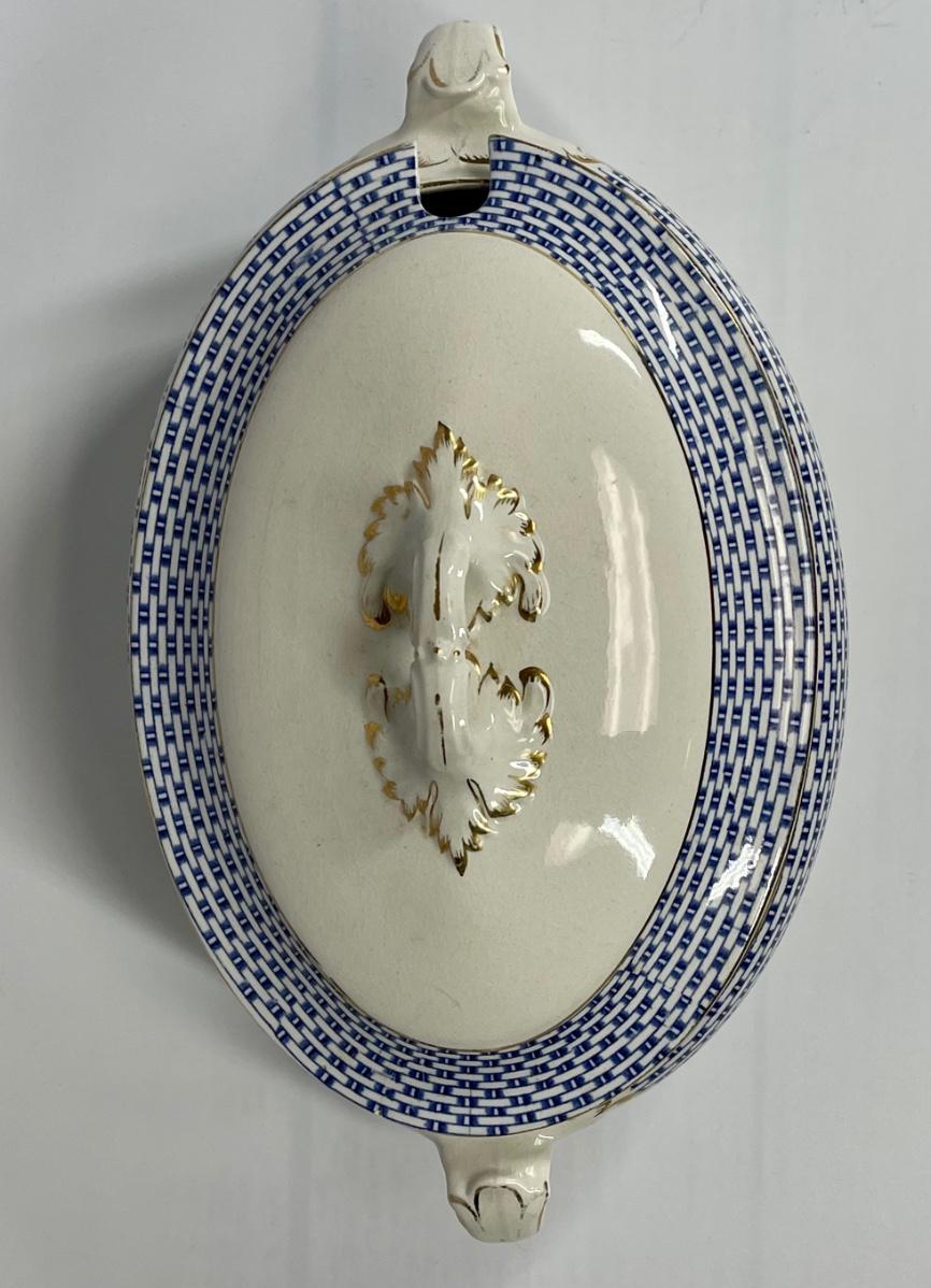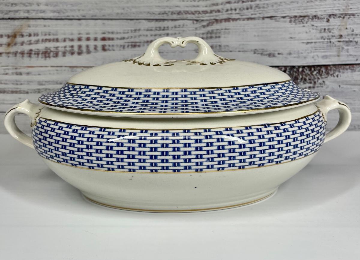 Vintage soup tureen, blue and white basket weave pattern with gold trim This soup tureen is in good condition with the exception of some of the gold leaf rubbed off in a few places and a small crazy spot on the bottom of the inside.