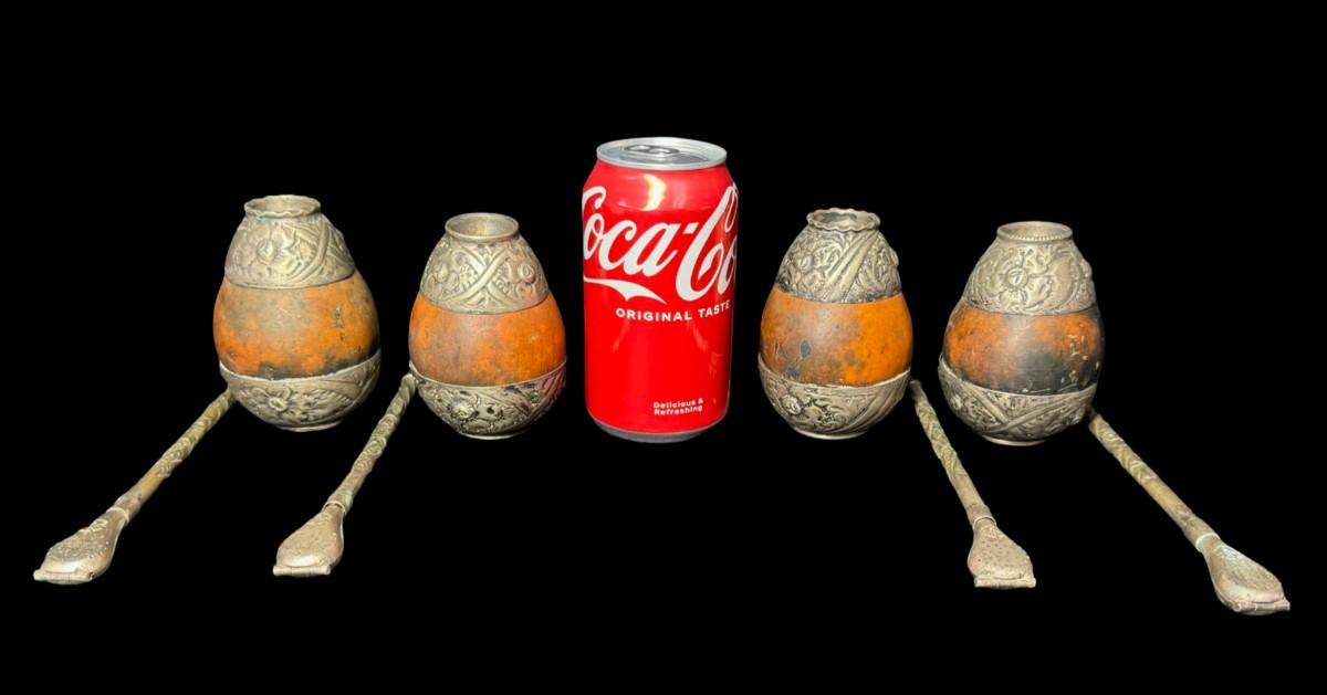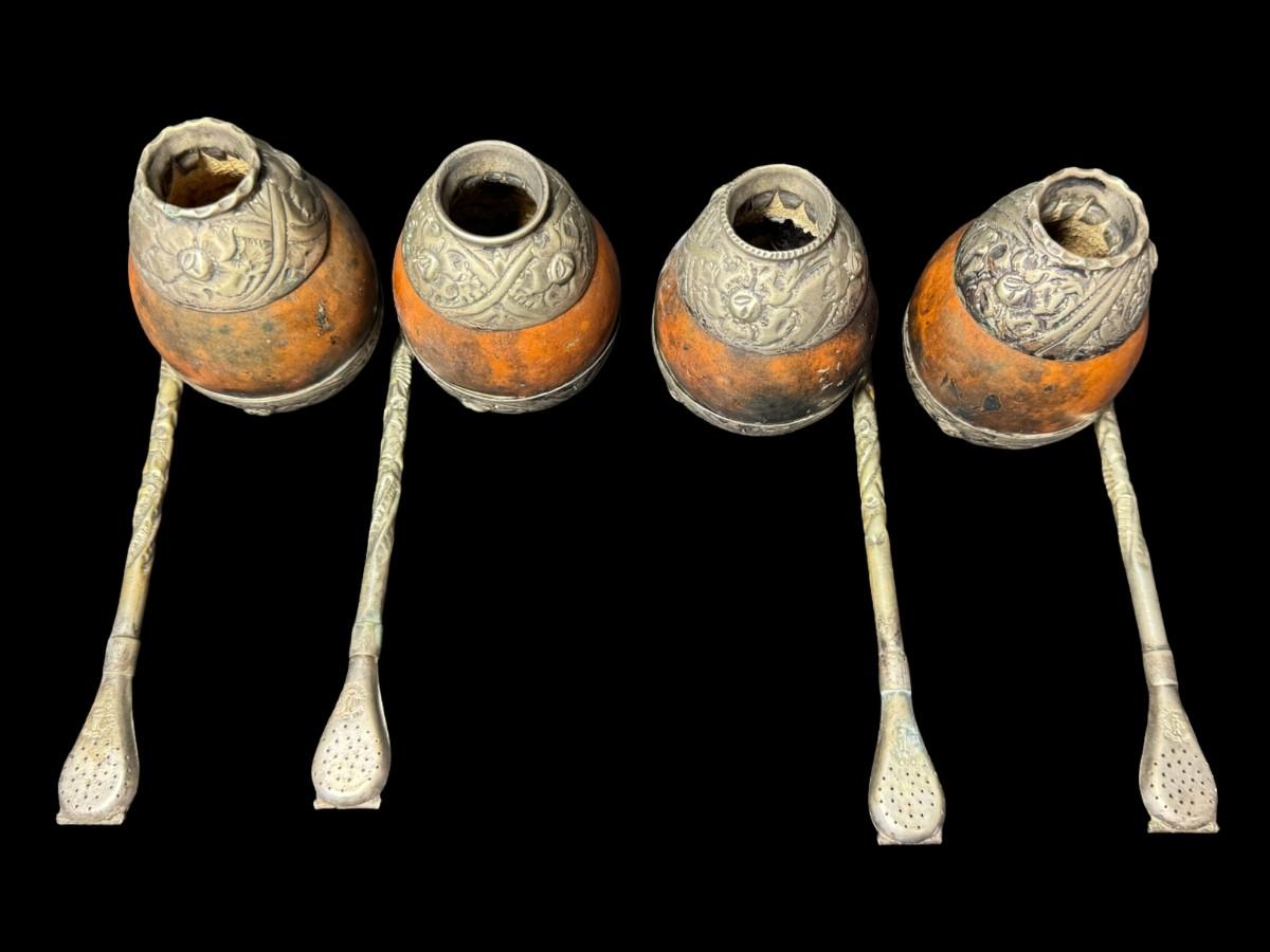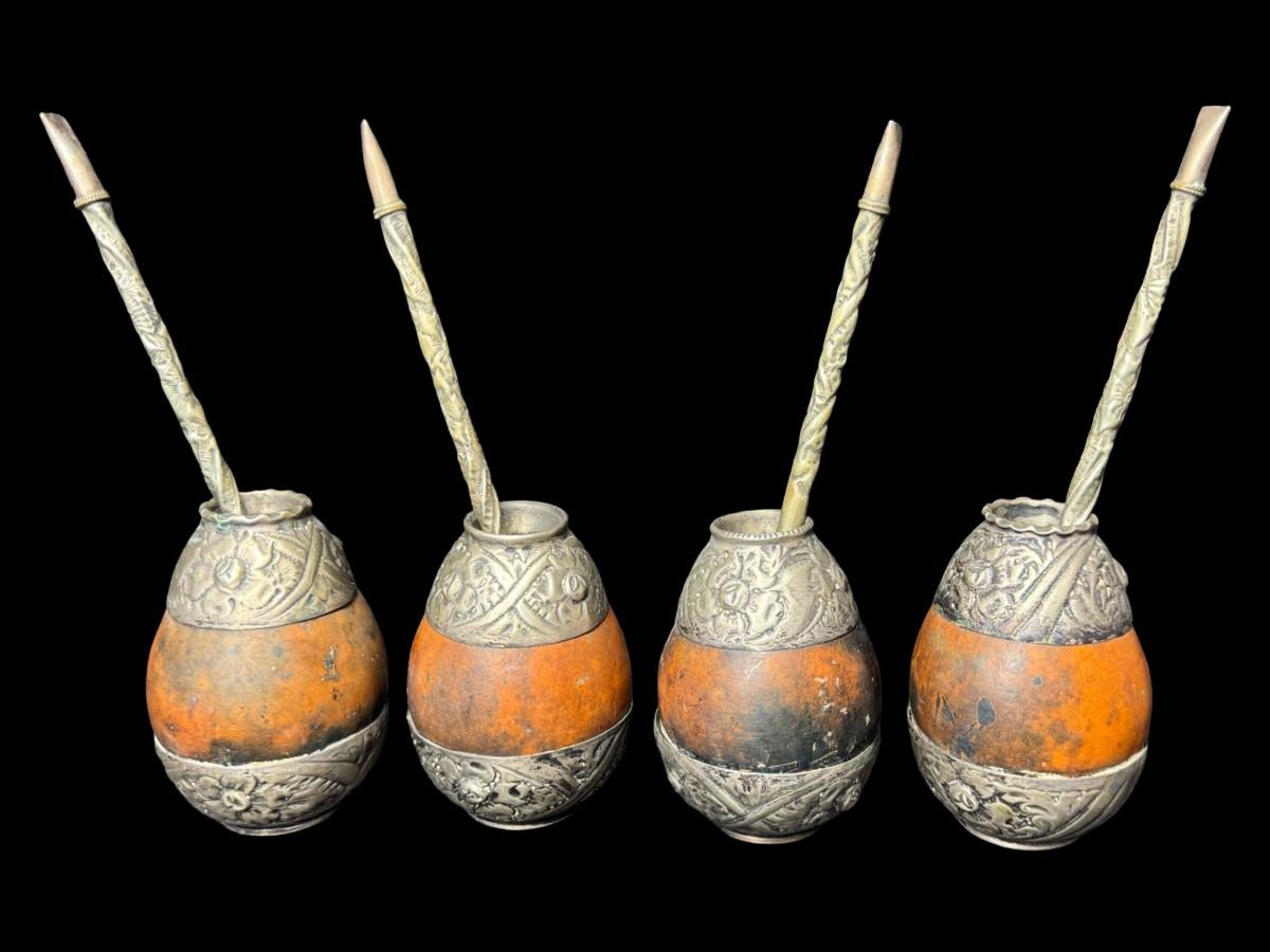 Set of four. The trim on the gourds and the straws is Alpaca. Measurement: 3.5”H (gourds, each). Pre-auction estimate: $75-$100. [BK]