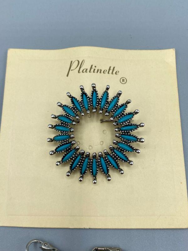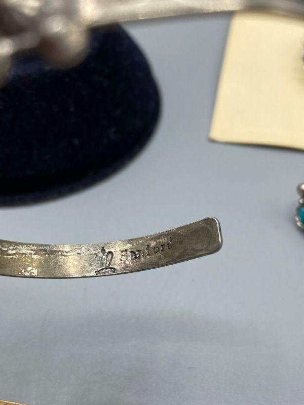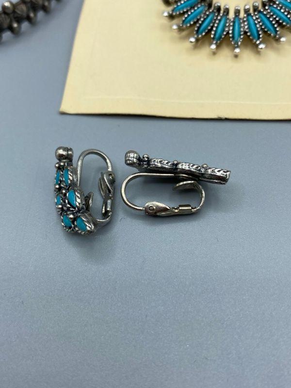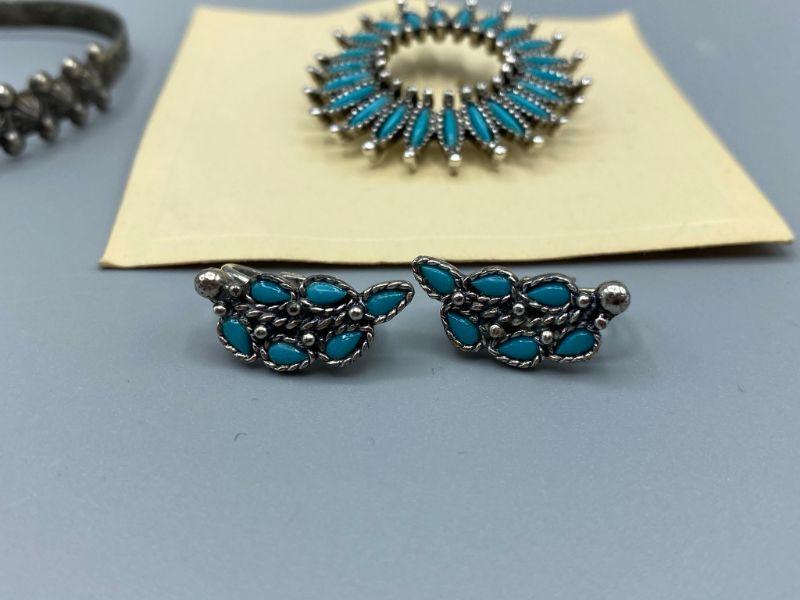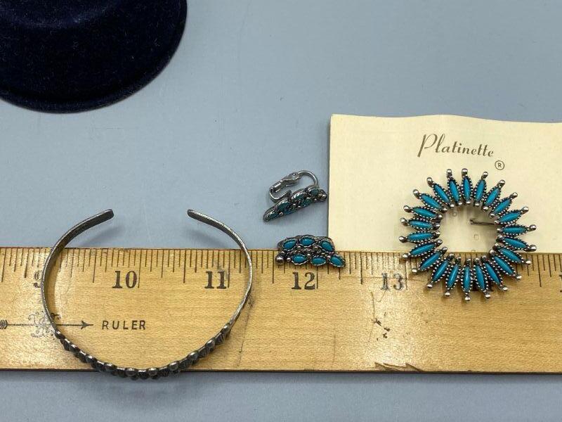 Vintage set of southwestern style jewelry. Silvertone and faux turquoise pin and clip style earrings. Cuff bracelet is slim with a stamped design. Marked Sanford inside.