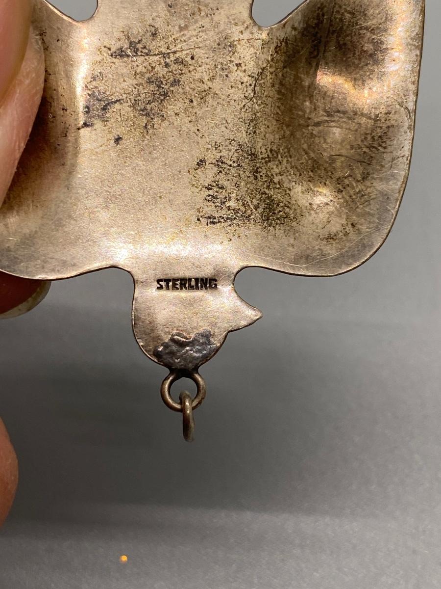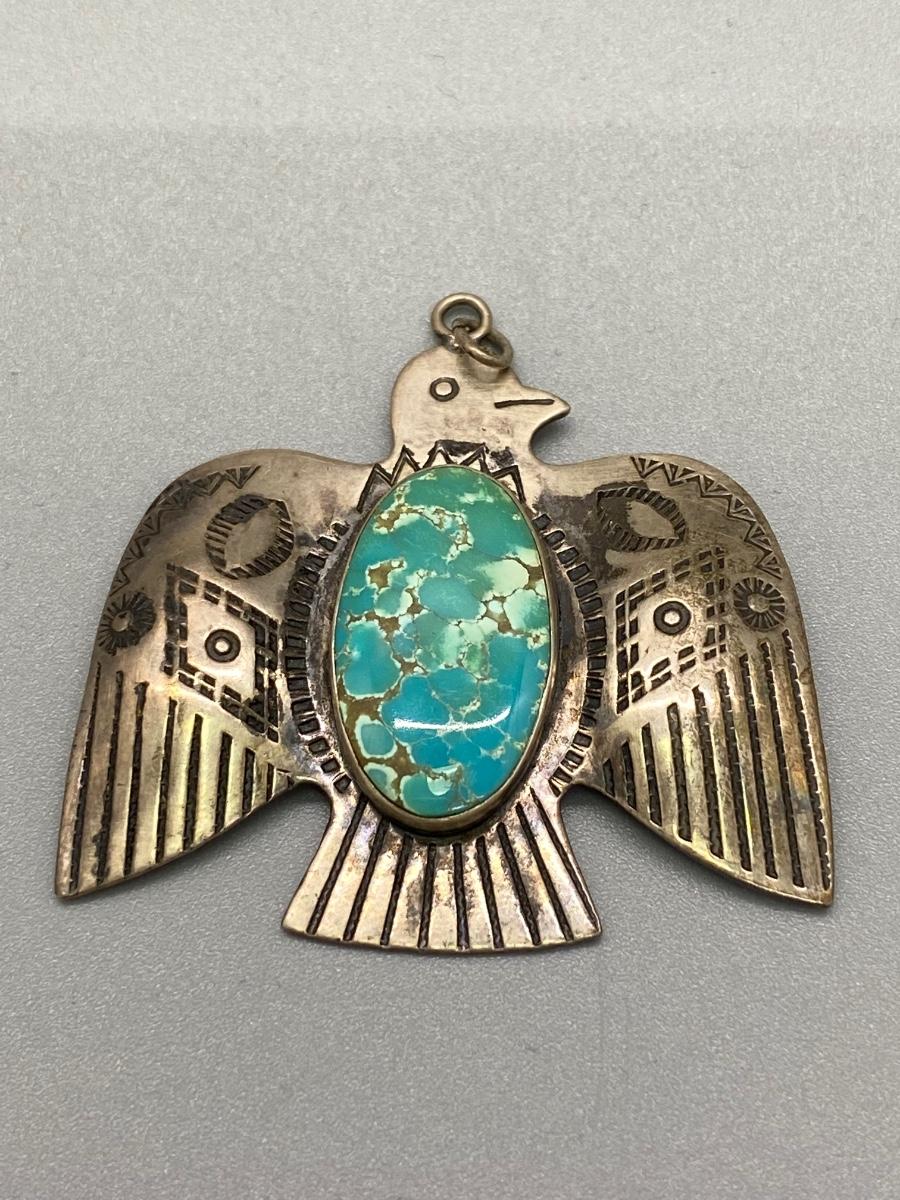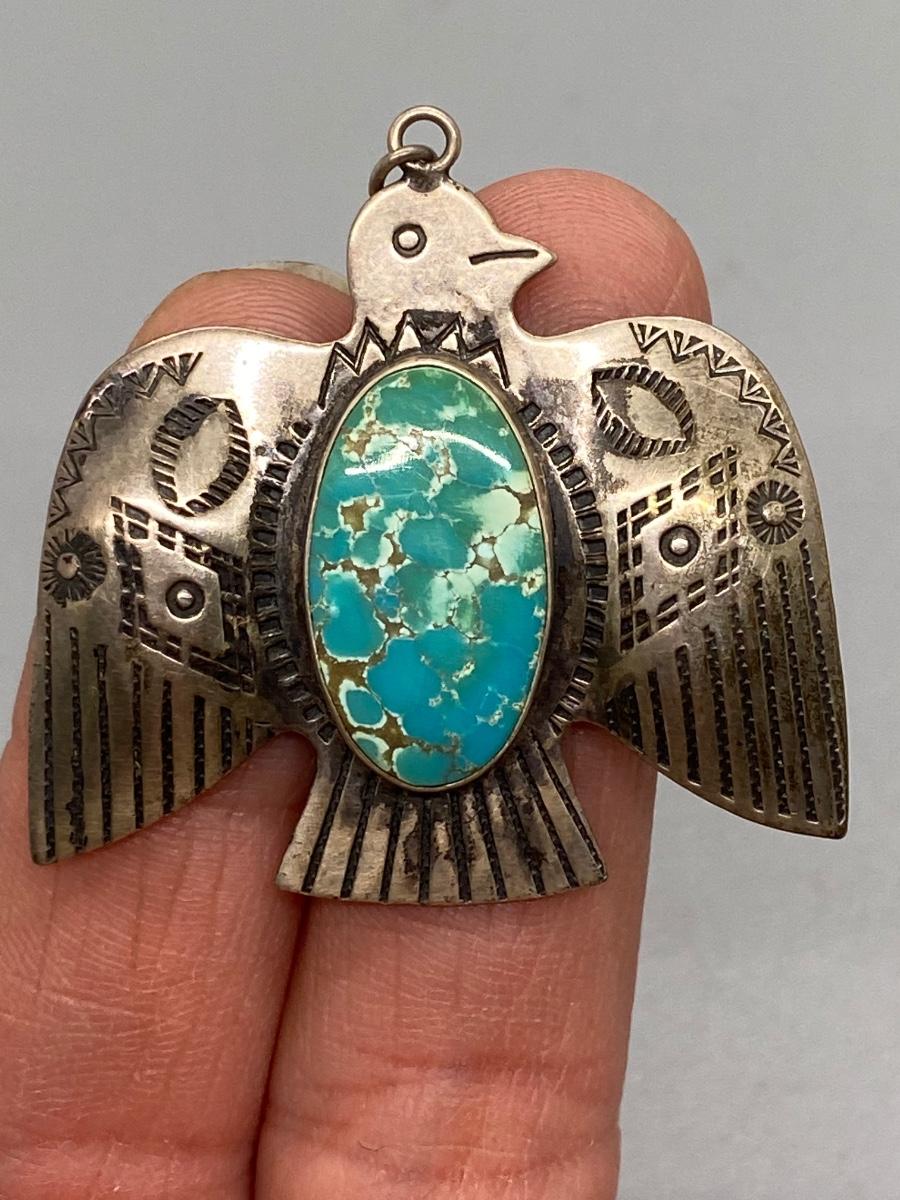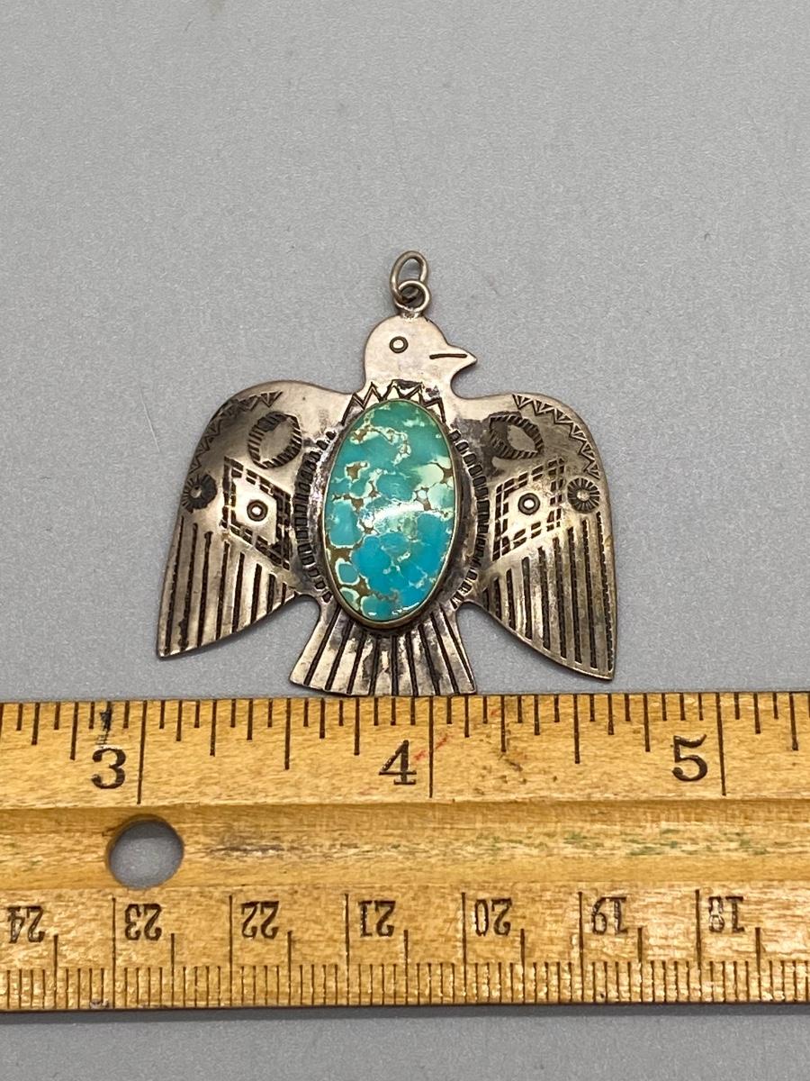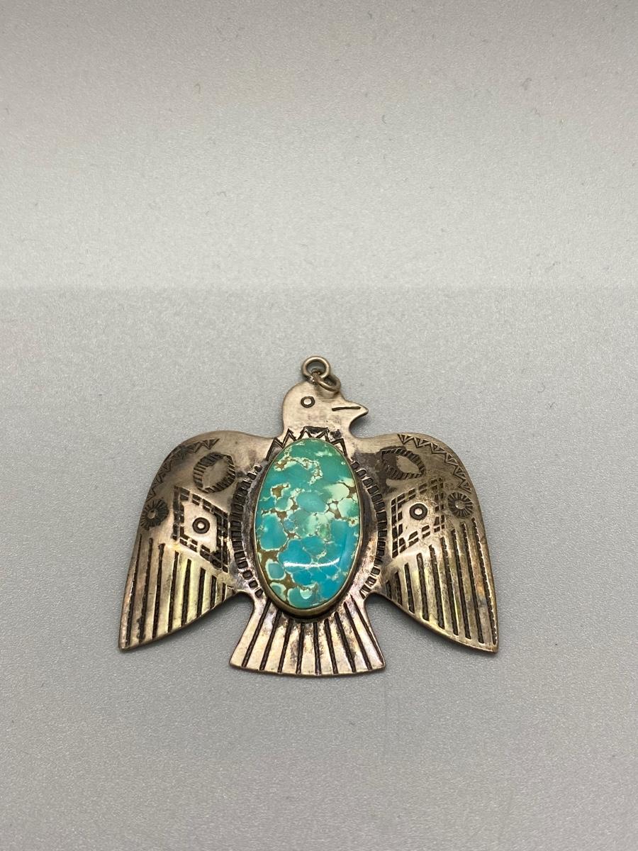 Vintage Southwestern Old Pawn Sterling Silver & Turquoise Thunderbird Bird Pendant Charm
