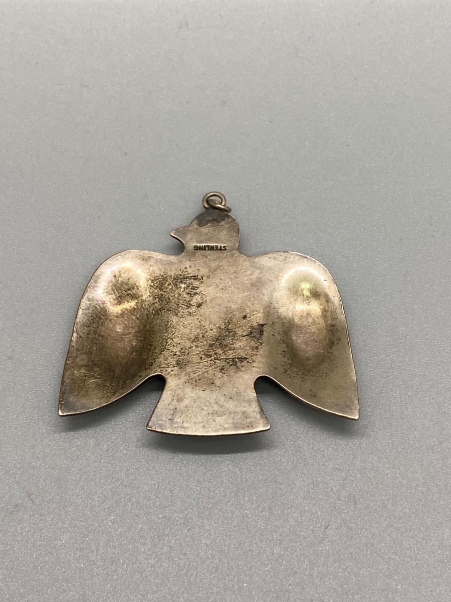 Vintage southwestern style sterling and turquoise bird pendant charm. Stamped sterling on the back. In good condition. About 2" size.