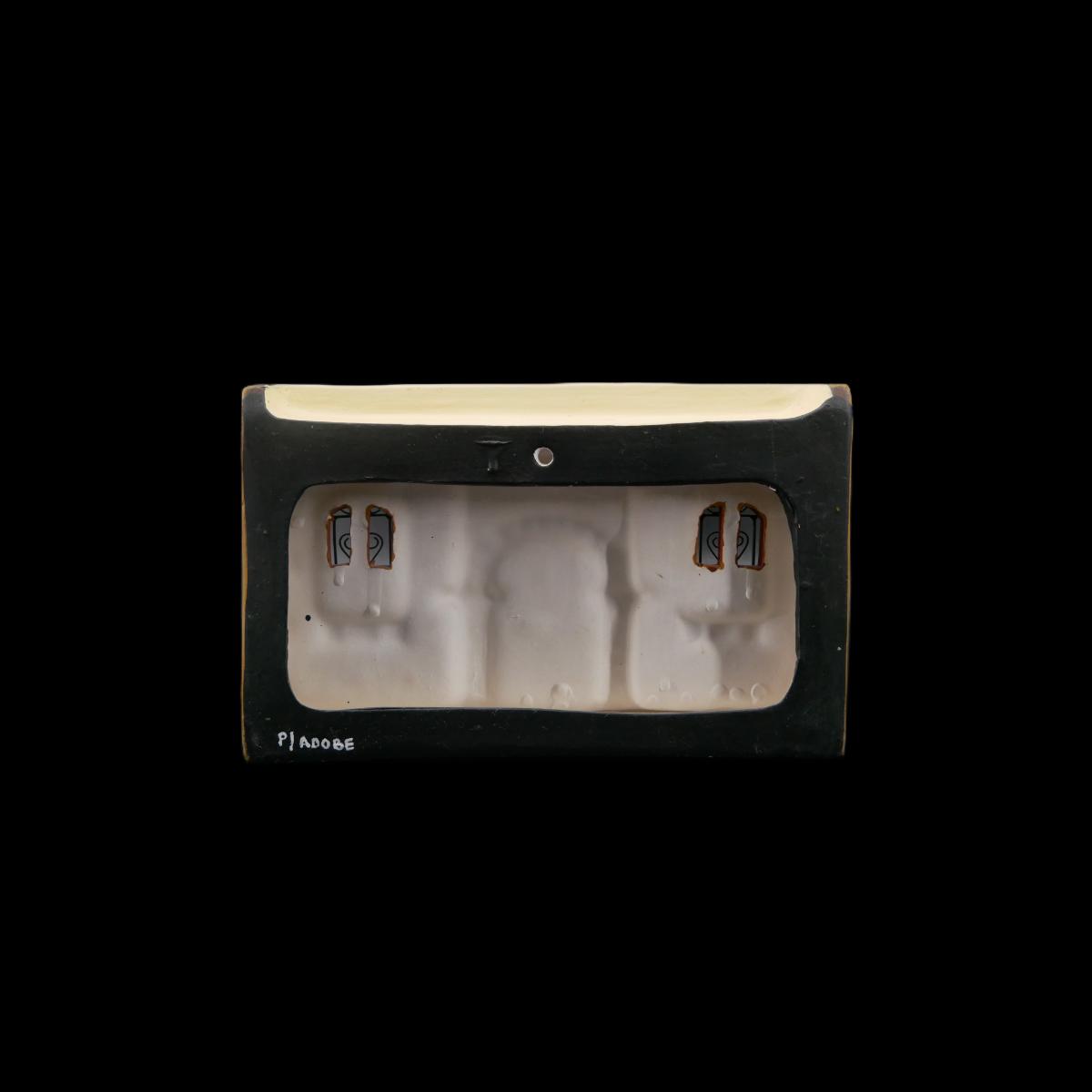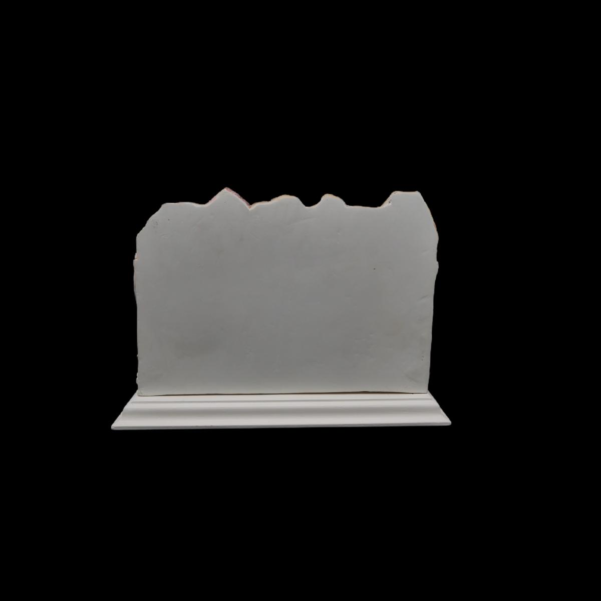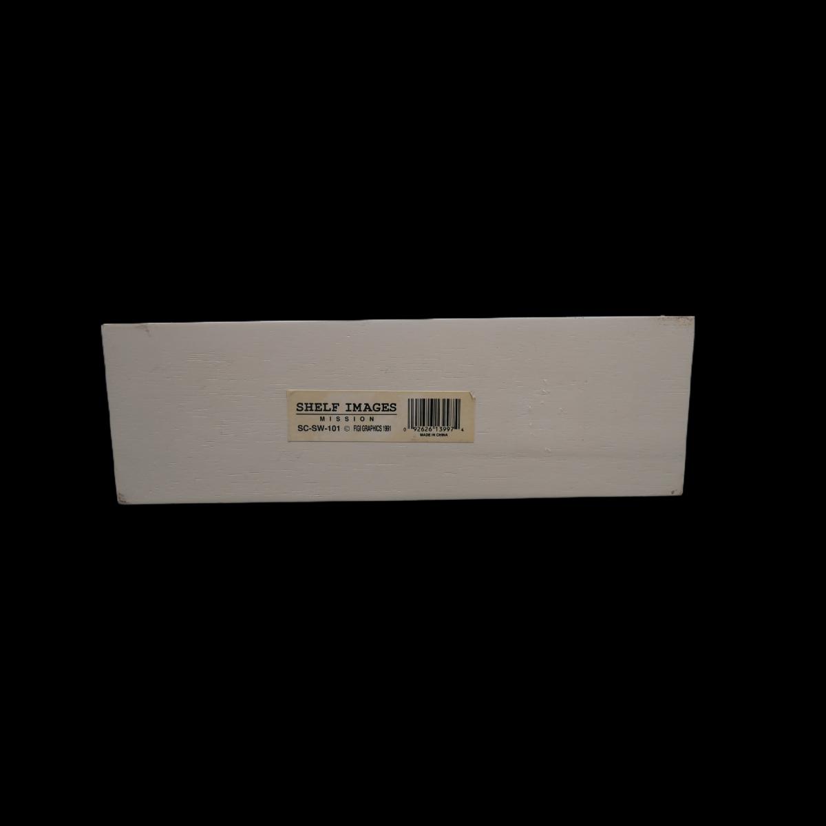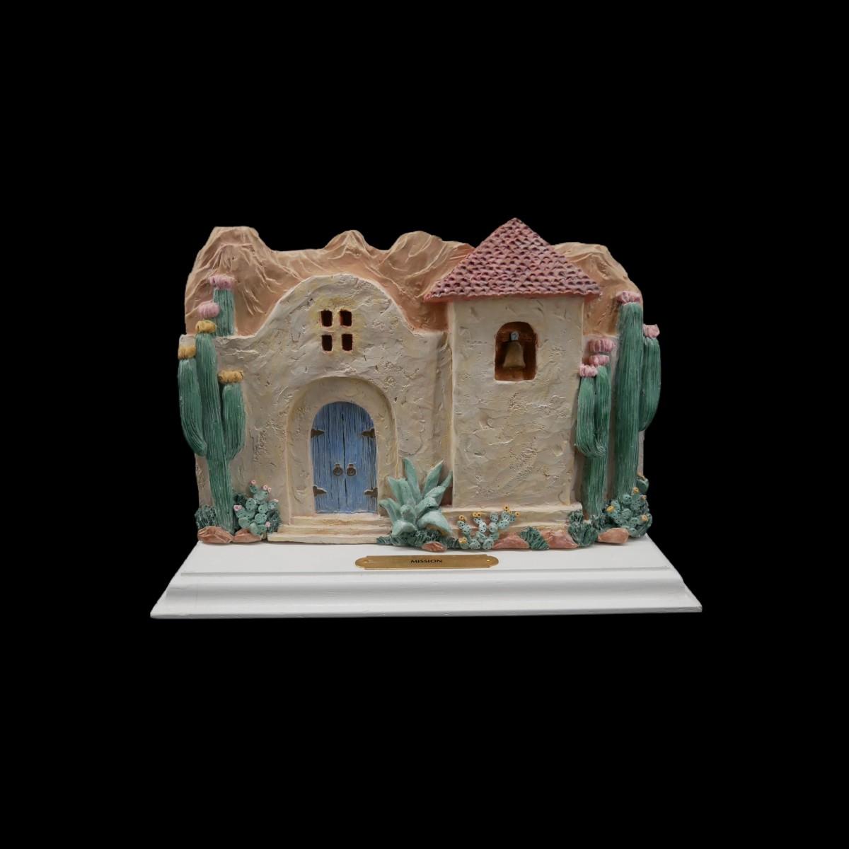 Vintage 1991 Southwestern style shelf image décor titled "Mission" by Fiji Graphics. Decorative piece depicts the front of a mission building with saguaro cacti and flowers. Measures L 11" x H 8" x W 3.5". Hand painted Adobe scene with windows and plants. Measures L 9" x H 6.5" x W 2.5". Lot weighs 5 lbs. (D46)