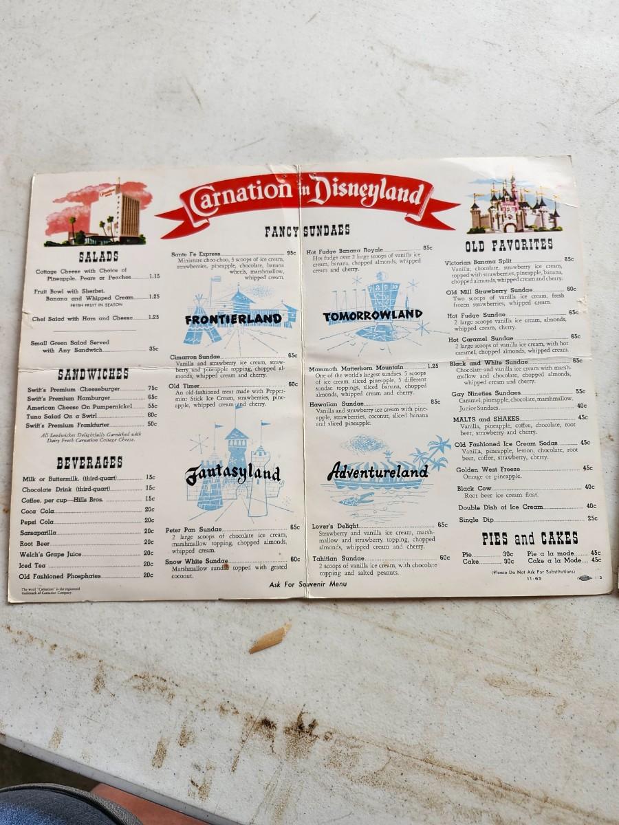 Carnation Ice Cream Parlor Menu from the Disneyland Restaurant.