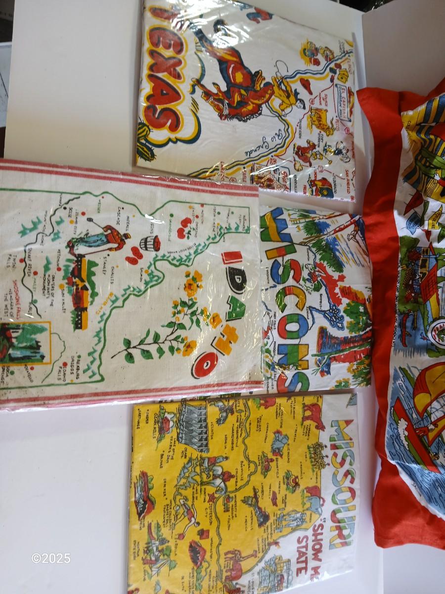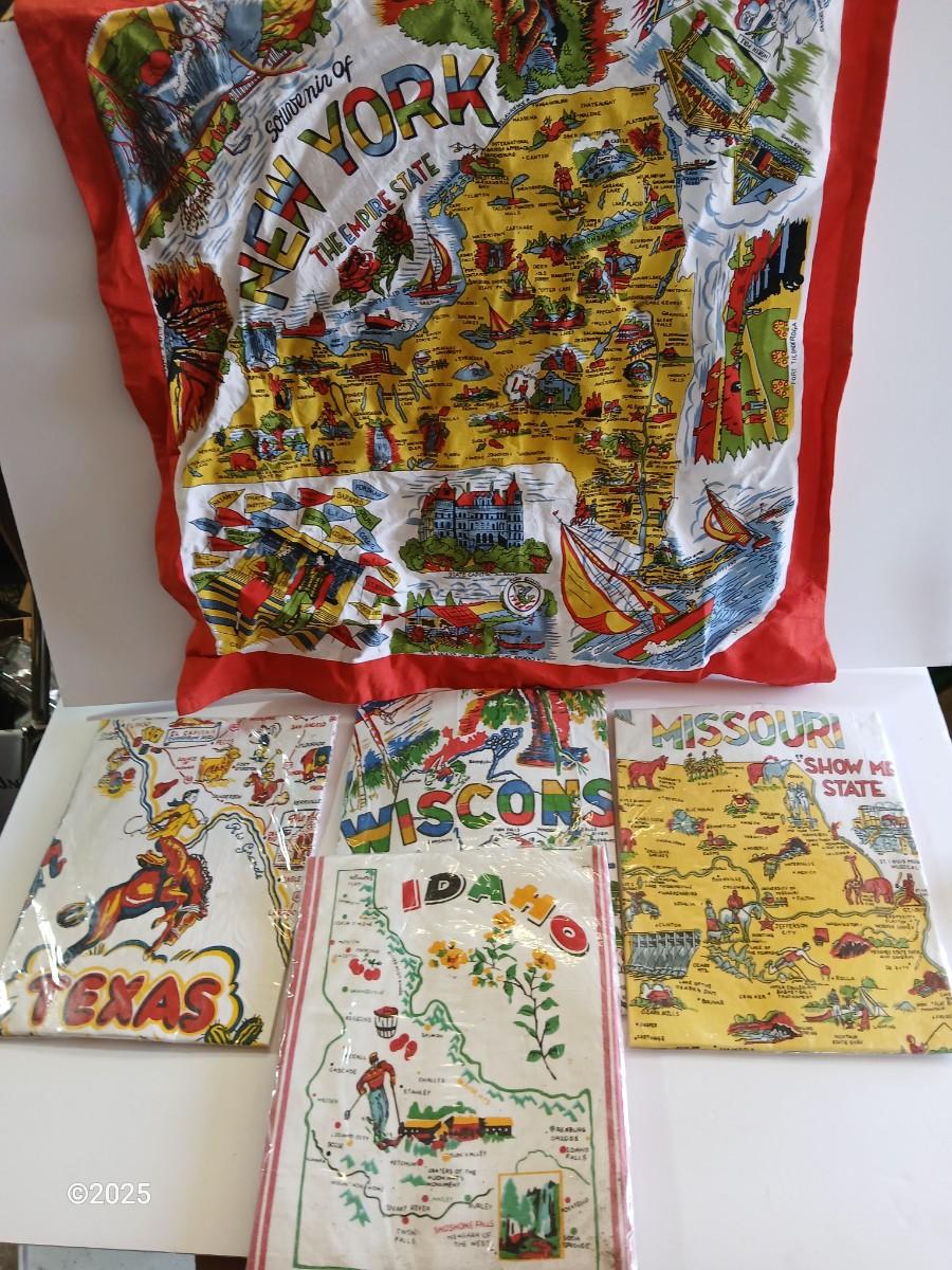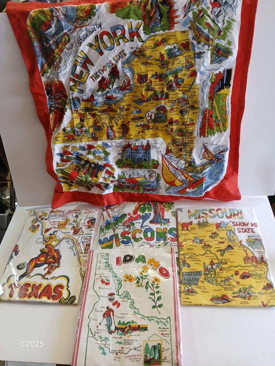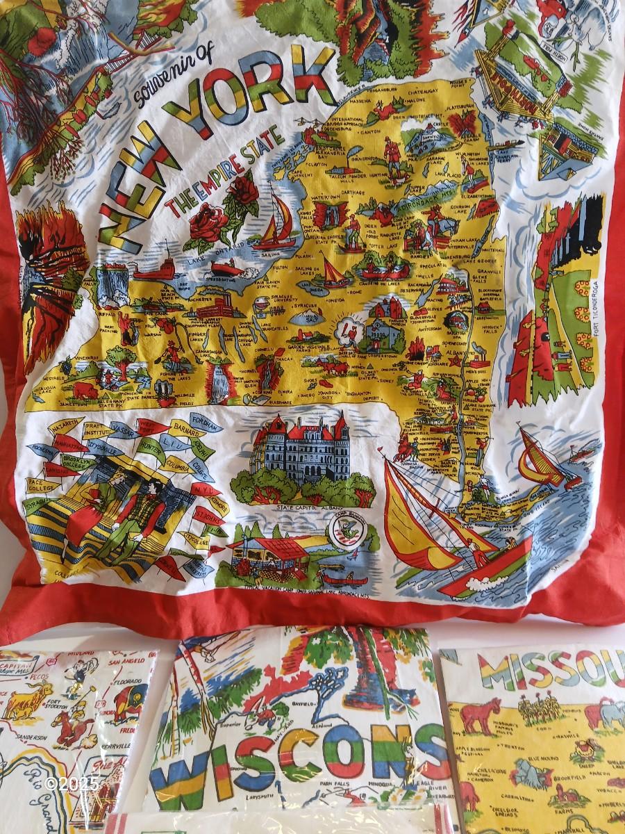 Colorful and nostalgic collection of vintage souvenir textiles featuring vibrant illustrated maps of U.S. states! Includes: