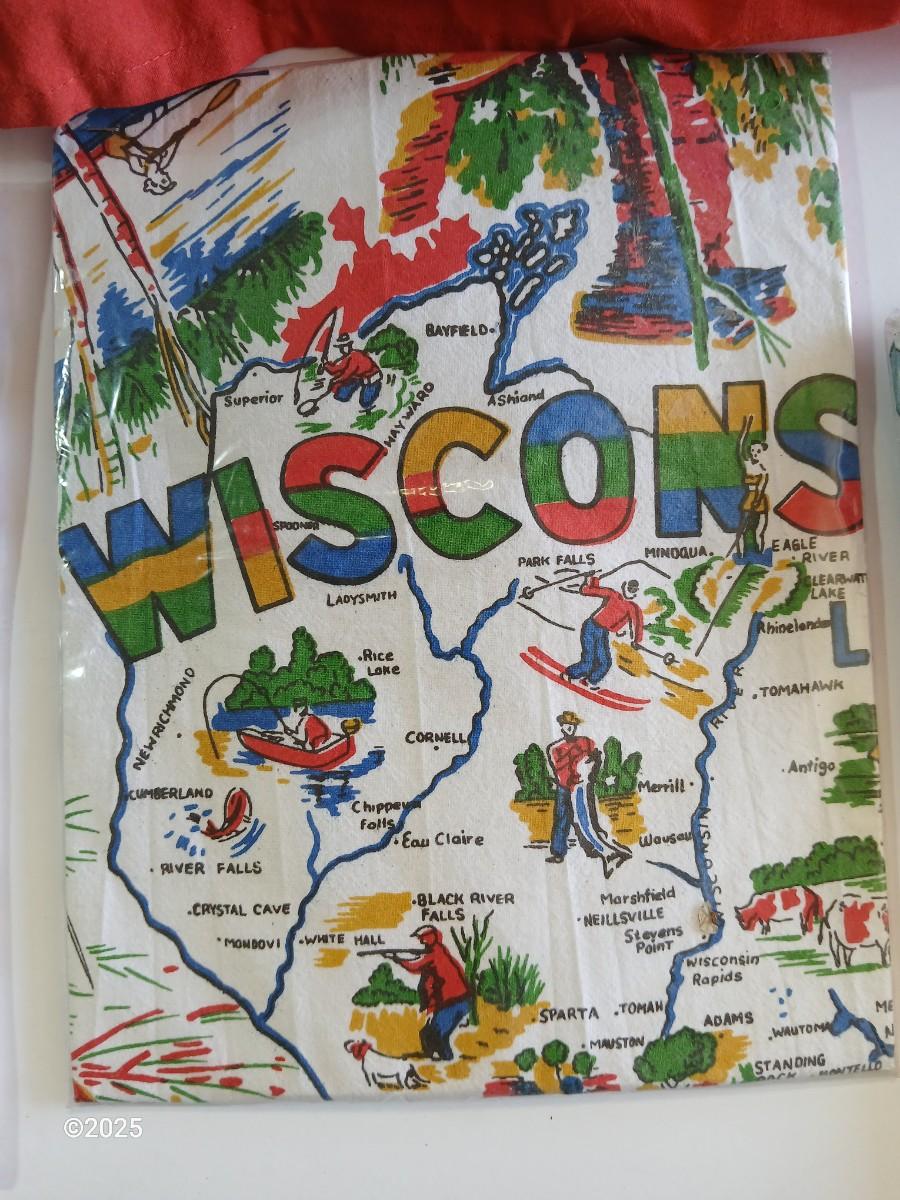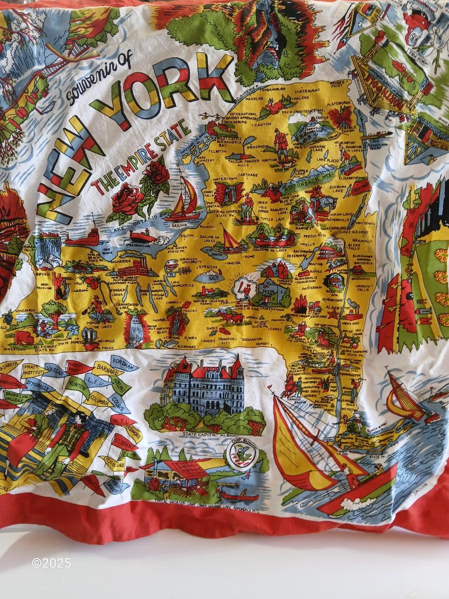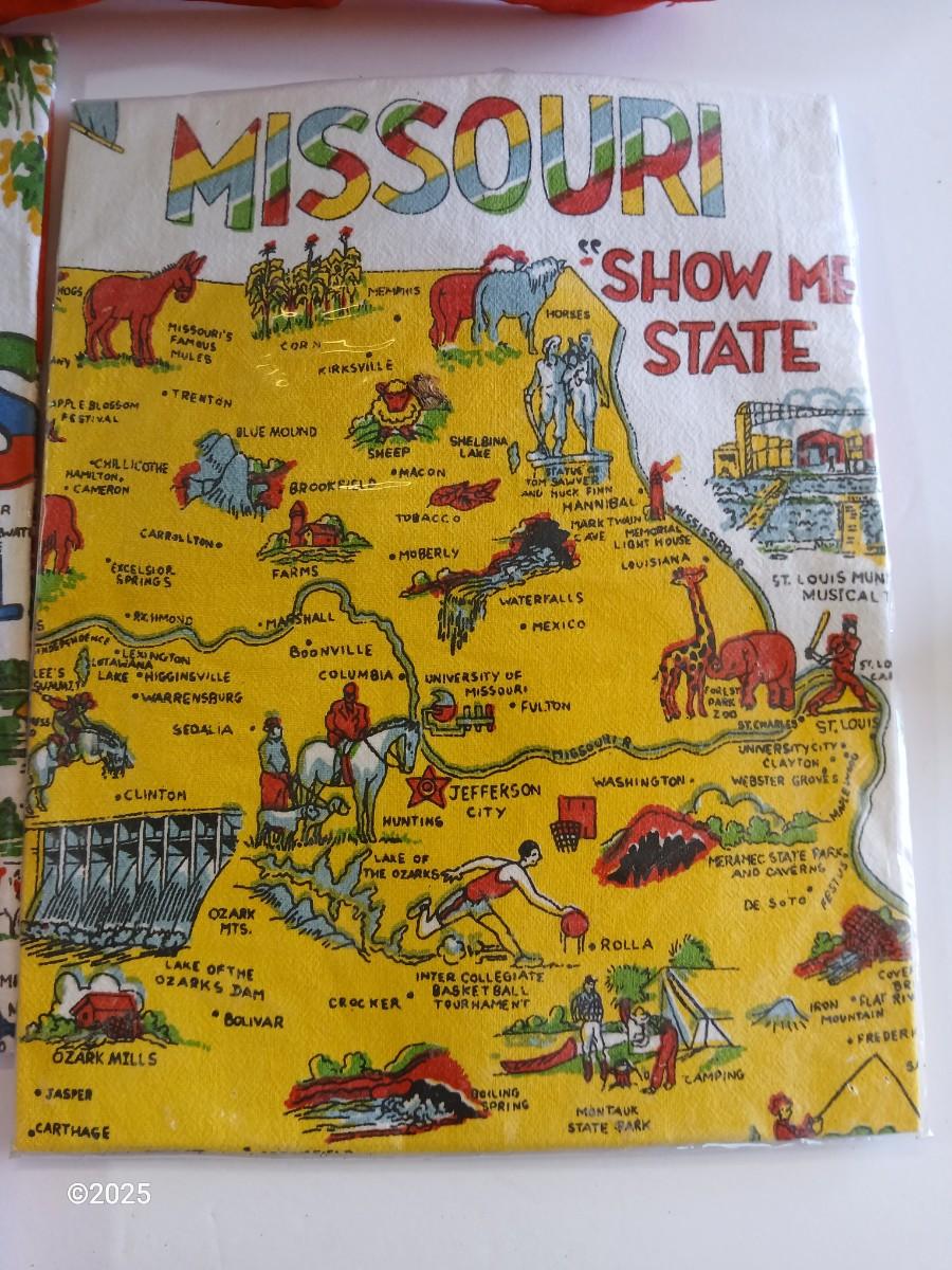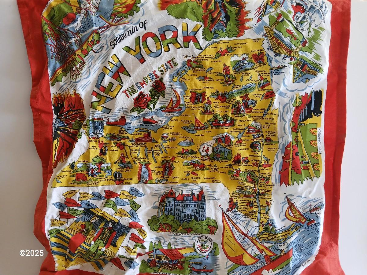 Colorful and nostalgic collection of vintage souvenir textiles featuring vibrant illustrated maps of U.S. states! Includes: