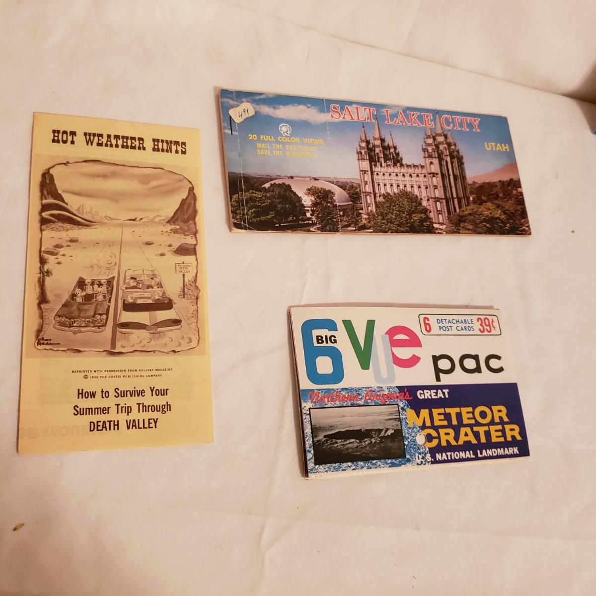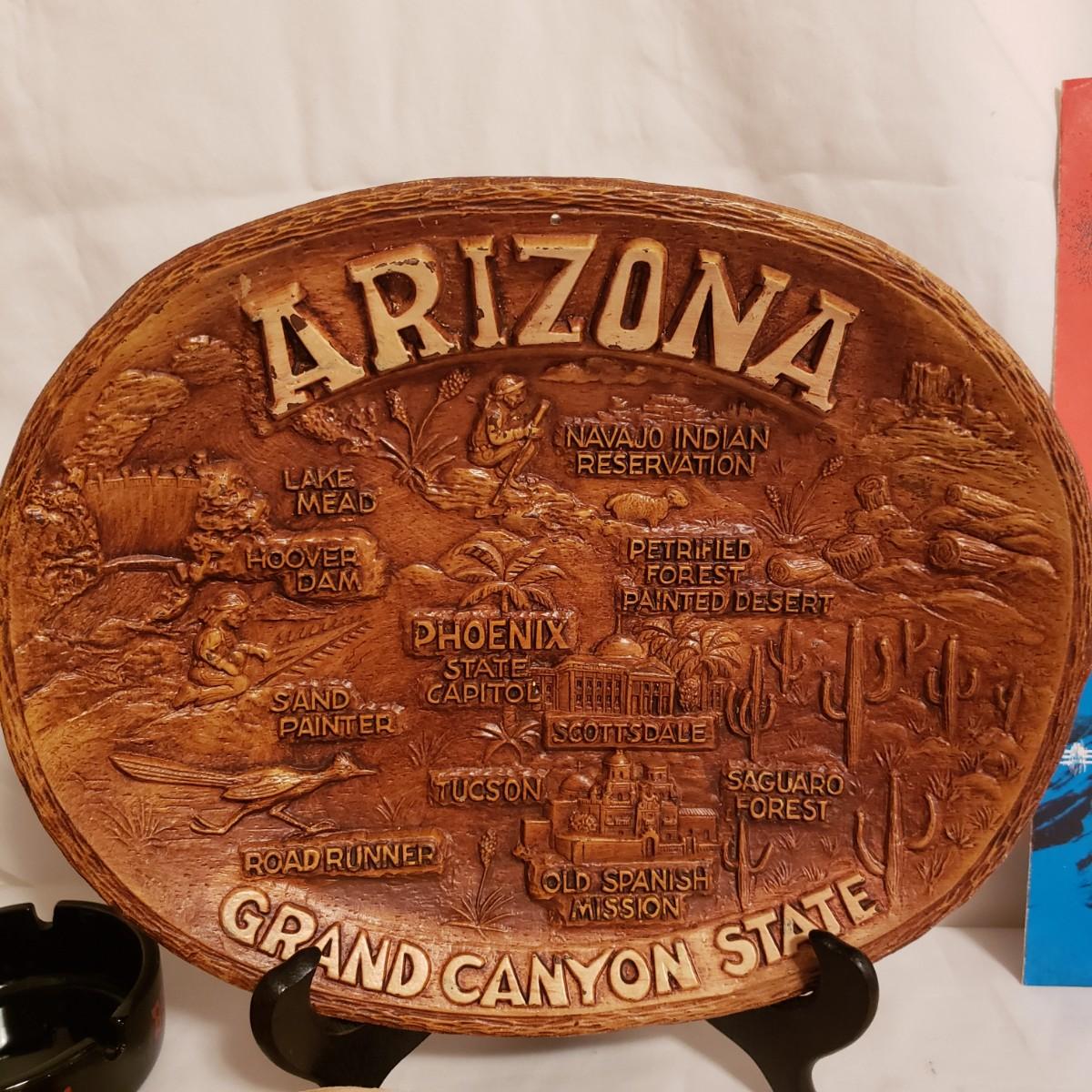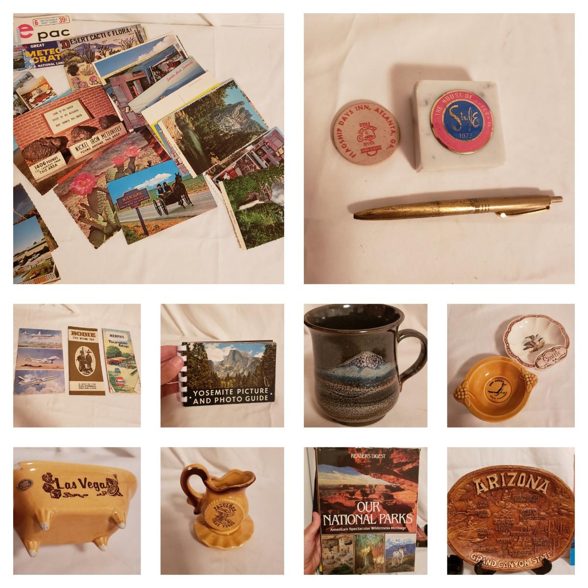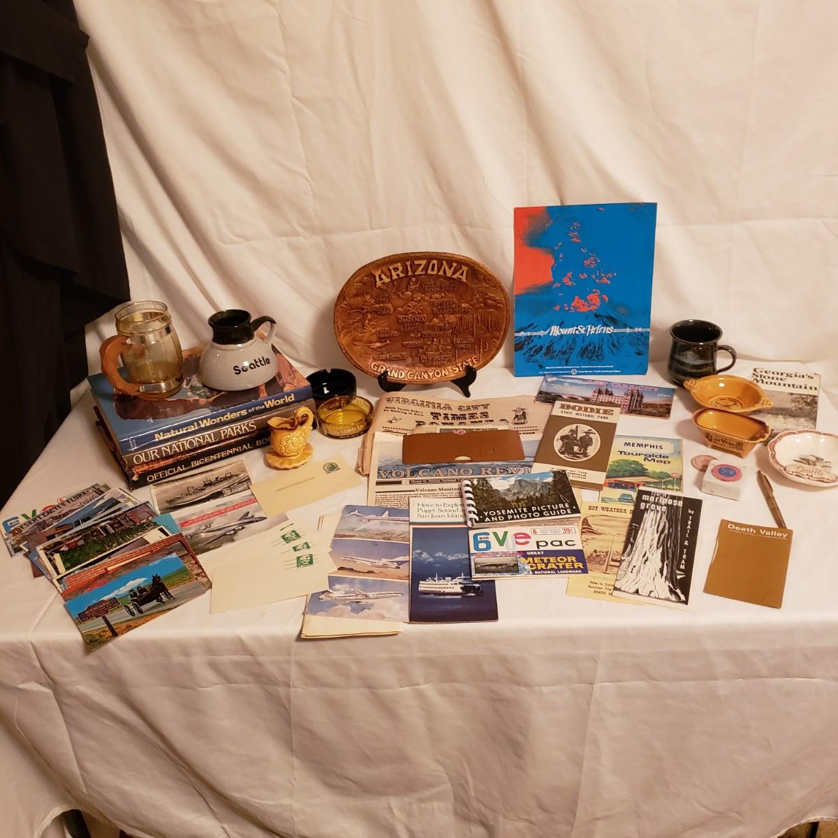 This plethora of vintage souvenirs almost feels like you don't have to travel! There are books from Readers Digest, to a stack of postcards, ashtrays from Las Vegas and don't forget the coffee mug from Mt. Saint Helen! The plastic Arizona platter measures 11" x 9". See pictures for so many details!