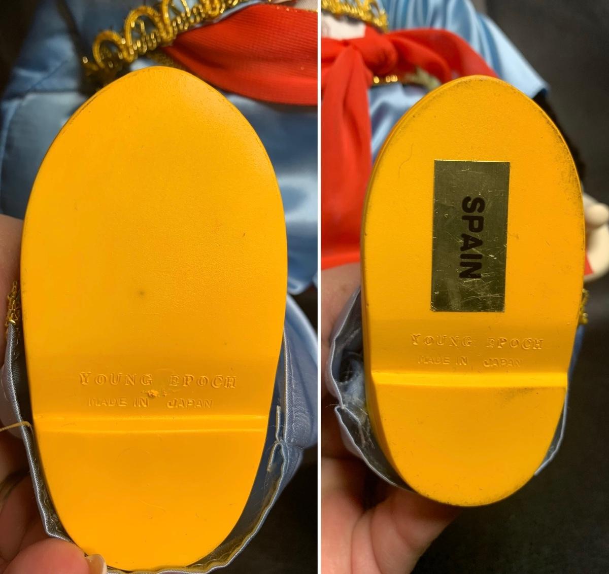 All left shoe have signed Young Epoch Imprinted on the bottom on the right is a gold sticker that says Spain