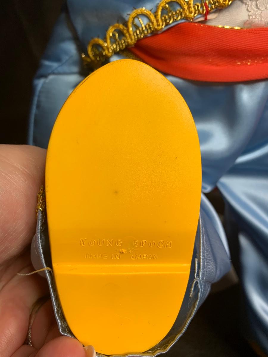 The cutie is wearing a traditional Traje de luces aka bullfighting outfit. A blue silky outfit trim in gold, red belt, red cape. Yellow and red shoes. If you closely he has a montera (bullfighter) hat that is blacks and trim in gold due to how he was stored it has flattened out but once on display I’m sure this will fluff back out. His outfit is adorable!